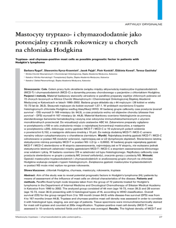 ARTYKUŁY ORYGINALNE Mastocyty tryptazo- i chymazododatnie jako potencjalny czynnik rokowniczy u chorych na chłoniaka Hodgkina Tryptase- and chymase-positive mast cells as possible prognostic factor in patients with Hodgkin’s lymphoma Barbara Rygoł1, Sławomira Kyrcz-Krzemień2, Jacek Pająk3, Piotr Konicki3, Elżbieta Kowal3, Teresa Gasińska1 1 Klinika Chorób Wewnętrznych i Chemioterapii Onkologicznej, Śląska Akademia Medyczna, Katowice 2 Katedra i Klinika Hematologii i Transplantacji Szpiku, Śląska Akademia Medyczna, Katowice 3 Katedra i Zakład Patomorfologii, Śląska Akademia Medyczna, Katowice Streszczenie: Cele. Celem pracy było określenie związku między aktywnością mastocytów tryptazododatnich (MCD-T) i chymazododatnich (MCD-C) a dynamiką procesu chorobowego u pacjentów z chłoniakiem Hodgkina. Pacjenci i metody. Materiał badawczy stanowiły utrwalone w parafinie preparaty węzłów chłonnych pobrane od 72 chorych leczonych w Klinice Chorób Wewnętrznych i Chemioterapii Onkologicznej Śląskiej Akademii Medycznej w Katowicach w latach 1990–2002. Badana grupa składała się z 44 mężczyzn i 28 kobiet w wieku 15–73 lat (śr. 36,5). Stosunek mężczyzn do kobiet wynosił 1,57:1. W próbkach wyróżniono 5 typów histologicznych chłoniaka Hodgkina według klasyfikacji WHO. W badanej grupie całkowity czas przeżycia (overall survival – OS) wynosił 3–169 miesięcy (śr. 64,5), a czas przeżycia wolny od objawów choroby (disease free survival – DFS) wynosił 4–167 miesięcy (śr. 44,8). Materiał tkankowy oceniano histologicznie za pomocą standardowego barwienia hematoksyliną i eozyną oraz odczynów immunohistochemicznych z użyciem monoklonalnych przeciwciał. Do wizualizacji użyto zestawów ABC kit. Zabarwione preparaty oglądano w powiększeniu x100 w celu znalezienia miejsc o największej koncentracji mastocytów, a następnie w powiększeniu x200, dokonując oceny gęstości MCD-T i MCD-C w 10 wybranych polach widzenia o powierzchni 0,152, a następnie obliczano średnią z 10 pól. Za reakcję dodatnią MCD-T i MCD-C uznano wyraźny odczyn cytoplazmatyczny o charakterze ziarnistym. Wyniki. Największą średnią gęstość MCD-T i MCD-C odnotowano w postaci NS (nodulor sclerosis), najmniejszą zaś w LD (lymphocyte depleted). Stwierdzono istotną statystycznie różnicę pomiędzy MCD-T w postaci NS i LD (p = 0,0002). W badanej grupie największą gęstość MCD-T i MCD-C stwierdzono w III stopniu zaawansowania, najmniejszą zaś w IV stopniu, nie wykazano jednak statystycznie istotnych zależności między gęstościami MCD-T i MCD-C a stopniem zaawansowania klinicznego oraz wiekiem i płcią. W badaniu oceniano OS w zależności od typu histologicznego. Najdłuższy całkowity czas przeżycia stwierdzono w grupie z postacią MC (mixed cellularity), znacznie gorszy z postacią NS. Wnioski. Gęstość mastocytów tryptazododatnich i chymazododatnich w analizowanej grupie chorych na chłoniaka Hodgkina wykazuje związek z typem histologicznym. Zwiększona gęstość mastocytów tryptazododatnich w postaci NS może mieć wpływ na gorsze rokowanie. Słowa kluczowe: chłoniak Hodgkina, chymaza, mastocyty, rokowanie, tryptaza Abstract: Aim of the study was to reveal potential prognostic factors in Hodgkin’s lymphoma (HL) patients by means of assessment of the influence of mast cells on clinical characteristics of the disease. Patients and methods. Paraffin-fixed lymph node biopsies taken from the group of 72 patients treated for Hodgkin’s lymphoma in the Department of Internal Medicine and Oncological Chemotherapy of Silesian Medical Academy in Katowice from 1990 to 2002. The analyzed group consisted of 44 men (age 16-73, mean 39.2) and 28 women (age 15-73, mean 36.5) presenting with 5 histological types of HL according to WHO classification. Overall survival (OS) for the group ranged from 3 to 169 month (mean 64.5) while disease-free survival (DFS) was from 4 to 167 months (mean 44.8). Tryptase and chymase-positive mast cell density was assessed in order to correlate it with histological type, staging, sex and age of patients. Tissue specimens were immunohistochemically stained for mast cell tryptase and counted at 200x magnification. Tryptase-positive mast cell density (MCD-T) was assessed in 10 randomly selected fields and the score was averaged. Results. The highest density of MCD-T and Mastocyty tryptazo- i chymazododatnie jako potencjalny... 27 ARTYKUŁY ORYGINALNE MCD-C was observed in NS type while the lowest characterized LD. A statistically significant difference in MCD-T was noted between NS and LD (p=0.0002). Despite the fact that increased density of MCD-T and MCD-T was observed in stage III and the lowest in stage IV of the disease, no correlation was found between MCD and stage, sex or age. Overall survival was assessed in correlation with histological type and showed to be longest in MC and worst in NS type. Conclusions. Tryptase and chymase-positive mast cell density is related to histological type of Hodgkin’s lymphoma. Increased mast cell density correlates with worse prognosis in patients with HL. Keywords: chymase, Hodgkin’s lymphoma, mast cells, prognosis, tryptase WPROWADZENIE Pierwsze opisy chłoniaka Hodgkina, nazywanego do niedawna ziarnicą złośliwą, sporządził w 1832 roku. Thomas Hodgkin, który na podstawie obrazu sekcyjnego rozpoznał u 7 chorych uogólnioną limfadenopatię i splenomegalię, a następnie przedstawił hipotezę nowotworowego charakteru tej choroby [1]. W 1865 roku Wilks, a w 1878 Greenfield opisali zmiany histologiczne, zwracając szczególną uwagę na zajęcie węzłów chłonnych przez proces o charakterze przewlekłego odczynu zapalnego z towarzyszącym włóknieniem i obecnością licznych komórek wielojądrzastych. Typowe cechy komórek określili w roku 1889 Sternberg i Reed w roku 1902; opisali oni wielkość oraz wygląd wielopłatowych jąder komórkowych i prominentnych
