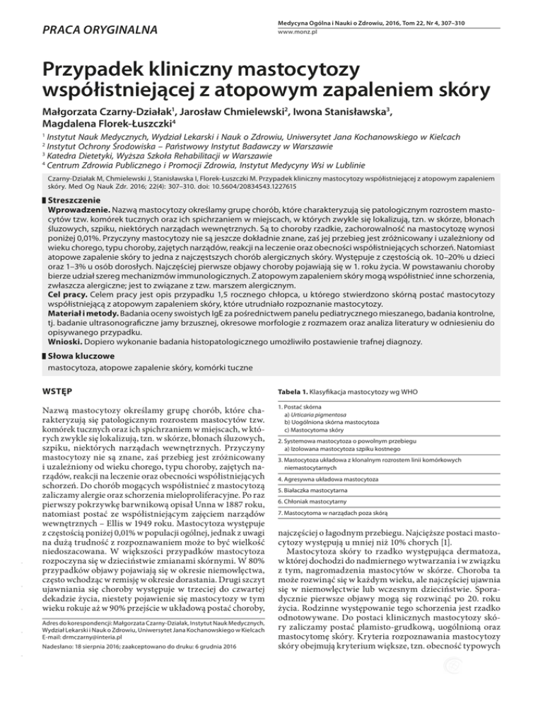 PRACA ORYGINALNA Medycyna Ogólna i Nauki o Zdrowiu, 2016, Tom 22, Nr 4, 307–310 www.monz.pl Przypadek kliniczny mastocytozy współistniejącej z atopowymzapaleniem skóry Małgorzata Czarny-Działak1, Jarosław Chmielewski2, Iwona Stanisławska3, Magdalena Florek-Łuszczki4 Instytut Nauk Medycznych, Wydział Lekarski i Nauk o Zdrowiu, Uniwersytet Jana Kochanowskiego w Kielcach Instytut Ochrony Środowiska – Państwowy Instytut Badawczy w Warszawie 3 Katedra Dietetyki, Wyższa Szkoła Rehabilitacji w Warszawie 4 Centrum Zdrowia Publicznego i Promocji Zdrowia, Instytut Medycyny Wsi w Lublinie 1 2 Czarny-Działak M, Chmielewski J, Stanisławska I, Florek-Łuszczki M. Przypadek kliniczny mastocytozy współistniejącej z atopowym zapaleniem skóry. Med Og Nauk Zdr. 2016; 22(4): 307–310. doi: 10.5604/20834543.1227615 Streszczenie Wprowadzenie. Nazwą mastocytozy określamy grupę chorób, które charakteryzują się patologicznym rozrostem mastocytów tzw. komórek tucznych oraz ich spichrzaniem w miejscach, w których zwykle się lokalizują, tzn. w skórze, błonach śluzowych, szpiku, niektórych narządach wewnętrznych. Są to choroby rzadkie, zachorowalność na mastocytozę wynosi poniżej 0,01%. Przyczyny mastocytozy nie są jeszcze dokładnie znane, zaś jej przebieg jest zróżnicowany i uzależniony od wieku chorego, typu choroby, zajętych narządów, reakcji na leczenie oraz obecności współistniejących schorzeń. Natomiast atopowe zapalenie skóry to jedna z najczęstszych chorób alergicznych skóry. Występuje z częstością ok. 10–20% u dzieci oraz 1–3% u osób dorosłych. Najczęściej pierwsze objawy choroby pojawiają się w 1. roku życia. W powstawaniu choroby bierze udział szereg mechanizmów immunologicznych. Z atopowym zapaleniem skóry mogą współistnieć inne schorzenia, zwłaszcza alergiczne; jest to związane z tzw. marszem alergicznym. Cel pracy. Celem pracy jest opis przypadku 1,5 rocznego chłopca, u którego stwierdzono skórną postać mastocytozy współistniejącą z atopowym zapaleniem skóry, które utrudniało rozpoznanie mastocytozy. Materiał i metody. Badania oceny swoistych IgE za pośrednictwem panelu pediatrycznego mieszanego, badania kontrolne, tj. badanie ultrasonograficzne jamy brzusznej, okresowe morfologie z rozmazem oraz analiza literatury w odniesieniu do opisywanego przypadku. Wnioski. Dopiero wykonanie badania histopatologicznego umożliwiło postawienie trafnej diagnozy. Słowa kluczowe - - - - mastocytoza, atopowe zapalenie skóry, komórki tuczne WSTĘP Tabela 1. Klasyfikacja mastocytozy wg WHO Nazwą mastocytozy określamy grupę chorób, które charakteryzują się patologicznym rozrostem mastocytów tzw. komórek tucznych oraz ich spichrzaniem w miejscach, w których zwykle się lokalizują, tzn. w skórze, błonach śluzowych, szpiku, niektórych narządach wewnętrznych. Przyczyny mastocytozy nie są znane, zaś przebieg jest zróżnicowany i uzależniony od wieku chorego, typu choroby, zajętych narządów, reakcji na leczenie oraz obecności współistniejących schorzeń. Do chorób mogących współistnieć z mastocytozą zaliczamy alergie oraz schorzenia mieloproliferacyjne. Po raz pierwszy pokrzywkę barwnikową opisał Unna w 1887 roku, natomiast postać ze współistniejącym zajęciem narządów wewnętrznych – Ellis w 1949 roku. Mastocytoza występuje z częstością poniżej 0,01% w populacji ogólnej, jednak z uwagi na dużą trudność z rozpoznawaniem może to być wielkość niedoszacowana. W większości przypadków mastocytoza rozpoczyna się w dzieciństwie zmianami skórnymi. W 80% przypadków objawy pojawiają się w okresie niemowlęctwa, często wchodząc w remisję w okresie dorastania. Drugi szczyt ujawniania się choroby występuje w trzeciej do czwartej dekadzie życia, niestety pojawienie się mastocytozy w tym wieku rokuje aż w 90% przejście w układową postać choroby, 1. Postać skórna a) Urticaria pigmentosa b) Uogólniona skórna mastocytoza c) Mastocytoma skóry Adres do korespondencji: Małgorzata Czarny-Działak, Instytut Nauk Medycznych, Wydział Lekarski i Nauk o Zdrowiu, Uniwersytet Jana Kochanowskiego w Kielcach E-mail: [email protected] - Nadesłano: 18 sierpnia 2016; zaakceptowano do druku: 6 grudnia 2016 2. Systemowa mastocytoza o powolnym przebiegu a) Izolowana mastocytoza szpiku kostnego 3. Mastocytoza układowa z klonalnym rozrostem linii komórkowych niemastocytarnych 4. Agresywna układowa mastocytoza 5. Białaczka mastocytarna 6. Chłoniak mastocytarny 7. Mastocytoma w narządach poza skórą najczęściej o łagodnym przebiegu. Najcięższe postaci mastocytozy występują u mniej niż 10% chorych [1]. Mastocytoza skóry to rzadko występująca dermatoza, w której dochodzi do nadmiernego wytwarzania i w związku z tym, nagromadzenia mastocytów w skórze. Choroba ta może rozwinąć się w każdym wieku, ale najczęściej ujawnia się w niemowlęctwie lub wczesnym dzieciństwie. Sporadycznie pierwsze objawy mogą się rozwinąć po 20. roku życia. Rodzinne występowanie tego schorzenia jest rzadko odnotowywane. Do postaci klinicznych mastocytozy skóry zaliczamy postać plamisto-grudkową, uogólnioną oraz mastocytomę skóry. Kryteria rozpoznawania mastocytozy skóry obejmują kryterium większe, tzn. obecność typowych 308 - - - - - Medycyna Ogólna i Nauki o Zdrowiu, 2016, Tom 22, Nr 4 Małgorzata Czarny-Działak, Jarosław Chmielewski, Iwona Stanisławska, Magdalena Florek-Łuszczki. Przypadek kliniczny mastocytozy współistniejącej z atopowym… zmian skórnych z dodatnim objawem Dariera, oraz kryteria mniejsze: stwierdzenie w badaniu histologicznym i immunohistochemicznym monomorficznego nacieku z mastocytów oraz stwierdzenie tzw. mutacji KIT w kodonie 816 w mastocytach pobranych ze skóry zmienionej chorobowo. Najważniejsze jest spełnienie kryterium większego [1]. Objaw Dariera polega na pojawieniu się: świądu, rumienia, obrzęków i pęche