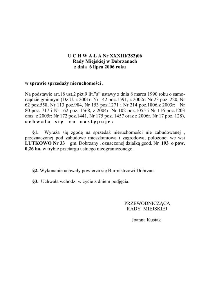 U C H W A Ł A Nr XXXIII(282)06 Rady Miejskiej w Dobrzanach z dnia 6 lipca 2006 roku w sprawie sprzedaŜy nieruchomości . Na podstawie art.18 ust.2 pkt.9 lit.”a” ustawy z dnia 8 marca 1990 roku o samorządzie gminnym (Dz.U. z 2001r. Nr 142 poz.1591, z 2002r: Nr 23 poz. 220, Nr 62 poz.558, Nr 113 poz.984, Nr 153 poz.1271 i Nr 214 poz.1806,z 2003r: Nr 80 poz. 717 i Nr 162 poz. 1568, z 2004r: Nr 102 poz.1055 i Nr 116 poz.1203 oraz z 2005r: Nr 172 poz.1441, Nr 175 poz. 1457 oraz z 2006r. Nr 17 poz. 128), uchwala się co następuje: §1. WyraŜa się zgodę na sprzedaŜ nieruchomości nie zabudowanej , przeznaczonej pod zabudowę mieszkaniową i zagrodową, połoŜonej we wsi LUTKOWO Nr 33 gm. Dobrzany , oznaczonej działką geod. Nr 193 o pow. 0,26 ha, w trybie przetargu ustnego nieograniczonego. §2. Wykonanie uchwały powierza się Burmistrzowi Dobrzan. §3. Uchwała wchodzi w Ŝycie z dniem podjęcia. PRZEWODNICZĄCA RADY MIEJSKIEJ Joanna Kusiak Uzasadnienie do uchwały Rady Miejskiej w Dobrzanach Nr XXXIII(282)06 z dnia 6 lipca 2006roku, w sprawie sprzedaŜy nieruchomości. 1). Nieruchomość połoŜona we wsi Lutkowo Nr 33 gm. Dobrzany oznaczona działką Nr 193 o pow. 0,26 ha, niezabudowana , stanowi mienie gminy Dobrzany i przeznaczona jest pod zabudowę mieszkaniową i zagrodową. O kupno przedmiotowej nieruchomości zwrócił się Pan Dariusz Duszyński zam. Szczecin ul. Tkacka 66/12, który jest właścicielem sąsiedniej posesji. Nieruchomość nie jest obciąŜona umową dzierŜawy ani innymi prawami. Brak jest podstaw prawnych i formalnych do odmowy przeznaczenia nieruchomości do sprzedaŜy. W tej sytuacji naleŜy przystąpić do podjęcia przedmiotowej uchwały.