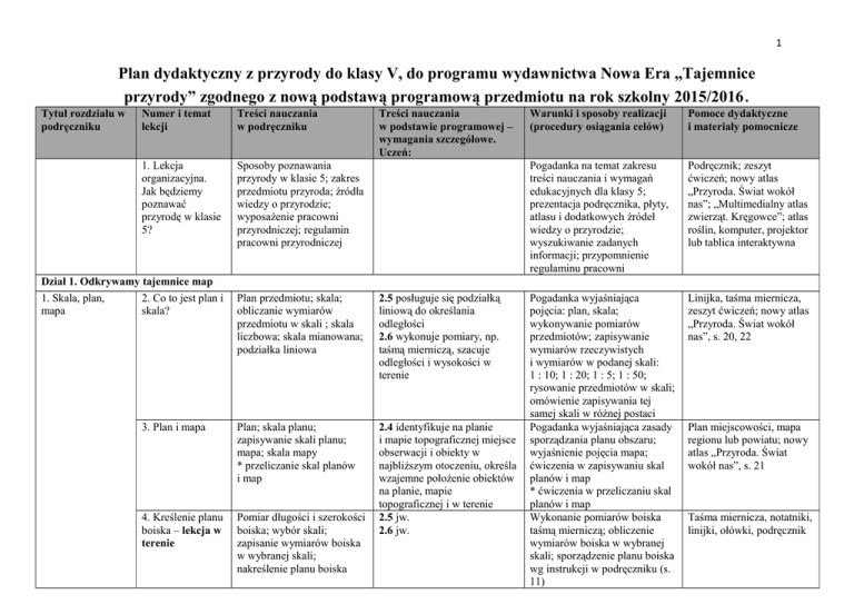 1 Plan dydaktyczny z przyrody do klasy V, do programu wydawnictwa Nowa Era „Tajemnice przyrody” zgodnego z nową podstawą programową przedmiotu na rok szkolny 2015/2016. Tytuł rozdziału w podręczniku Numer i temat lekcji Treści nauczania w podręczniku 1. Lekcja organizacyjna. Jak będziemy poznawać przyrodę w klasie 5? Sposoby poznawania przyrody w klasie 5; zakres przedmiotu przyroda; źródła wiedzy o przyrodzie; wyposażenie pracowni przyrodniczej; regulamin pracowni przyrodniczej Dział 1. Odkrywamy tajemnice map 1. Skala, plan, 2. Co to jest plan i mapa skala? Treści nauczania w podstawie programowej – wymagania szczegółowe. Uczeń: Plan przedmiotu; skala; obliczanie wymiarów przedmiotu w skali ; skala liczbowa; skala mianowana; podziałka liniowa 2.5 posługuje się podziałką liniową do określania odległości 2.6 wykonuje pomiary, np. taśmą mierniczą, szacuje odległości i wysokości w terenie 3. Plan i mapa Plan; skala planu; zapisywanie skali planu; mapa; skala mapy * przeliczanie skal planów i map 4. Kreślenie planu boiska – lekcja w terenie Pomiar długości i szerokości boiska; wybór skali; zapisanie wymiarów boiska w wybranej skali; nakreślenie planu boiska 2.4 identyfikuje na planie i mapie topograficznej miejsce obserwacji i obiekty w najbliższym otoczeniu, określa wzajemne położenie obiektów na planie, mapie topograficznej i w terenie 2.5 jw. 2.6 jw. Warunki i sposoby realizacji (procedury osiągania celów) Pomoce dydaktyczne i materiały pomocnicze Pogadanka na temat zakresu treści nauczania i wymagań edukacyjnych dla klasy 5; prezentacja podręcznika, płyty, atlasu i dodatkowych źródeł wiedzy o przyrodzie; wyszukiwanie zadanych informacji; przypomnienie regulaminu pracowni Podręcznik; zeszyt ćwiczeń; nowy atlas „Przyroda. Świat wokół nas”; „Multimedialny atlas zwierząt. Kręgowce”; atlas roślin, komputer, projektor lub tablica interaktywna Pogadanka wyjaśniająca pojęcia: plan, skala; wykonywanie pomiarów przedmiotów; zapisywanie wymiarów rzeczywistych i wymiarów w podanej skali: 1 : 10; 1 : 20; 1 : 5; 1 : 50; rysowanie przedmiotów w skali; omówienie zapisywania tej samej skali w różnej postaci Pogadanka wyjaśniająca zasady sporządzania planu obszaru; wyjaśnienie pojęcia mapa; ćwiczenia w zapisywaniu skal planów i map * ćwiczenia w przeliczaniu skal planów i map Wykonanie pomiarów boiska taśmą mierniczą; obliczenie wymiarów boiska w wybranej skali; sporządzenie planu boiska wg instrukcji w podręczniku (s. 11) Linijka, taśma miernicza, zeszyt ćwiczeń; nowy atlas „Przyroda. Świat wokół nas”, s. 20, 22 Plan miejscowości, mapa regionu lub powiatu; nowy atlas „Przyroda. Świat wokół nas”, s. 21 Taśma miernicza, notatniki, linijki, ołówki, podręcznik 2 Tytuł rozdziału w podręczniku Numer i temat lekcji Treści nauczania w podręczniku 2. Odległości na planie, mapie i w terenie 5. Jak obliczyć i oszacować odległość? Obliczanie odległości na mapie lub planie za pomocą podziałki liniowej z wykorzystaniem kroczka, cyrkla lub linijki; obliczanie odległości na mapie lub planie za pomocą podziałki liniowej z wykorzystaniem nitki; szacowanie odległości 3. Wysokość w terenie i na mapie poziomicowej 6. Ćwiczenia w obliczaniu i szacowaniu odległości * obliczanie odległości za pomocą skali liczbowej 7. Poznajemy wysokość bezwzględną, względną i mapę poziomicową 8. Co można odczytać z mapy poziomicowej? Treści nauczania w podstawie programowej – wymagania szczegółowe. Uczeń: 2.5 jw. 2.6 jw. 2.5 jw. 2.6 jw. Wysokość bezwzględna; wysokość względna; poziomica; mapa poziomicowa 2.7 rozróżnia w terenie i na modelu formy wypukłe i wklęsłe, wskazuje takie formy na mapie poziomicowej Informacje zawarte na mapie poziomicowej; formy terenu na mapie poziomicowej; wypukłe i wklęsłe formy terenu 2.7 jw. Warunki i sposoby realizacji (procedury osiągania celów) Pomoce dydaktyczne i materiały pomocnicze Omówienie sposobu obliczania odległości za pomocą podziałki z wykorzystaniem kroczka cyrkla lub linijki oraz z wykorzystaniem nitki wg instrukcji w podręczniku (s. 15, 16); ćwiczenia w obliczaniu odległości przy użyciu kroczka i nitki; wyjaśnienie, na czym polega szacowanie odległości Mierzenie odległości na mapie; ćwiczenia w obliczaniu odległości za pomocą podziałki liniowej; ćwiczenia w szacowaniu odległości * ćwiczenia w obliczaniu odległości za pomocą skali liczbowej Pogadanka wyjaśniająca pojęcia: wysokość bezwzględna, wysokość względna, poziomica, mapa poziomicowa; omówienie sposobu tworzenia mapy poziomicowej Pogadanka na temat rodzajów form terenu; analiza map poziomicowych przedstawiających formy wypukłe i wklęsłe; ćwiczenia w odczytywaniu i zapisywaniu wysokości bezwzględnej i obliczaniu wysokości względnej; rozpoznawanie form terenu przedstawionych na mapie poziomicowej Plan miejscowości lub mapa regionu, kroczek (cyrkiel lub linijka), nitka, linijka, zeszyt ćwiczeń; nowy atlas „Przyroda. Świat wokół nas”, s. 22–23 Nowy atlas „Przyroda. Świat wokół nas”, mapa, plan miejscowości, linijka Zeszyt ćwiczeń, nowy atlas „Przyroda. Świat wokół nas”, s. 24–25 Mapa poziomicowa. Mapa hipsometryczna – nowy atlas „Przyroda. Świat wokół nas”, s. 24 3 Tytuł rozdziału w podręczniku Numer i temat lekcji Treści nauczania w podręczniku 3. Wysokość w terenie i na mapie poziomicowej cd. 9. Szacowanie wysokości – lekcja w terenie Szacowanie wysokości budynków; szacowanie wysokości metodą cienia; szacowanie wysokości niewielkiego pagórka 4. Nakładanie barw na mapy poziomicowe 10. Nakładanie barw na mapy poziomicowe Podsumowanie działu 1 11. Odkrywamy tajemnice map – podsumowanie działu Barwy hipsometryczne; mapy hipsometryczne; zasada doboru barw hipsometrycznych; formy ukształtowania powierzchni: niziny, wyżyny, góry i ich oznaczenia na