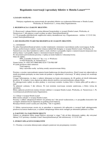 Regulamin rezerwacji i sprzedaży biletów w Hotelu Lenart**** 1.ZASADY OGÓLNE: Niniejszy regulamin ma zastosowanie do sprzedaży biletów na wydarzenia biletowane w Hotelu Lenart, Wieliczka, ul. Narutowicza 1, zwany dalej Organizatorem. 2. REZERWACJA I ZAKUPU BILETÓW: 2.1.Rezerwacji i zakupu biletów można dokonać bezpośrednio w recepcji Hotelu Lenart, Wieliczka, ul. Narutowicza 1, lub poprzez e-mail wysłany na adres: [email protected]. 2.2. W przypadku jakichkolwiek wątpliwości należy skontaktować się z Organizatorem – telefon: 12 32 83 244, e-mail: [email protected]. 3. SZCZEGÓŁOWE WARUNKI REZERWACJI I ZAKUPU BILETÓW. 3.1. INTERNET Na adres [email protected] należy wysłać wiadomość z imieniem i nazwiskiem osoby rezerwującej, liczbą miejsc, preferowanym rządem i numer miejsca (układ Sali dostępny w recepcji Hotelu Lenart, Wieliczka, ul. Narutowicza oraz dane kontaktowe (adres e-mail, telefon) w przypadku imprez z numerowanymi miejscami oraz ilością miejsc w przypadku imprez z nienumerowanymi miejscami. Po otrzymaniu potwierdzenia prosimy o wpłatę na konto bankowe wskazanej kwoty. Dane do wpłaty: PPH „Ceramika Zesławice” Sp. z o.o. w Wieliczce 32-020 Wieliczka, ul. Narutowicza 1 Numer konta: 91 1020 3453 0000 8002 0210 7720 PKO BP W tytule przelewu należ umieścić: Tytuł imprezy Imię i nazwisko osoby na którą zostały zarezerwowane bilety. Prosimy o uważne wprowadzanie numeru konta bankowego do danych przelewu. Hotel Lenart nie odpowiada za skutki przesłania pieniędzy na inne konto niż podane w regulaminie i rezerwacji. W takiej sytuacji nie zrealizuje rezerwacji. Uwaga! Informujemy, że dane o wpłacie dokonanej na konto otrzymujemy do 48 godzin od chwili dokonania przelewu. W związku z tym, dopiero po takim okresie możliwy jest potwierdzenie zakupu biletu. Po zaksięgowaniu wpłaty na adres podany w rezerwacji zostanie wysłany bilet w formie pliku pdf na adres email. Na płatność czekamy 3 dni robocze. Po tym terminie rezerwacja zostanie anulowana, a bilety wrócą do sprzedaży. Bilety opłacone przelewem można również odebrać w recepcji Hotelu Lenart, Wieliczka, ul. Narutowicza 1. Po wcześniejszym poinformowaniu Organizatora. 3.2. Zakup w recepcji Hotelu Lenart Bilet można zakupić w recepcji Hotelu Lenart. Prosimy o odbiór zakupionych biletów nie później niż 3 dni przed wydarzeniem, a w przypadku koncertów lub występów dedykowanych najpóźniej na godzinę przed imprezą. Recepcja Hotelu Lenart czynna jest całą dobę, 7 dni w tygodniu. 3.3 Bilety zarezerwowane uważa się za sprzedane w momencie ich opłacenia w recepcji bądź zaksięgowania przelewu na koncie bankowym, a wydanie zakupionego biletu może nastąpić po dokonaniu płatności za bilet. 4. FAKTURY ZA ZAKUPIONE BILETY Faktury za zakupione bilety mogą Państwo otrzymać w ciągu 7 dni od daty dokonania zapłaty, aby otrzymać fakturę VAT prosimy o kontakt e-mail: [email protected], lub telefoniczny: 12 32 83 244. 5. ZWROT OPŁACONYCH BILETÓW 5.1. Prosimy o rozważne dokonywanie zakupów ponieważ nie przyjmujemy zwrotów. 5.2. Po opłaceniu możliwe jest jedynie przyjęcie biletu w komis. Po ewentualnej odsprzedaży pieniądze zostaną przekazane na wskazane konto. Prośbę o przekazanie biletu w komis należy wysłać na adres e-mailowy: [email protected], lub telefonicznie: 12 32 83 244, 12 32 83 100. Należy pamiętać o podaniu imienia i nazwiska osoby, na którą została wykonana dana rezerwacja. 5.2. W przypadku odwołania, zmiany programu, miejsca lub godziny rozpoczęcia wydarzenia artystycznego przez organizatora, Hotel Lenart dokona zwrotu kwoty za bilet: na rachunek bankowy wskazany przez klienta za pośrednictwem wiadomości e-maila na adres: [email protected], lub pozostawiony w recepcji. - w recepcji Hotelu Lenart Wieliczka, ul. Narutowicza 1. Podstawą do zwrotu biletu jest okazanie Organizatorowi dokumentu potwierdzającego dokonanie opłaty za bilet. W wypadku odwołania imprezy przez Organizatora zwrot biletów nie jest konieczny. Organizator nie będzie zobowiązany do żadnej rekompensaty lub odszkodowania wobec posiadacza biletu, poza zwrotem sumy, na jaką opiewał bilet na imprezę, która została odwołana oraz w przypadku zmiany daty lub programu, godziny rozpoczęcia oraz miejsca imprezy. Organizator nie zwraca kosztów zrealizowanej wysyłki oraz kosztów związanych z realizacją transakcji. 6. ANULOWANIE REZERWACJI Niezależnie od woli klienta wszystkie rezerwacje nie wykupione w terminie wskazanym w rezerwacji będą automatycznie anulowane po 3 dniach. 7. DANE OSOBOWE Wszelkie dane osobowe otrzymywane przez Hotel Lenart w ramach sprzedaży biletów są i będą wykorzystywane w celu wykonania umowy kupna sprzedaży biletów jak również za zgodą osoby udostępniającej dane osobowe w celach dostarczenia informacji o usługach, promocjach i produktach oferowanych przez Hotel Lenart. Otrzymane dane osobowe nie są przekazywane osobom trzecim. Każda osoba udostępniająca swoje dane osobowe ma prawo dostępu do nich, jak również do ich poprawiania i uzupełniania. REGULAMIN AKTUALNY OD 15.09.2014r. Organizator www.hotellenart.pl