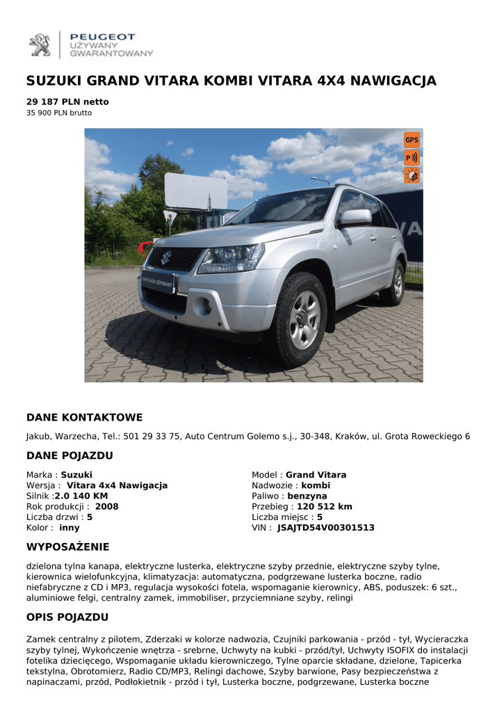 SUZUKI GRAND VITARA KOMBI VITARA 4X4 NAWIGACJA 29 187 PLN netto 35 900 PLN brutto DANE KONTAKTOWE Jakub, Warzecha, Tel.: 501 29 33 75, Auto Centrum Golemo s.j., 30-348, Kraków, ul. Grota Roweckiego 6 DANE POJAZDU Marka : Suzuki Wersja : Vitara 4x4 Nawigacja Silnik :2.0 140 KM Rok produkcji : 2008 Liczba drzwi : 5 Kolor : inny Model : Grand Vitara Nadwozie : kombi Paliwo : benzyna Przebieg : 120 512 km Liczba miejsc : 5 VIN : JSAJTD54V00301513 WYPOSAŻENIE dzielona tylna kanapa, elektryczne lusterka, elektryczne szyby przednie, elektryczne szyby tylne, kierownica wielofunkcyjna, klimatyzacja: automatyczna, podgrzewane lusterka boczne, radio niefabryczne z CD i MP3, regulacja wysokości fotela, wspomaganie kierownicy, ABS, poduszek: 6 szt., aluminiowe felgi, centralny zamek, immobiliser, przyciemniane szyby, relingi OPIS POJAZDU Zamek centralny z pilotem, Zderzaki w kolorze nadwozia, Czujniki parkowania - przód - tył, Wycieraczka szyby tylnej, Wykończenie wnętrza - srebrne, Uchwyty na kubki - przód/tył, Uchwyty ISOFIX do instalacji fotelika dziecięcego, Wspomaganie układu kierowniczego, Tylne oparcie składane, dzielone, Tapicerka tekstylna, Obrotomierz, Radio CD/MP3, Relingi dachowe, Szyby barwione, Pasy bezpieczeństwa z napinaczami, przód, Podłokietnik - przód i tył, Lusterka boczne, podgrzewane, Lusterka boczne regulowane elektrycznie, Kolumna kierownicy regulowana manualnie, Kieszenie w oparciach foteli przednich, Klimatyzacja automatyczna, Klamki zewnętrzne w kolorze nadwozia, Immobilizer, Instalacja radiowa + 4 głośniki, Kierownica ze sterowaniem radia, Fotele przednie, ogrzewane, Gniazdo 12V w bagażniku, Felgi aluminiowe 17 z ogumieniem, Fotel kierowcy z manualną regulacją wysokości, El. podnoszenie szyb, przód i tył, EBD-elektroniczny rozdział sił hamowania, ABS, BAS - asystent układu hamulcowego, Airbag 6 sztuk 4X4 OPONY DUELER A/T BRIDGESTONE !!! W przypadku zainteresowania naszą ofertą prosimy o wcześniejszy kontakt w celu potwierdzenia dostępności oraz lokalizacji samochodu !!! Więcej informacji na temat tego samochodu oraz całej naszej oferty: Autoryzowany salon Peugeot Kraków ul. Grota Roweckiego 6 Jakub Warzecha - doradca handlowy Tel. +48 501 29 33 75 Agnieszka Szymańska-Uchwat - specjalista ds. Kredytów, Lesingów i Ubezpieczeń Tel. +48 693 93 25 21 Autoryzowany salon Citroen Kraków ul. Opolska 9 Tomasz Meus – Kierownik Samochodów Używanych Tel. +48 693 93 27 67 Michał Mikołajczak - doradca handlowy Tel. +48 609 44 10 28 Agnieszka Szczuka-Łach - specjalista ds. Kredytów, Lesingów i Ubezpieczeń Tel. +48 693 93 27 69 Autoryzowany salon Peugeot Nowy Targ ul. Podtatrzańska 3 Marcin Gerlach – kierownik salonu Tel. +48 607 30 52 55 Stasik Paweł - specjalista d/s ubezpieczeń Tel. +48 725 29 16 16 QR CODE DLA OGŁOSZENIA W SERWISIE UZYWANYGWARANTOWANY.PL Powered by TCPDF (www.tcpdf.org)