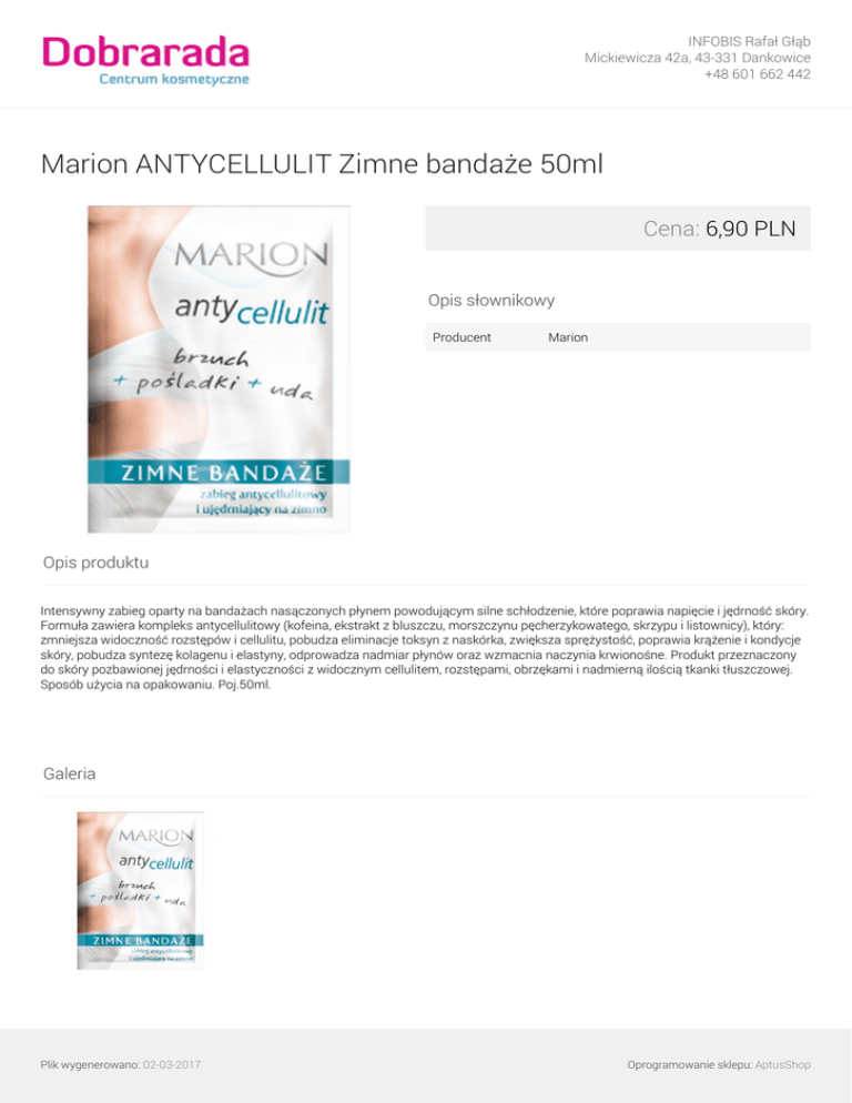 INFOBIS Rafał Głąb Mickiewicza 42a, 43-331 Dankowice +48 601 662 442 Marion ANTYCELLULIT Zimne bandaże 50ml Cena: 6,90 PLN Opis słownikowy Producent Marion Opis produktu Intensywny zabieg oparty na bandażach nasączonych płynem powodującym silne schłodzenie, które poprawia napięcie i jędrność skóry. Formuła zawiera kompleks antycellulitowy (kofeina, ekstrakt z bluszczu, morszczynu pęcherzykowatego, skrzypu i listownicy), który: zmniejsza widoczność rozstępów i cellulitu, pobudza eliminacje toksyn z naskórka, zwiększa sprężystość, poprawia krążenie i kondycje skóry, pobudza syntezę kolagenu i elastyny, odprowadza nadmiar płynów oraz wzmacnia naczynia krwionośne. Produkt przeznaczony do skóry pozbawionej jędrności i elastyczności z widocznym cellulitem, rozstępami, obrzękami i nadmierną ilością tkanki tłuszczowej. Sposób użycia na opakowaniu. Poj.50ml. Galeria Plik wygenerowano: 02-03-2017 Powered by TCPDF (www.tcpdf.org) Oprogramowanie sklepu: AptusShop