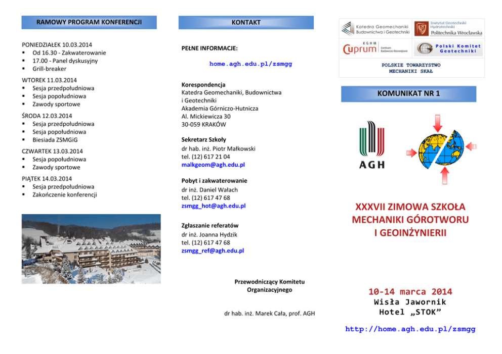 RAMOWY PROGRAM KONFERENCJI PONIEDZIAŁEK 10.03.2014 Od 16.30 - Zakwaterowanie 17.00 - Panel dyskusyjny Grill-breaker WTOREK 11.03.2014 Sesja przedpołudniowa Sesja popołudniowa Zawody sportowe ŚRODA 12.03.2014 Sesja przedpołudniowa Sesja popołudniowa Biesiada ZSMGiG CZWARTEK 13.03.2014 Sesja popołudniowa Zawody sportowe PIĄTEK 14.03.2014 Sesja przedpołudniowa Zakończenie konferencji KONTAKT PEŁNE INFORMACJE: home.agh.edu.pl/zsmgg Korespondencja Katedra Geomechaniki, Budownictwa i Geotechniki Akademia Górniczo-Hutnicza Al. Mickiewicza 30 30-059 KRAKÓW KOMUNIKAT NR 1 Sekretarz Szkoły dr hab. inż. Piotr Małkowski tel. (12) 617 21 04 [email protected] Pobyt i zakwaterowanie dr inż. Daniel Wałach tel. (12) 617 47 68 [email protected] Zgłaszanie referatów dr inż. Joanna Hydzik tel. (12) 617 47 68 [email protected] XXXVII ZIMOWA SZKOŁA MECHANIKI GÓROTWORU I GEOINŻYNIERII Przewodniczący Komitetu Organizacyjnego 10-14 marca 2014 dr hab. inż. Marek Cała, prof. AGH Wisła Jawornik Hotel „STOK” http://home.agh.edu.pl/zsmgg ORGANIZATORZY Katedra Geomechaniki, Budownictwa i Geotechniki Wydziału Górnictwa i Geoinżynierii Akademii Górniczo-Hutniczej w Krakowie Instytut Geotechniki i Hydrotechniki Wydziału Budownictwa Lądowego i Wodnego Politechniki Wrocławskiej KGHM CUPRUM Centrum BadawczoRozwojowe Polski Komitet Geotechniki Polskie Towarzystwo Mechaniki Skał PROGRAM KONFERENCJI wykłady monograficzne referaty naukowe prezentacje firm branżowych TEMATYKA KONFERENCJI Nowe techniki i technologie w geoinżynierii Stateczność wyrobisk górniczych i budowli geotechnicznych Budownictwo podziemne i tunelowanie Mechanika górotworu w badaniach laboratoryjnych i kopalnianych Stateczność skarp i zboczy Zagrożenia dynamiczne w górnictwie i geotechnice Modelowanie ośrodka skalnego i gruntowego ZGŁASZANIE UCZESTNICTWA ORAZ REFERATÓW Zapraszamy wszystkich zainteresowanych tematyką Konferencji do zgłaszania uczestnictwa i nadsyłania referatów. Karty zgłoszeniowe można wysyłać drogą elektroniczną, faxem lub na adres kontaktowy organizatorów. Referaty na konferencję możecie Państwo zgłaszać jako referaty TYLKO do prezentacji w czasie trwania obrad lub do JEDNOCZESNEGO prezentacji i druku. NIE PRZYJMUJEMY ARTYKUŁÓW WYŁĄCZNIE DO DRUKU Wszystkich autorów nadsyłających referaty prosimy o NIEZALEŻNE nadesłanie ich streszczeń o objętości ok. 1 strony A-4 z odstępem 1,5 linii. Streszczenia te znajdą się w drukowanym programie Konferencji dla uczestników XXXVII ZSMGG Artykuły będą recenzowane i zostaną zamieszczone w punktowanych wydawnictwach w języku polskim lub angielskim (4÷7 pkt). Pełny tekst publikacji w przypadku chęci ich druku należy przesłać do 15.01.2014 na adres: pokoi posiada balkon z pięknym widokiem na pamoramę Beskidów. Ponadto do dyspozycji gości hotel oferuje basen kryty, kompleks Spa i Welness, a także kręgielnię oraz inne atrakcje. Hotel STOK posiada własne wyciągi narciarskie KICZERA zlokalizowane bezpośrednio przy hotelu. Do dyspozycji narciarzy jest wypożyczalnia sprzętu Blizzard, szkółka narciarska, stała opieka ratownika GOPR oraz karczma góralska. www.hotelstok.pl OPŁATA KONFERENCYJNA PEŁNA UCZESTNIKA – 1730 PLN + 23% VAT – Obejmuje ona: noclegi, wyżywienie, materiały konferencyjne, udział w konferencji, udział w imprezach towarzyszących, udział w bankiecie; ZNIŻKOWA DOKTORANTA – 1300 PLN + 23% VAT – Obejmuje ona: noclegi, wyżywienie, materiały konferencyjne, udział w konferencji, udział w imprezach towarzyszących, udział w bankiecie; [email protected] Kwalifikowania artykułów do ww. periodyków będzie dokonywał Komitet Naukowy OSOBA TOWARZYSZĄCA – 1130 PLN + 23% VAT – Obejmuje ona: noclegi, wyżywienie udział w imprezach towarzyszących, udział w bankiecie; ZAKWATEROWANIE Dopłata do pokoju 1-osobowego – 450 PLN + 23% VAT. Konferencja odbędzie się w hotelu STOK w Wiśle położonym w malowniczej dolinie Jawornik w Beskidzie Śląskim. Wisła to popularna miejscowość wypoczynkowa, szczególnie atrakcyjna w sezonie zimowym. Jest to wymarzone miejsce by podziwiać górską przyrodę. Hotel dysponuje komfortowo wyposażonymi pokojami jedno oraz dwuosobowymi, pokojami de lux, a także typu studio i apartamentami. Większość Ilość miejsc w pokojach 1-osobowych ograniczona, decyduje kolejność zgłoszeń. Po 31 stycznia 2014 roku opłata za udział w konferencji (pełna, doktoranta i osoby towarzyszącej) wzrasta o 200 PLN.