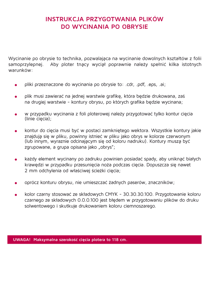 INSTRUKCJA PRZYGOTWANIA PLIKÓW DO WYCINANIA PO OBRYSIE Wycinanie po obrysie to technika, pozwalająca na wycinanie dowolnych kształtów z folii samoprzylepnej. Aby ploter tnący wyciął poprawnie należy spełnić kilka istotnych warunków: pliki przeznaczone do wycinania po obrysie to: .cdr, .pdf, .eps, .ai; plik musi zawierać na jednej warstwie grafikę, która będzie drukowana, zaś na drugiej warstwie - kontury obrysu, po których grafika będzie wycinana; w przypadku wycinania z foli ploterowej należy przygotować tylko kontur cięcia (linie cięcia); kontur do cięcia musi być w postaci zamkniętego wektora. Wszystkie kontury jakie znajdują się w pliku, powinny istnieć w pliku jako obrys w kolorze czerwonym (lub innym, wyraznie odcinającym się od koloru nadruku). Kontury muszą być zgrupowane, a grupa opisana jako „obrys”; każdy element wycinany po zadruku powinien posiadać spady, aby uniknąć białych krawędzi w przypadku przesunięcia noża podczas cięcia. Dopuszcza się nawet 2 mm odchylenia od właściwej ścieżki cięcia; oprócz konturu obrysu, nie umieszczać żadnych paserów, znaczników; kolor czarny stosować ze składowych CMYK - 30.30.30.100. Przygotowanie koloru czarnego ze składowych 0.0.0.100 jest błędem w przygotowaniu plików do druku solwentowego i skutkuje drukowaniem koloru ciemnoszarego. UWAGA! Maksymalna szerokość cięcia plotera to 118 cm. Efekt końcowy ABC678 ABC678 Poprawne przygotowanie pliku Błędnie ABC678 Przygotowanie liter do wycięcia na foli ploterowej z wypełnieniem w jednolitym kolorze. Najbezpieczniej jest pod konturem obrysu umieścić tło w wybranym kolorze, zaś ścieżki służące jako kontur obrysu zgrupować jako całość. Da nam to 100% pewności, ze litery nie będą posiadały białych krawędzi przy ewentualnym niespasowaniu konturu z nadrukiem. Efekt końcowy ABC678 Poprawne przygotowanie pliku ABC678 AABBC678 C678 ABC678 Błędnie linia, po której ploter wycina folie Przygotowanie liter do wycięcia z jednolitym wypełnieniem i obrysem w innym kolorze. Efekt końcowy Poprawne przygotowanie pliku ABC678 Błędnie ABC678 Przygotowanie liter do wycięcia z dowolnym wypełnieniem - może to być dowolna grafika, gradient, bitmapa lub inne wzory. Efekt końcowy Poprawne przygotowanie pliku Błędnie w przypadku minimalnego przesunięcia się materiału podczas cięcia wokół grafiki będzie widoczny biały Aby poprawnie wyciąć folie z wydrukowaną grafiką konieczne są spady minimum 2 mm. Przedstawione rysunki obrazują efekt końcowy w przypadku nie zachowania spadów w grafice. Błędnie ABC W przypadku druku i ciecia folii samoprzylepnej z gradientem. Efekt końcowy ABC ABC Plik został niewłaściwie przygotowany - skutek zastosowania konturu obrysu bez spadów w grafice. Nóz na ploterze przesunał się nieznacznie w prawo co poskutkowało wycięciem białej obwódki z prawej strony.