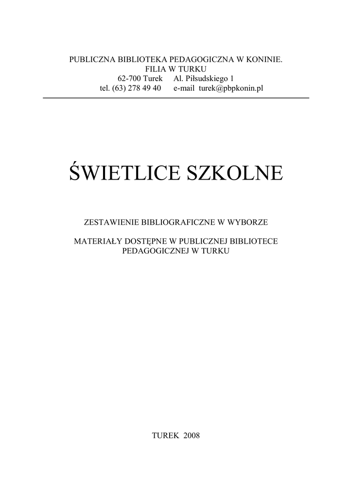 PUBLICZNA BIBLIOTEKA PEDAGOGICZNA W KONINIE. FILIA W TURKU 62-700 Turek Al. Piłsudskiego 1 tel. (63) 278 49 40 e-mail [email protected] ŚWIETLICE SZKOLNE ZESTAWIENIE BIBLIOGRAFICZNE W WYBORZE MATERIAŁY DOSTĘPNE W PUBLICZNEJ BIBLIOTECE PEDAGOGICZNEJ W TURKU TUREK 2008 SPIS TREŚCI: 1. WYDAWNICTWA ZWARTE............................................................. 3 2. ARTYKUŁY W WYDAWNICTWACH ZWARTYCH..................... 4 3. ARTYKUŁY Z CZASOPISM.............................................................. 4 3.1 ŚWIETLICE TERAPEUTYCZNE.................................................... 10 3.2 ŚWIETLICE ŚRODOWISKOWE..................................................... 10 3.3 SCENARIUSZE ZAJĘĆ ŚWIETLICOWYCH................................. 11 3.4 ZESTAWIENIA BIBLIOGRAFICZNE............................................ 13 2 1. WYDAWNICTWA ZWARTE 1. CHYLIŃSKA M.: Jak prowadzić świetlicę szkolną: poradnik. Warszawa: Wydawnictwo Edukacyjne „Żak”, 2002. Sygn. 41850 2. ENCYKLOPEDIA pedagogiczna XXI w. T. 6 [ red. nauk. i przewodn. kom. red. ] Tadeusz Pilch. Warszawa: Wydawnictwo Akademickie „Żak”, 2007, s. 462-467: świetlica. Sygn. 43868 3. KOTT T.: Zajęcia pozalekcyjne i terapia zajęciowa z osobami o obniżonej sprawności umysłowej. Warszawa: Wydaw. Akademii Pedagogiki Specjalnej im. Marii Grzegorzewskiej, 2002, s.109-123: Praca wychowawcza i zajęcia pozalekcyjne w świetlicy szkolnej. Sygn. 41856 4. MACIOŁEK B.: Program wychowawczy świetlic „Liście wielkiego drzewa życia”. Rzeszów: Wydawnictwo Oświatowe FOSZE, 2007. Sygn.43371 5. MACIOŁEK B.: Przewodnik metodyczny do programu wychowawczego świetlic „Liście wielkiego drzewa życia”. Rzeszów: Wydawnictwo Oświatowe FOSZE, 2007. Sygn. 43372 6. MARZEC D.K.: Opieka nad dzieckiem w dobie przemian społecznych. Częstochowa: Wydaw. Wyższej Szkoły Pedagogicznej, 2004, s. 124-132: Świetlica szkolna ośrodkiem realizacji zadań opiekuńczo-reedukacyjnych. Sygn. 41886 7. MISIURA I.: ...droga do dorosłości: program wychowawczy świetlicy szkolnej dla uczniów gimnazjum. Kraków: Wydawnictwo Rubikon, 2001. Sygn. 42053 8. NOWOSIADŁY A.: Szkolenie przygotowujące wolontariuszy do pracy w świetlicach dla dzieci i młodzieży. Warszawa: Państwowa Agencja Rozwiązywania Problemów Alkoholowych; Wydawnictwo Edukacyjne PARPA, 2006. Sygn. 43575 9. OKOŃ W.: Nowy słownik pedagogiczny. Wyd. 2 rozszerzone. Warszawa: Wydawnictwo Akademickie „Żak”, 1998, s. 394: świetlica szkolna. Sygn. 37812 10. PRACA wychowawcza w świetlicy szkolnej / pod red. A Wiszniewskiej. Warszawa: Wydawnictwa Szkolne i Pedagogiczne, 1978. Sygn. 20715 11. SOWISŁO M.: Dla dobra dziecka: o warsztacie pracy nauczyciela – wychowawcy. Kraków: Oficyna Wydawnicza Impuls, 2007, s. 27-30: Rok i miesiąc w świetlicy szkolnej. Sygn. 43864 12. ŚWIETLICA szkolna szansą do wykorzystania / pod red. M. Pietkiewicz. Warszawa: Wydawnictwa Szkolne i Pedagogiczne, 1988. Sygn. 30600 30601 13. WAWRZYKOWSKA - WIERCIOCHOWA D. : Świetlice szkolne. Warszawa: Państwowe zakłady Wydawnictw Szkolnych, 1963. Sygn. 7289, 8617 3 2. ARTYKUŁY W WYDAWNICTWACH ZWARTYCH 1. BIAŁEK M.: Szanse i możliwości świetlicy w realizacji programu opiekuńczo-wychowawczego szkoły (w:) Niektóre obszary pracy opiekuńczo-wychowawczej i edukacyjnej szkoły oraz środowiska lokalnego / pod red. T. Wilk. Kraków: Oficyna Wydawnicza Impuls, 2007, s. 53-67. Sygn.43960 2. KRASIEJKO I.: Świetlice agendami pomocy dziecku i jego rodzinie (w:) Dziecko w lokalnym systemie pomocy społecznej / pod red. S. Czarneckiej. Częstochowa: Wydawnictwo Wyższej Szkoły Pedagogicznej, 2002-2003, s.173-181. Sygn.41891 3. ŁASKAWIEC M.: Działalność profilaktyczno-wychowawcza Świetlicy Środowiskowej w Bukownie (w:) Niektóre obszary pracy opiekuńczowychowawczej i edukacyjnej szkoły oraz środowiska lokalnego / pod red. T. Wilk. Kraków: Oficyna Wydawnicza Impuls, 2007, s. 37-51. Sygn. 43960 4. PITUŁA B.: Zabawa jako oferta pracy świetlicy dla uczniów gimnazjum (w:) Niektóre obszary pracy opiekuńczo-wychowawczej i edukacyjnej szkoły oraz środowiska lokalnego / pod red. T. Wilk. Kraków: Oficyna Wydawnicza Impuls, 2007, s. 103-118. Sygn. 43960 3. ARTYKUŁY Z CZASOPISM 1. ABRAMOWICZ J.: Kącik pod schodami // Problemy OpiekuńczoWychowawcze. – 2002, nr 9, s. 52-53 2. ADAMCZYK D.: Świetlica – miejsce zapomniane // Wychowanie na co dzień. – 2000, nr 12, s. 15 3. ANIELSKA A.; WRÓBLEWSKA V.: Miejsce pedagoga w świetlicy // Edukacja i Dialog. – 2005, nr 6, s. 67-68 4. BARTCZAK W.: Organizacja czasu wolnego w świetlicy szkolnej // Życie Szkoły. – 2002, nr 4, s. 202-206 5. BARTCZAK W.: Praca terapeutyczno – rewalidacyjna w świetle literatury i własnych doświadczeń // Życie Szkoły. – 2001, nr 3, s. 160165 6. BIEGAJCZYK B.: Muzyka uczy i relaksuje ( autorski program pracy w świetlicy ) // Nowa Szkoła. – 2007, nr 7, s. 22-25 7. BIELA A.: Plan rozwoju zawodowego nauczyciela stażysty // Świetlica w Szkole. – 2008, nr 2, s. 5-6 8. BIENIASZEK R.: Podróże z legendą: cykl zajęć czytelniczych w świetlicy szkolnej szkoły podstawowej // Świetlica w Szkole. – 2008, nr 2, s. 11-12 4 9. BIENIASZEK R.: Rysunek wróżki Agnieszki // Świetlica w Szkole. – 2008, nr 2, s. 19 10. BIENIASZEK R.: Świetlicowy teatrzyk „ Bez Kurtyny” // Świetlica w Szkole. – 2008, nr 2, s. 18 11. BOROWSKI T. [i in.] : Świetlica profilaktyczno-wychowawcza w gimnazjum // Wychowanie na co dzień. – 2000, nr 10/11, dod. s. I-VII 12. BORZĘCKA Z.: Techniki plastyczne w świetlicy szkolnej // Wychowawca. – 2000, nr 10, s. 26-29 13. BRZOZOWIEC B.: W świetlicy integracyjnej // Problemy OpiekuńczoWychowawcze. – 2004, nr 4, s. 52-53 14. BUŁAŚ L.: Współpraca wychowawcy świetlicy szkolnej z rodzicami wychowanków // Świetlica w Szkole. – 2008, nr 3, s. 22-24 15. CIBA A.; GÓRECKA A.: Twórczość plastyczna dzieci w świetlicy szkolnej // Świetlica w Szkole. – 2
