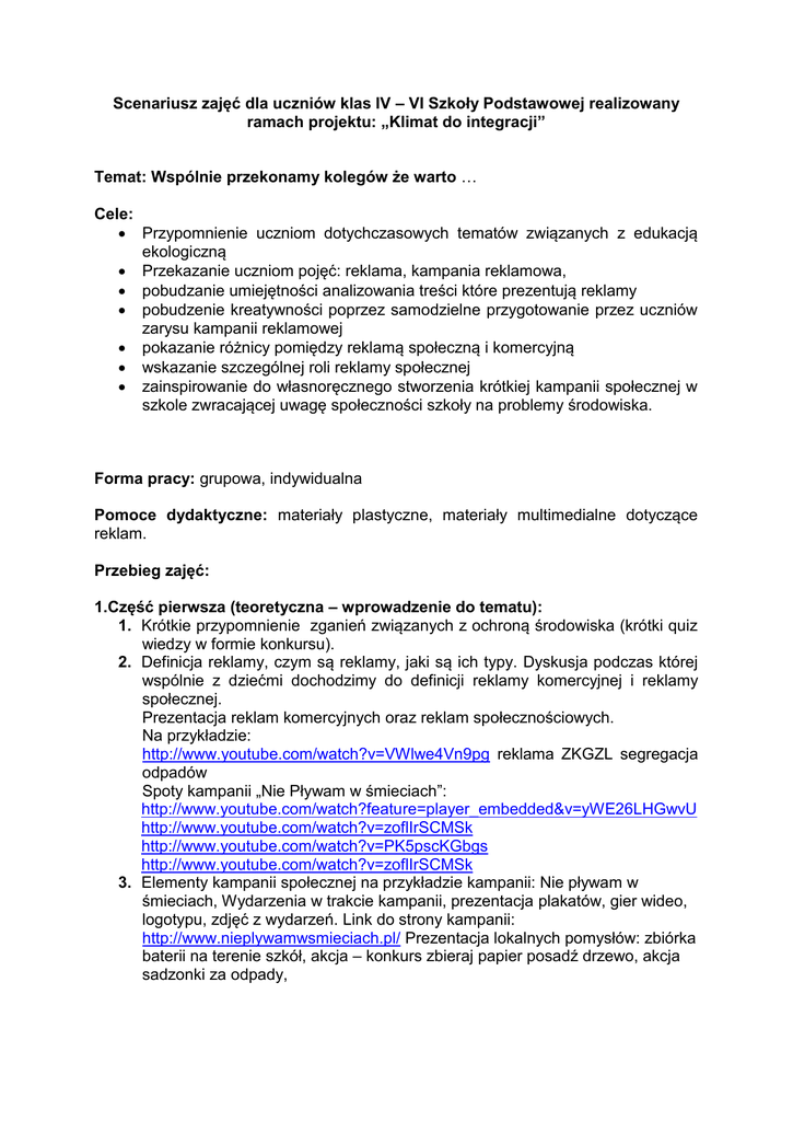 Scenariusz zajęć dla uczniów klas IV – VI Szkoły Podstawowej realizowany ramach projektu: „Klimat do integracji” Temat: Wspólnie przekonamy kolegów że warto … Cele: Przypomnienie uczniom dotychczasowych tematów związanych z edukacją ekologiczną Przekazanie uczniom pojęć: reklama, kampania reklamowa, pobudzanie umiejętności analizowania treści które prezentują reklamy pobudzenie kreatywności poprzez samodzielne przygotowanie przez uczniów zarysu kampanii reklamowej pokazanie różnicy pomiędzy reklamą społeczną i komercyjną wskazanie szczególnej roli reklamy społecznej zainspirowanie do własnoręcznego stworzenia krótkiej kampanii społecznej w szkole zwracającej uwagę społeczności szkoły na problemy środowiska. Forma pracy: grupowa, indywidualna Pomoce dydaktyczne: materiały plastyczne, materiały multimedialne dotyczące reklam. Przebieg zajęć: 1.Część pierwsza (teoretyczna – wprowadzenie do tematu): 1. Krótkie przypomnienie zganień związanych z ochroną środowiska (krótki quiz wiedzy w formie konkursu). 2. Definicja reklamy, czym są reklamy, jaki są ich typy. Dyskusja podczas której wspólnie z dziećmi dochodzimy do definicji reklamy komercyjnej i reklamy społecznej. Prezentacja reklam komercyjnych oraz reklam społecznościowych. Na przykładzie: http://www.youtube.com/watch?v=VWlwe4Vn9pg reklama ZKGZL segregacja odpadów Spoty kampanii „Nie Pływam w śmieciach”: http://www.youtube.com/watch?feature=player_embedded&v=yWE26LHGwvU http://www.youtube.com/watch?v=zoflIrSCMSk http://www.youtube.com/watch?v=PK5pscKGbgs http://www.youtube.com/watch?v=zoflIrSCMSk 3. Elementy kampanii społecznej na przykładzie kampanii: Nie pływam w śmieciach, Wydarzenia w trakcie kampanii, prezentacja plakatów, gier wideo, logotypu, zdjęć z wydarzeń. Link do strony kampanii: http://www.nieplywamwsmieciach.pl/ Prezentacja lokalnych pomysłów: zbiórka baterii na terenie szkół, akcja – konkurs zbieraj papier posadź drzewo, akcja sadzonki za odpady, 2. Część druga wymyślamy kampanię i realizujemy ją! 1. Wspólna burza mózgów, każdy z uczestników podaje temat dotyczący ochrony środowiska o którym chciałby opowiedzieć, lub zwrócić uwagę swoim kolegom. Zbieramy pomysły i przegłosowujemy, który będziemy wspólnie realizować. 2. Wymyślamy co możemy zrobić na terenie szkoły i kto nam może pomóc. 3. Realizujemy pomysł: np. wykonujemy plakat, wymyślamy hasło. MATERIAŁY: - prezentacja multimedialna, - filmy wideo z reklamami, - plakaty akcji, - materiały dvd projektu Nie Pływam w śmieciach, - kartki papieru, mazaki, kartki samoprzylepne, kredki, klej, ołówki, - quiz wiedzy o ekologii, - dla rozrywki jenga ( krótka gra planszowa)