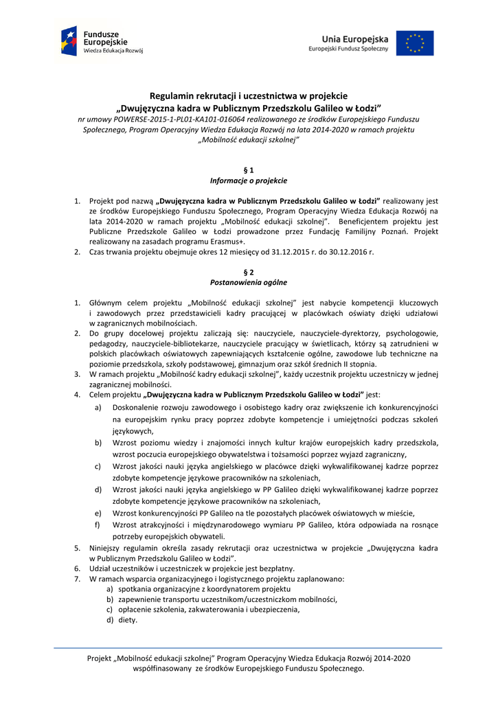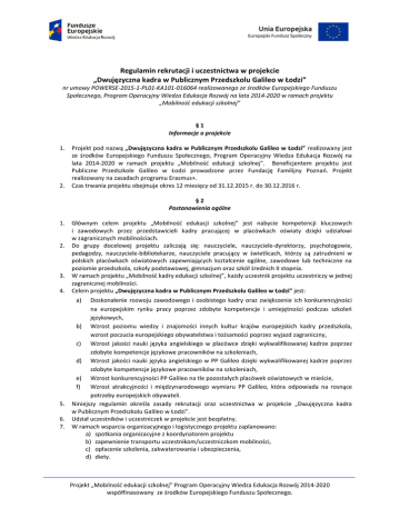 Regulamin rekrutacji i uczestnictwa w projekcie „Dwujęzyczna kadra w Publicznym Przedszkolu Galileo w Łodzi” nr umowy POWERSE-2015-1-PL01-KA101-016064 realizowanego ze środków Europejskiego Funduszu Społecznego, Program Operacyjny Wiedza Edukacja Rozwój na lata 2014-2020 w ramach projektu „Mobilność edukacji szkolnej” §1 Informacje o projekcie 1. 2. Projekt pod nazwą „Dwujęzyczna kadra w Publicznym Przedszkolu Galileo w Łodzi” realizowany jest ze środków Europejskiego Funduszu Społecznego, Program Operacyjny Wiedza Edukacja Rozwój na lata 2014-2020 w ramach projektu „Mobilność edukacji szkolnej”. Beneficjentem projektu jest Publiczne Przedszkole Galileo w Łodzi prowadzone przez Fundację Familijny Poznań. Projekt realizowany na zasadach programu Erasmus+. Czas trwania projektu obejmuje okres 12 miesięcy od 31.12.2015 r. do 30.12.2016 r. §2 Postanowienia ogólne 1. 2. 3. 4. Głównym celem projektu „Mobilność edukacji szkolnej” jest nabycie kompetencji kluczowych i zawodowych przez przedstawicieli kadry pracującej w placówkach oświaty dzięki udziałowi w zagranicznych mobilnościach. Do grupy docelowej projektu zaliczają się: nauczyciele, nauczyciele-dyrektorzy, psychologowie, pedagodzy, nauczyciele-bibliotekarze, nauczyciele pracujący w świetlicach, którzy są zatrudnieni w polskich placówkach oświatowych zapewniających kształcenie ogólne, zawodowe lub techniczne na poziomie przedszkola, szkoły podstawowej, gimnazjum oraz szkół średnich II stopnia. W ramach projektu „Mobilność kadry edukacji szkolnej”, każdy uczestnik projektu uczestniczy w jednej zagranicznej mobilności. Celem projektu „Dwujęzyczna kadra w Publicznym Przedszkolu Galileo w Łodzi” jest: a) 5. 6. 7. Doskonalenie rozwoju zawodowego i osobistego kadry oraz zwiększenie ich konkurencyjności na europejskim rynku pracy poprzez zdobyte kompetencje i umiejętności podczas szkoleń językowych, b) Wzrost poziomu wiedzy i znajomości innych kultur krajów europejskich kadry przedszkola, wzrost poczucia europejskiego obywatelstwa i tożsamości poprzez wyjazd zagraniczny, c) Wzrost jakości nauki języka angielskiego w placówce dzięki wykwalifikowanej kadrze poprzez zdobyte kompetencje językowe pracowników na szkoleniach, d) Wzrost jakości nauki języka angielskiego w PP Galileo dzięki wykwalifikowanej kadrze poprzez zdobyte kompetencje językowe pracowników na szkoleniach, e) Wzrost konkurencyjności PP Galileo na tle pozostałych placówek oświatowych w mieście, f) Wzrost atrakcyjności i międzynarodowego wymiaru PP Galileo, która odpowiada na rosnące potrzeby europejskich obywateli. Niniejszy regulamin określa zasady rekrutacji oraz uczestnictwa w projekcie „Dwujęzyczna kadra w Publicznym Przedszkolu Galileo w Łodzi”. Udział uczestników i uczestniczek w projekcie jest bezpłatny. W ramach wsparcia organizacyjnego i logistycznego projektu zaplanowano: a) spotkania organizacyjne z koordynatorem projektu b) zapewnienie transportu uczestnikom/uczestniczkom mobilności, c) opłacenie szkolenia, zakwaterowania i ubezpieczenia, d) diety. Projekt „Mobilność edukacji szkolnej” Program Operacyjny Wiedza Edukacja Rozwój 2014-2020 współfinasowany ze środków Europejskiego Funduszu Społecznego. 8. Przygotowaniem merytorycznym uczestników i uczestniczek do wyjazdu zajmie się koordynator projektu. Jego zadaniem będzie: przekazanie informacji o programie PO WER oraz o projekcie; przekazanie informacji na temat miejsca i zakresu szkoleń oraz ich organizatorów, a także zakwaterowania i infrastruktury; wsparcie uczestników przed wyjazdem, omówienie wymogów linii lotniczych, bezpieczeństwa na lotnisku i w trakcie podróży. §3 Warunki rekrutacji do udziału w projekcie 1. 2. Osoby uprawnione do udziału w projekcie: nauczyciele, zatrudnieni w Publicznym Przedszkolu Galileo w Łodzi. Osoba zainteresowana uczestnictwem w projekcie musi: a) być pracownikiem szkoły zatrudnionym jako nauczyciel szkoły; b) być zainteresowanym udziałem w mobilności ze względu na cele projektu, c) wyraża gotowość do modyfikacji wykorzystywanego programu nauczania o nowe elementy, będące rezultatami mobilności, d) zobowiązuje się do systematycznego uczestnictwa i realizacji działań objętych projektem szczegółowo opisanych w umowie, §4 Zasady rekrutacji 1. Rekrutacja odbywa się z uwzględnieniem równych szans, w tym zasady równości płci, wieku oraz stażu pracy. 2. Kandydaci i kandydatki, przed złożeniem formularza zgłoszeniowego, zapoznają się z całością tekstu niniejszego regulaminu. 3. Projekt zakłada rekrutację 8 uczestników/uczestniczek wśród nauczycieli zatrudnionych w placówce. 4. Niniejszy regulamin dostępny jest na stronie internetowej przedszkola. 5. Rekrutacja odbywa się od 11.02.2015r. do 22.02.2015 r. 6. Przyjmowane są jedynie zgłoszenia wypełnione na właściwych formularzach (załącznik nr 1, 2, 3), opatrzone datą i podpisem kandydata. 7. Złożone dokumenty rekrutacyjne są weryfikowane pod względem formalnym, a kandydaci/kandydatki mają możliwość jednokrotnego poprawienia lub uzupełnienia dokumentów formalnych. 8. Za termin złożenia dokumentów rekrutacyjnych przyjmuje się datę złożenia wszystkich wymaganych dokumentów poprawnych formalnie. 9. Formularze zgłoszeniowe przyjmowane są w sposób ciągły w terminie wskazanym w punkcie 5 w sekretariacie przedszkola w zamkniętej kopercie opatrzonej napisem: Projekt „Dwujęzyczna kadra w Publicznym Przedszkolu Galileo w Łodzi”, imię i nazwisko kandydata. 10. Kandydaci/Kandydatki po złożeniu formularzy zgłoszeniowych zostaną zaproszeni do wypełnienia testu znajomości języka angielskiego. Stawienie się na test jest kryterium formalnym. O terminie testu kandydaci/kandydatki zostaną poinformowani przez Dyrektora PP Galileo. 11. Wyboru uczestników i uczestniczek projektu, na podstawie analizy dokumentów zgłoszeniowych ora