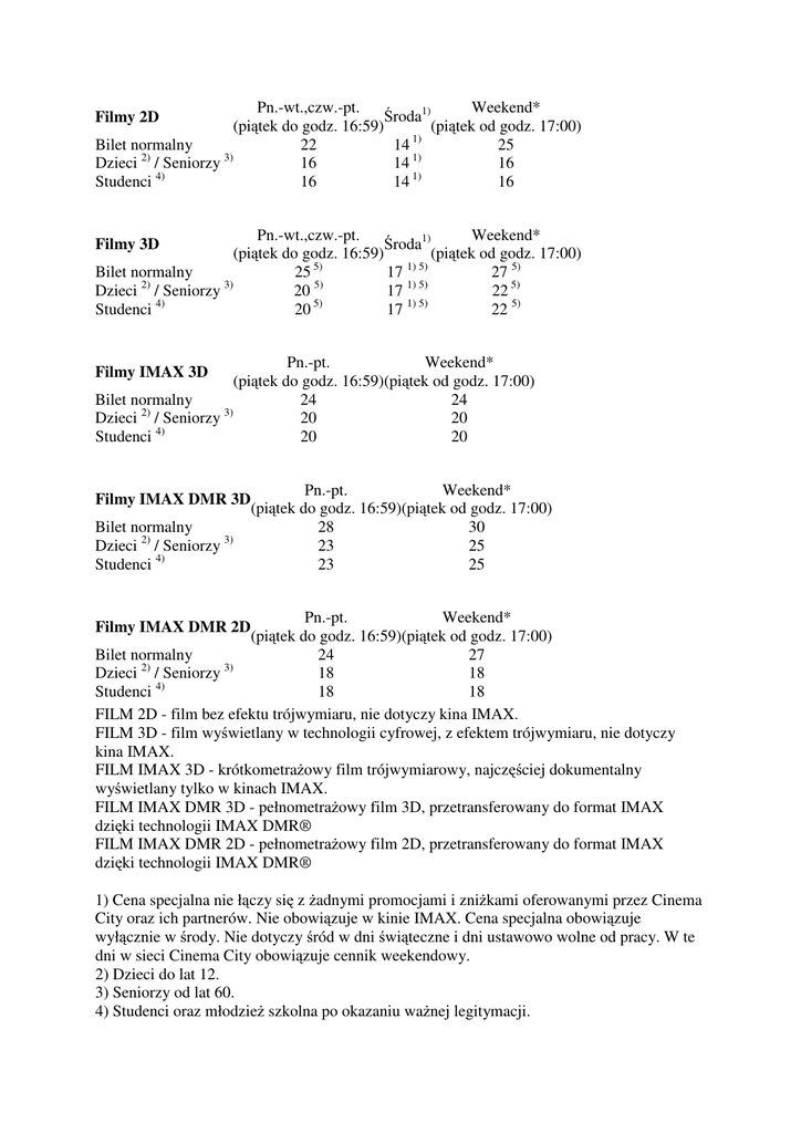 Pn.-wt.,czw.-pt. Weekend* Środa1) (piątek od godz. 17:00) (piątek do godz. 16:59) Bilet normalny 22 14 1) 25 2) 3) 1) Dzieci / Seniorzy 16 14 16 Studenci 4) 16 14 1) 16 Filmy 2D Pn.-wt.,czw.-pt. Weekend* Środa1) (piątek do godz. 16:59) (piątek od godz. 17:00) Bilet normalny 25 5) 17 1) 5) 27 5) 2) 3) 5) 1) 5) Dzieci / Seniorzy 20 17 22 5) Studenci 4) 20 5) 17 1) 5) 22 5) Filmy 3D Pn.-pt. Weekend* (piątek do godz. 16:59)(piątek od godz. 17:00) Bilet normalny 24 24 Dzieci 2) / Seniorzy 3) 20 20 4) Studenci 20 20 Filmy IMAX 3D Filmy IMAX DMR 3D Bilet normalny Dzieci 2) / Seniorzy 3) Studenci 4) Pn.-pt. Weekend* (piątek do godz. 16:59)(piątek od godz. 17:00) 28 30 23 25 23 25 Weekend* Pn.-pt. (piątek do godz. 16:59)(piątek od godz. 17:00) Bilet normalny 24 27 2) 3) Dzieci / Seniorzy 18 18 Studenci 4) 18 18 FILM 2D - film bez efektu trójwymiaru, nie dotyczy kina IMAX. FILM 3D - film wyświetlany w technologii cyfrowej, z efektem trójwymiaru, nie dotyczy kina IMAX. FILM IMAX 3D - krótkometrażowy film trójwymiarowy, najczęściej dokumentalny wyświetlany tylko w kinach IMAX. FILM IMAX DMR 3D - pełnometrażowy film 3D, przetransferowany do format IMAX dzięki technologii IMAX DMR® FILM IMAX DMR 2D - pełnometrażowy film 2D, przetransferowany do format IMAX dzięki technologii IMAX DMR® Filmy IMAX DMR 2D 1) Cena specjalna nie łączy się z żadnymi promocjami i zniżkami oferowanymi przez Cinema City oraz ich partnerów. Nie obowiązuje w kinie IMAX. Cena specjalna obowiązuje wyłącznie w środy. Nie dotyczy śród w dni świąteczne i dni ustawowo wolne od pracy. W te dni w sieci Cinema City obowiązuje cennik weekendowy. 2) Dzieci do lat 12. 3) Seniorzy od lat 60. 4) Studenci oraz młodzież szkolna po okazaniu ważnej legitymacji. 5) W przypadku filmów 3D doliczana jest opłata 3 zł, która zostanie dodana do Państwa biletu. W zamian otrzymają Państwo okulary do oglądania filmów 3D. Zachęcamy do zabrania tych okularów ze sobą po seansie. Można ich użyć przy kolejnej wizycie w naszym kinie a opłata ta nie będzie doliczana. * Ceny weekendowe obowiązują również w dni świąteczne i dni ustawowo wolne od pracy. Wszystkie ceny podano w PLN i zawierają one podatek VAT. UWAGA (nie dotyczy kina IMAX) : Do obejrzenia filmu 3D niezbędne są specjalne okulary 3D – do nabycia w kasach kina. Cena biletu nie zawiera opłaty 3D. Jest ona doliczana w trakcie zakupu biletu na seans, a okulary wręczane są na bramce prowadzącej do sal kinowych. Po obejrzeniu filmu nie wyrzucaj okularów. Zabierz je ze sobą na kolejny seans 3D, a nie będziesz ponosić opłaty 3D przy zakupie biletu na inne filmy w tej technologii. • Jeżeli Twoje okulary 3D ulegną zarysowaniu lub odbarwieniu postrzeganie efektu 3D może być utrudnione. W takim przypadku zaleca się zakupić nową parę okularów przy kolejnej wizycie w kinie. • Prosimy o sprawdzenie czy okulary 3D nie są uszkodzone lub zarysowane zaraz po otrzymaniu i otwarciu opakowania. Okulary używane lub zabrane do domu nie podlegają reklamacji. • Okulary 3D mogą nie działać w innym kinie niż to, w którym zostały zakupione. UWAGA (dotyczy tylko kina IMAX): W kinie IMAX na czas seansu, otrzymacie Państwo okulary przy wejściu na salę. Prosimy o ich zwrot obsłudze kina po zakończonym seansie. Akceptujemy następujące karty płatnicze i kredytowe: Visa, Visa Electron, Master Card, Master Card Electronic i Maestro.