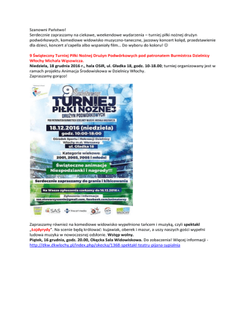 Szanowni Państwo! Serdecznie zapraszamy na ciekawe, weekendowe wydarzenia – turniej piłki nożnej drużyn podwórkowych, komediowe widowisko muzyczno-taneczne, jazzowy koncert kolęd, przedstawienie dla dzieci, koncert a’capella albo wspaniały film… Do wyboru do koloru! 9 Świąteczny Turniej Piłki Nożnej Drużyn Podwórkowych pod patronatem Burmistrza Dzielnicy Włochy Michała Wąsowicza. Niedziela, 18 grudnia 2016 r., hala OSiR, ul. Gładka 18, godz. 10-18.00; turniej organizowany jest w ramach projektu Animacja Środowiskowa w Dzielnicy Włochy. Zapraszamy gorąco! Zapraszamy również na komediowe widowisko wypełnione tańcem i muzyką, czyli spektakl „Łojdyrydy”. Na scenie będą królować: kujawiak, oberek i mazur, a uszy naszych gości wypełni ludowa muzyka w nowoczesnej odsłonie. Wstęp wolny. Piątek, 16 grudnia, godz. 20.00, Okęcka Sala Widowiskowa. Do zobaczenia! Więcej informacji http://dkw.dkwlochy.pl/index.php/okecka/1368-spektakl-teatru-pijana-sypialnia Z kolei w sobotę 17 grudnia o godz. 18.00 zapraszamy na koncert JOY TO THE WORLD, czyli kolędy, piosenki świąteczne na jazzowo, rozrywkowo i nie tylko do Okęckiej Sali Widowiskowej. Wstęp wolny. Więcej informacji - http://dkw.dkwlochy.pl/index.php/okecka/1360-koncert-joy-the-world Mamy także propozycję dla dzieci – przedstawienie „Magiczny płatek śniegu”. Mała żyrafa o bardzo krótkiej szyi wyrusza w poszukiwaniu niezwykłego płatka śniegu, który spełnia życzenia. Jej marzeniem jest mieć tak jak inne żyrafy długą, piękną szyję. W poszukiwaniach pomagają jej przyjaciele: kot, sowa i bałwanek… Niedziela, 18 grudnia, godz. 12.30, Artystyczny Dom Animacji, ul. Chrościckiego 14, wstęp 5 zł. Więcej informacji - http://dkw.dkwlochy.pl/index.php/ada/172-przedstawienia-dla-dzieci Dla fanów koncertów - ciekawa propozycja Domu Kultury na Chrobrego - spotkanie z cyklu „Muzyczne co nieco”, czyli koncert grupy wokalnej NotaBene. NotaBene to 14-osobowa grupa wokalna, śpiewająca a’capella. Grupę tworzą młodzi, twórczy ludzie, których połączyła radość wspólnego śpiewania. Swoimi występami udowadniają, że głos ludzki to najwspanialszy instrument, z którego można wydobyć zaskakująco szeroką paletę barw. Zespół ma na swoim koncie ponad 100 koncertów w Polsce i poza jej granicami. W swoim repertuarze grupa sięga m.in. po najpopularniejsze utwory legendarnych twórców polskiej piosenki lat powojennych. Ma na koncie również liczne aranżacje zagranicznych standardów jazzowych, filmowych i musicalowych. Znane wszystkim utwory zyskują dzięki nim nowe oblicze i brzmienie, często bardzo oryginalne i porywające. Wstęp wolny. Niedziela 18 grudnia, godz. 18.00, Dom Kultury Włochy, ul. Chrobrego 27. Więcej informacji http://dkw.dkwlochy.pl/index.php/1330-notabene Z kolei kino ADA zaprasza na wspaniały film „Światło między oceanami” Piątek 16 grudnia, godz. 19.00 oraz niedziela 18 grudnia, godz. 15.00 i 18.00, kino ADA, ul. Chrościckiego 14. Więcej informacji - http://dkw.dkwlochy.pl/index.php/kino-ada/repertuar/1353-swiatlo-miedzy-oceanami