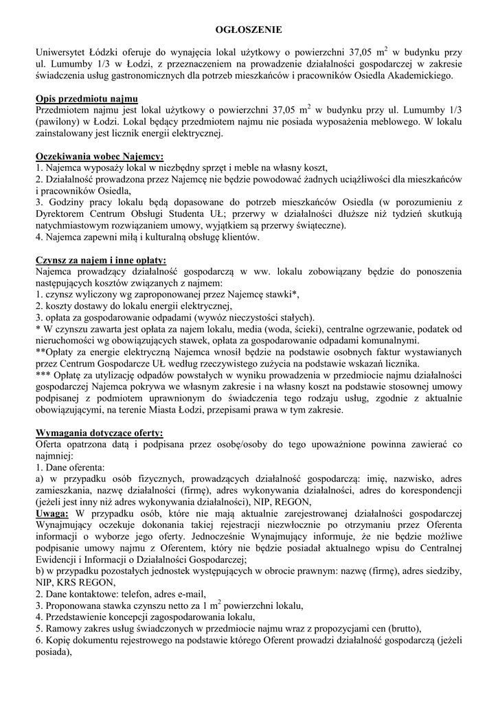 OGŁOSZENIE Uniwersytet Łódzki oferuje do wynajęcia lokal użytkowy o powierzchni 37,05 m2 w budynku przy ul. Lumumby 1/3 w Łodzi, z przeznaczeniem na prowadzenie działalności gospodarczej w zakresie świadczenia usług gastronomicznych dla potrzeb mieszkańców i pracowników Osiedla Akademickiego. Opis przedmiotu najmu Przedmiotem najmu jest lokal użytkowy o powierzchni 37,05 m2 w budynku przy ul. Lumumby 1/3 (pawilony) w Łodzi. Lokal będący przedmiotem najmu nie posiada wyposażenia meblowego. W lokalu zainstalowany jest licznik energii elektrycznej. Oczekiwania wobec Najemcy: 1. Najemca wyposaży lokal w niezbędny sprzęt i meble na własny koszt, 2. Działalność prowadzona przez Najemcę nie będzie powodować żadnych uciążliwości dla mieszkańców i pracowników Osiedla, 3. Godziny pracy lokalu będą dopasowane do potrzeb mieszkańców Osiedla (w porozumieniu z Dyrektorem Centrum Obsługi Studenta UŁ; przerwy w działalności dłuższe niż tydzień skutkują natychmiastowym rozwiązaniem umowy, wyjątkiem są przerwy świąteczne). 4. Najemca zapewni miłą i kulturalną obsługę klientów. Czynsz za najem i inne opłaty: Najemca prowadzący działalność gospodarczą w ww. lokalu zobowiązany będzie do ponoszenia następujących kosztów związanych z najmem: 1. czynsz wyliczony wg zaproponowanej przez Najemcę stawki*, 2. koszty dostawy do lokalu energii elektrycznej, 3. opłata za gospodarowanie odpadami (wywóz nieczystości stałych). * W czynszu zawarta jest opłata za najem lokalu, media (woda, ścieki), centralne ogrzewanie, podatek od nieruchomości wg obowiązujących stawek, opłata za gospodarowanie odpadami komunalnymi. **Opłaty za energie elektryczną Najemca wnosił będzie na podstawie osobnych faktur wystawianych przez Centrum Gospodarcze UŁ według rzeczywistego zużycia na podstawie wskazań licznika. *** Opłatę za utylizację odpadów powstałych w wyniku prowadzenia w przedmiocie najmu działalności gospodarczej Najemca pokrywa we własnym zakresie i na własny koszt na podstawie stosownej umowy podpisanej z podmiotem uprawnionym do świadczenia tego rodzaju usług, zgodnie z aktualnie obowiązującymi, na terenie Miasta Łodzi, przepisami prawa w tym zakresie. Wymagania dotyczące oferty: Oferta opatrzona datą i podpisana przez osobę/osoby do tego upoważnione powinna zawierać co najmniej: 1. Dane oferenta: a) w przypadku osób fizycznych, prowadzących działalność gospodarczą: imię, nazwisko, adres zamieszkania, nazwę działalności (firmę), adres wykonywania działalności, adres do korespondencji (jeżeli jest inny niż adres wykonywania działalności), NIP, REGON, Uwaga: W przypadku osób, które nie mają aktualnie zarejestrowanej działalności gospodarczej Wynajmujący oczekuje dokonania takiej rejestracji niezwłocznie po otrzymaniu przez Oferenta informacji o wyborze jego oferty. Jednocześnie Wynajmujący informuje, że nie będzie możliwe podpisanie umowy najmu z Oferentem, który nie będzie posiadał aktualnego wpisu do Centralnej Ewidencji i Informacji o Działalności Gospodarczej; b) w przypadku pozostałych jednostek występujących w obrocie prawnym: nazwę (firmę), adres siedziby, NIP, KRS REGON, 2. Dane kontaktowe: telefon, adres e-mail, 3. Proponowana stawka czynszu netto za 1 m2 powierzchni lokalu, 4. Przedstawienie koncepcji zagospodarowania lokalu, 5. Ramowy zakres usług świadczonych w przedmiocie najmu wraz z propozycjami cen (brutto), 6. Kopię dokumentu rejestrowego na podstawie którego Oferent prowadzi działalność gospodarczą (jeżeli posiada), 7. Ogólną prezentację Oferenta wraz z opisem dotychczas prowadzonej działalności oraz ewentualne referencje (o ile Oferent takowe posiada). W przypadku wątpliwości Uniwersytet Łódzki zastrzega sobie prawo do wezwania Oferenta do złożenia wyjaśnień lub unieważnienia konkursu bez podania przyczyny. Informacje ogólne 1. Liczba studentów zamieszkujących w Domach Studenckich Uniwersytetu Łódzkiego na terenie Osiedla Akademickiego: ok. 5000 osób. 2. Liczba pracowników Uniwersytetu Łódzkiego, pracujących na terenie Osiedla Akademickiego: ponad 100 osób. Informacje dodatkowe 1. Wynajmujący oczekuje, ze Najemca rozpocznie świadczenie usług w przedmiocie Najmu w ciągu 14 dni od dnia podpisania umowy najmu. 2. Najemca zobowiązany jest do sprzątania we własnym zakresie i na własny koszt przedmiotu najmu. 3. Najemca zobowiązany jest ponadto do utrzymywania w należytym stanie ternu przylegającego bezpośrednio do przedmiotu najmu oraz chodnika przed nim i terenu od strony zaplecza. Oznacza to m. in. regularne uprzątanie wszelkich nieczystości, liści, odśnieżanie i posypywanie solą/pisakiem chodnika. Wszelkie sankcje wynikające z nieprzestrzegania powyższego postanowienia będą obciążać Najemcę. 4. Kalkulując stawkę czynszu Oferent winien uwzględnić specyfikę funkcjonowania Osiedla Akademickiego (m. in. możliwość znacznego obniżenia przychodów ze sprzedaży w okresach przerw międzysemestralnych i wakacyjnych). 5. Wynajmujący nie przewiduje zmniejszenia wysokości czynszu w okresach przerw międzysemestralnych, świątecznych, czy też w okresie wakacji. 6. Najemca nie może bez uzyskania pisemnej zgody Wynajmującego dokonać zmiany rodzaju działalności gospodarczej świadczonej w przedmiocie najmu. Zgodę Wynajmującego Najemca zobowiązany jest uzyskać przed dokonaniem zmiany rodzaju działalności prowadzonej w przedmiocie najmu. 7. Najemcy nie wolno przenosić jakichkolwiek praw lub obowiązków wynikających z umowy najmu na osoby trzecie bez uzyskania uprzedniej pisemnej zgody Wynajmującego. 8. Najemcy nie wolno oddać całości lub części przedmiotu umowy w podnajem lub do bezpłatnego użytkowania. 9. Wynajmujący oczekuje, że Najemca będzie prowadził działalność w sposób ciągły (bez przerw dłuższych niż siedem kolejnych dni kalendarzowych). Miejsce i termin składania ofert