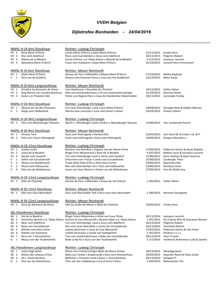 VVDH Belgien Dijletrofee Bonheiden - 24/04/2016 NWKL‐H (4‐6m) Stockhaar Richter: Ludwig Christoph VV VV VV VV Lando Mont D'Osiris x Gioia Mont D'Osiris Risco vom Suentelstein x Jessy vom Adelfurst Count Ustinov v.d. Ybajo Hoeve x Ghendi de la Béadrie Faust vom Hulsbach x Jaska Mont D'Osiris 1 2 3 4 Orna Mont D'Osiris Ona vom Adelfurst Oxbow de la Béadrie Ophaedra Mont D'Osiris NWKL‐R (4‐6m) Stockhaar Richter: Meyer Reinhardt VV 1 V 1 Horace du Parc a Mitrailles x Maeva Mont D'Osiris Dinoso vom Eisernen Kreuz x Lexa van het Gulderhof Otelo Mont D'Osiris Orry van de Gulderij NWKL‐R (4‐6m) Langstockhaar Richter: Meyer Reinhardt VV 1 VV 2 VV 3 Icon Adelhouse x Nouchka de l'Ezechel Max von loosbroekerhaus x Jill von loosbroekerzwinger Victor von Regina Pacis x Caya de Hooidonkse Watermolen Omalley du Domaine de Diane King Ramos von Loosbroekerhaus Gaiko v.d. Pluijmen Slot NWKL‐H (6‐9m) Stockhaar Richter: Ludwig Christoph VV 1 V 1 Yuri vom Osterberger Land x Lara Mont D'Osiris Macho vom Lamorak x Luna vom Sante's Home Oksana du Val des Pharaons Hippy vom Webachtal NWKL‐H (6‐9m) Langstockhaar Richter: Ludwig Christoph VV 1 Quirin v. Altenberger Land x Ondra v. Beyenburger Stausee Tess vom Beyenburger Stausee NWKL‐R (6‐9m) Stockhaar Richter: Meyer Reinhardt VV 1 VV 2 Gary vom Huhnegrab x Veneze Ellie Indro vom Hühnegrab x Dany vom Hühnegrab Veneze Toro Pirlo vom Team Hühnegrab NWKL‐H (9‐12m) Stockhaar Richter: Ludwig Christoph VV VV VV V V V V Romero von Bad‐Boll x Ungana von der Rieser Perle Ringo Crvni Mayestroso x Nani de la Beadrie Yuri vom Osterberger‐Land x Herta vom Suzyhof Schumann von Tronje x Lenka van Corsalabroek Frodo della Valle d'Itria x Kity black runner Nex vom Osterberber‐tal x Tami vom Gilkauertal Lexor van Haus Moons x Hester van de Waltahoeve 1 2 3 1 2 3 4 Juwika Justie Laora de la Beadrie Oeschi vom Suzyhof Oshin van Corsalabroek Ohana von Muikenshof Xhosa vom Gilkauertal Otie van de Waltahoeve NWKL‐H (9‐12m) Langstockhaar Richter: Ludwig Christoph VV 1 Horace du Parc a Mitrailles x Greco du Val d'Anzin Orka de l'Ezechel NWKL‐R (9‐12m) Stockhaar Richter: Meyer Reinhardt VV 1 Zeus vom Bierstadter Hof x Hera vom Haus Berendorf Otti vom Haus Berendorf NWKL‐R (9‐12m) Langstockhaar Richter: Meyer Reinhardt VV 1 Isko du Jardin de Mesoz x Moly de l'Ezéchel Oury du Domaine de Diane JKL‐Hündinnen Stockhaar Richter: Ludwig Christoph SG SG SG SG SG SG SG G Ringo Crveni Mayestoso x Hirka von haus Flicka Groovy di Casa Masserelli x Quanta‐Opal v.d. Ybajo Hoeve Yuri vom Osterberger Land x Jessy vom Adelfurst Ken vom team Baierblick x Lenka van Corsalabroek Juwika Destroyer x Uana di Casa Massarelli Juwika Destroyer x Cyndy von Gafiegerhof Tico von Loosbroekerhaus x Geke van Corsalabroek Bolle Ja Na Ka x Gura von der Teufelskehle 1 2 3 4 5 6 7 1 Jtm de la Beadrie Conchitta Quanta v.d. Ybajo Hoeve Noor vom Adelfurst Nuka van Corsalabroek Othella vom Haus Acker Odette von Santamar Nina van 't Genzokehuis Mocca von der Teufelskehle JKL‐Hündinnen Langstockhaar Richter: Ludwig Christoph SG SG SG G Remo vom Fichtenschlag x Bolla del Rione Antico Balto aus Famke's Zauberwald x Kara vom Glockenhaus Bellamie v. Praester‐Land x Gaya v. Huize Bardusa Thor von der Lobdeburg x Lina of Arne's Place 1 2 3 1 Catty Degli Achei Orlane des coteaux d'Aaz Jill v. Huize Bardusa Ona van de Arthishoeve 17/11/2015 20/11/2015 4 /12/2015 25/10/2015 Scubla Dino Pelgrims Robert Jourquin Laurent Lorand Pierre Emmanuel 27/10/2015 12/12/2015 Mathy Raphael Maes Sonja 23/12/2015 31/10/2015 19/11/2015 Fallier‐Delen Dierickx Dieter Lecompte Franky 10/08/2015 19/10/2015 Dereppe Nick & Goblet Myriam Peeters Glenn 11/08/2015 Van Londersele Pascal 31/07/2015 19/09/2015 Van Hout M. & Cullen J.G. & P. Knapen‐Reynders J. 27/04/2015 9 /07/2015 17/06/2015 27/06/2015 23/06/2015 25/06/2015 27/05/2015 Pedersen Karina & Raats Brigitte Babilas Louis & Jourquin Laurent Goris Stefaan & Goor Susanne Cauberghs Theo Buysmans ben Heirbaut Joost Van De Walle Guy 1 /05/2015 Fallier‐Delen 1 /06/2015 Heirman Georgette 22/05/2015 Crickx Anne 26/11/2014 1 /01/2015 10/12/2014 16/12/2014 27/01/2015 1 /01/2015 20/12/2014 3 /11/2014 Jourquin Laurent De Craene Wim & Seynaeve Wouter Pelgrims Robert Vanrijckel Rachel Pedersen Karina & Van Acker Fleskens J.L.J.L. Vaes‐Truyen Vanherck‐Aelterman Ludo & Sandra 19/12/2014 19/04/2015 30/12/2014 3 /02/2015 Mestdag Geert Dejardin Raoul & Cloes Josée Schipper P. Rietmaecker Ilse JKL‐Rüden Stockhaar Richter: Meyer Reinhardt SG 1 SG 2 Vaiko vom Suentelstein x Inga v. Haus Edmond Ken vom team Baierblick x Lenka van Corsalabroek Rudy v. Haus Edmond Nash van Corsalabroek JKL‐Rüden Langstockhaar SG 1 SG 2 JHKL‐Hündinnen Stockhaar Richter: Ludwig Christoph SG 1 SG 2 G 1 Horace du Parc à Mitrailles x Gioia Mont d'Osiris Black‐Jack von der Teufelskehle x Fly vom Kandonckhof Taro von Burg Tiersperg x Jesca von Karthago JHKL‐Rüden Stockhaar Richter: Meyer Reinhardt SG SG SG G Labo vom Schollweiher x Arika di Casa Lucchese Djambo vom Fichtenschlag x Eva du Val d'Anzin Leo von der Zenteiche x Fara vom Haus Thalie Yogi von der Schiffslache x Iris vom Schaale Tal 1 2 3 1 Kevin dei Colli Albani Nino du Parc à Mitrailles Jarco vom Haus Thalie Nate von Spitzbubeswinger JHKL‐Rüden Langstockhaar Richter: Meyer Reinhardt SG 1 Fulz di Zenevredo x Ghalia vom Glockenhaus Nelio vom Yarek GHKL‐Hündinnen Stokhaar Richter: Ludwig Christoph V V V Leo von der Zenteiche x Falke v.h. Boombos Pacco v Langenbungert x Opal v.d. Ybajo Hoeve Nash vom Welsetal x Wieke vom Heralmaborg 1 2 3 Pascal v.h. Boombos* Quanta Opal v.d. Ybajo Hoeve* Henna vom Heralmaborg GHKL‐Hündinnen Langstockhaar Richter: Ludwig Christoph V V Hagadahls Figo x Amy von der Zenteiche Leo von der Zenteiche x Cyndy v. Gafieger Hof 1 2 Jenny von Santamar* Myca von Santamar* GHKL‐Rüden Stockhaar Richter: Meyer Reinhardt V V V V V Yankee vom Feuermelder x Queeni vom Thermodos Luco van