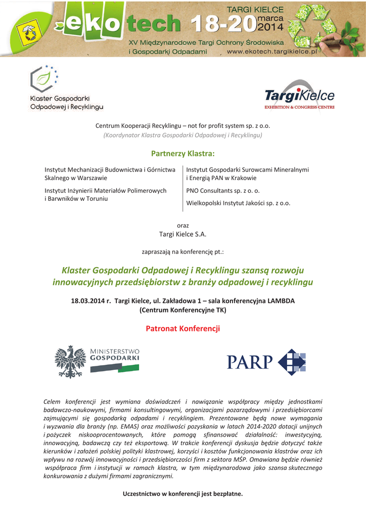 Centrum Kooperacji Recyklingu – not for profit system sp. z o.o. (Koordynator Klastra Gospodarki Odpadowej i Recyklingu) Partnerzy Klastra: Instytut Mechanizacji Budownictwa i Górnictwa Skalnego w Warszawie Instytut Gospodarki Surowcami Mineralnymi i Energią PAN w Krakowie Instytut Inżynierii Materiałów Polimerowych i Barwników w Toruniu PNO Consultants sp. z o. o. Wielkopolski Instytut Jakości sp. z o.o. oraz Targi Kielce S.A. zapraszają na konferencję pt.: Klaster Gospodarki Odpadowej i Recyklingu szansą rozwoju innowacyjnych przedsiębiorstw z branży odpadowej i recyklingu 18.03.2014 r. Targi Kielce, ul. Zakładowa 1 – sala konferencyjna LAMBDA (Centrum Konferencyjne TK) Patronat Konferencji Celem konferencji jest wymiana doświadczeń i nawiązanie współpracy między jednostkami badawczo-naukowymi, firmami konsultingowymi, organizacjami pozarządowymi i przedsiębiorcami zajmującymi się gospodarką odpadami i recyklingiem. Prezentowane będą nowe wymagania i wyzwania dla branży (np. EMAS) oraz możliwości pozyskania w latach 2014-2020 dotacji unijnych i pożyczek niskooprocentowanych, które pomogą sfinansować działalność: inwestycyjną, innowacyjną, badawczą czy też eksportową. W trakcie konferencji dyskusja będzie dotyczyć także kierunków i założeń polskiej polityki klastrowej, korzyści i kosztów funkcjonowania klastrów oraz ich wpływu na rozwój innowacyjności i przedsiębiorczości firm z sektora MŚP. Omawiana będzie również współpraca firm i instytucji w ramach klastra, w tym międzynarodowa jako szansa skutecznego konkurowania z dużymi firmami zagranicznymi. Uczestnictwo w konferencji jest bezpłatne. Program konferencji: Moderator: dr hab. Joanna Kulczycka, prof. nadzw. AGH (IGSMiE PAN w Krakowie) Prezes Klastra Gospodarki Odpadowej i Recyklingu 12.00-12.15 Otwarcie konferencji – powitanie 12.15-14.00 Kierunki i założenia polityki klastrowej w Polsce – Joanna Podgórska (PARP) Klastry i ich wpływ na indywidualny rozwój firm, instytucji oraz branży w regionie i w kraju – dr Maciej Woźniak (Wydział Zarządzania AGH) Dotacje unijne oraz pożyczki niskooprocentowane źródłem finansowania działalności innowacyjnej i gospodarczej podmiotów gospodarczych w perspektywie finansowej 2014-2020 – Beata Maczyszyn (PNO Consultants sp. z o.o.) Możliwości doradczo-informacyjne klastra wsparciem rozwoju firm z branży odpadowej i recyklingu – dr Przemysław Kurczewski (WIJ sp. z o.o.) Przerwa kawowa EMAS w nowych przepisach o odpadach – Maciej Krzyczkowski (GDOŚ) Współpraca z jednostkami B+R i uczelniami szansą na innowacyjny rozwój polskich przedsiębiorstw z sektora MŚP. Przykłady dobrych praktyk – Jarosław Stankiewicz (IMBiGS), Jacek Leszczyński (IIMPiB) Współpraca firm i instytucji w kraju i zagranicą szansą na skuteczne konkurowanie z firmami międzynarodowymi – ekspert KGOiR Klaster Gospodarki Odpadowej Recyklingu skutecznym partnerem w rozwoju firm z branży odpadowej i recyklingu w Polsce – Jolanta Okońska-Kubica (CKR- not for profit system sp. z o.o.) Dyskusja i zakończenie obrad 14.00-14.15 14.15-15.45 15.45-16.00 W trakcie targów EKOTECH 2014 zapraszamy Państwa do bezpłatnego PUNKTU INFORMACYJNODORADCZEGO Klastra Gospodarki Odpadowej i Recyklingu (Pawilon F nr 54). Przedstawiciele klastrowych jednostek badawczo-rozwojowych, uczelni oraz firm konsultingowych zapewnią Państwu fachowe doradztwo technologiczne, innowacyjne, inwestycyjne, rynkowe oraz dotacyjne. Rejestracja uczestników konferencji oraz zapisy na indywidualne konsultacje do dnia 11.03.2014 r. na stronie http://www.klasterodpadowy.com/page/konferencja-rejestracja Dodatkowe informacje: Jolanta Okońska-Kubica, Centrum Kooperacji Recyklingu - not for profit system sp. z o.o., Koordynator Klastra tel./fax + 48 81 748 52 50, mobile: +48 533 649 605, e-mail: [email protected] www.klasterodpadowy.com Do uczestnictwa w konferencji serdecznie zapraszamy: ü przedstawicieli mikro, małych i średnich firm zajmujących się zbieraniem, przetwarzaniem i recyklingiem surowców wtórnych, ü przedstawicieli firm produkcyjnych wykorzystujących lub planujących wykorzystywać do produkcji surowiec z odzysku, ü przedstawicieli firm produkujących maszyny, urządzenia i inne wyroby dla firm z branży odpadowej i recyklingu, ü organizacje pozarządowe i firmy konsultingowe wspierające recykling i sektor MŚP, ü jednostki B+R i przedstawicieli uczelni zajmujących się badaniami naukowymi, ich komercjalizacją i upowszechnianiem, ü pracowników gmin i jednostek samorządowych odpowiedzialnych za gospodarkę odpadami. Klaster Gospodarki Odpadowej i Recyklingu oraz Targi Kielce .S.A. zapraszają do PUNKTU INFORMACYJNO-DORADCZEGO Klastra Gospodarki Odpadowej i Recyklingu ( hala F) 18.03.2014 r. w godz.: 9.00-16.00 20.03.2014 w godz. 09.00-15.00 ZAPISY NA BEZPŁATNE KONSULTACJE Imię i nazwisko ………………..………………………………………………………………………….………… Firma…………………………….…………………………..…………………………..…………………….………… telefon ................................................e-mai:……………………....................................... Jestem zainteresowana/y spotkaniem z ekspertem Klastra Gospodarki Odpadowej i Recyklingu reprezentującym instytut/firmę*: □ □ □ □ □ □ □ □ □ Instytut Mechanizacji Budownictwa i Górnictwa Skalnego w Warszawie (www.imbigs.pl) Instytut Inżynierii Materiałów Polimerowych i Barwników w Toruniu (www. impib.pl) Instytut Gospodarki Surowcami Mineralnymi i Energią PAN w Krakowie (www.meeri.pl) PNO Consultants sp. z o. o. (www.pnocee.com) Wielkopolski Instytut Jakości sp. z o.o.( www.instytut.poznan.pl) Centrum Kooperacji Recyklingu – not for profit system sp. z o.o. -koordynator klastra (http://www.klasterodpadowy.com/page/koordynator) Wastech Recyklin