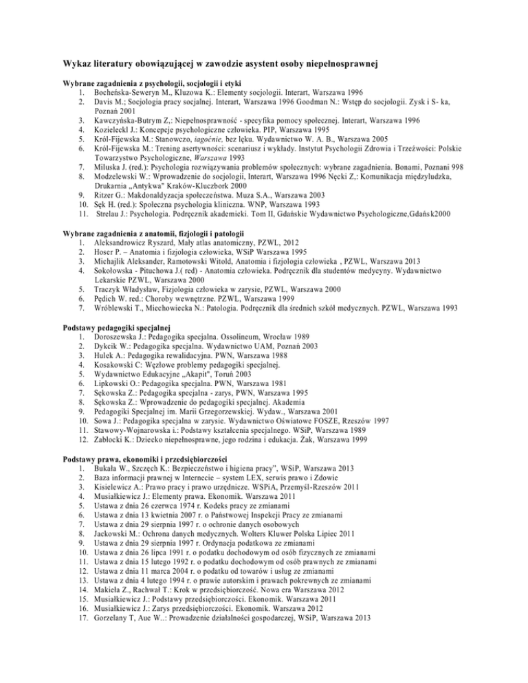 Wykaz literatury obowiązującej w zawodzie asystent osoby niepełnosprawnej Wybrane zagadnienia z psychologii, socjologii i etyki 1. Bocheńska-Seweryn M., Kluzowa K.: Elementy socjologii. Interart, Warszawa 1996 2. Davis M.; Socjologia pracy socjalnej. Interart, Warszawa 1996 Goodman N.: Wstęp do socjologii. Zysk i S- ka, Poznań 2001 3. Kawczyńska-Butrym Z,: Niepełnosprawność - specyfika pomocy społecznej. Interart, Warszawa 1996 4. Kozieleckl J.: Koncepcje psychologiczne człowieka. PIP, Warszawa 1995 5. Król-Fijewska M.: Stanowczo, iagoćnie, bez lęku. Wydawnictwo W. A. B., Warszawa 2005 6. Król-Fijewska M.: Trening asertywności: scenariusz i wykłady. Instytut Psychologii Zdrowia i Trzeźwości: Polskie Towarzystwo Psychologiczne, Warszawa 1993 7. Miluska J. (red.): Psychologia rozwiązywania problemów społecznych: wybrane zagadnienia. Bonami, Poznani 998 8. Modzelewski W.: Wprowadzenie do socjologii, Interart, Warszawa 1996 Nęcki Z,: Komunikacja międzyludzka, Drukarnia „Antykwa" Kraków-Kluczbork 2000 9. Ritzer G.: Makdonaldyzacja społeczeństwa. Muza S.A., Warszawa 2003 10. Sęk H. (red.): Społeczna psychologia kliniczna. WNP, Warszawa 1993 11. Strelau J.: Psychologia. Podręcznik akademicki. Tom II, Gdańskie Wydawnictwo Psychologiczne,Gdańs k2000 Wybrane zagadnienia z anatomii, fizjologii i patologii 1. Aleksandrowicz Ryszard, Mały atlas anatomiczny, PZWL, 2012 2. Hoser P. – Anatomia i fizjologia człowieka, WSiP Warszawa 1995 3. Michajlik Aleksander, Ramotowski Witold, Anatomia i fizjologia człowieka , PZWL, Warszawa 2013 4. Sokołowska - Pituchowa J.( red) - Anatomia człowieka. Podręcznik dla studentów medycyny. Wydawnictwo Lekarskie PZWL, Warszawa 2000 5. Traczyk Władysław, Fizjologia człowieka w zarysie, PZWL, Warszawa 2000 6. Pędich W. red.: Choroby wewnętrzne. PZWL, Warszawa 1999 7. Wróblewski T., Miechowiecka N.: Patologia. Podręcznik dla średnich szkół medycznych. PZWL, Warszawa 1993 Podstawy pedagogiki specjalnej 1. Doroszewska J.: Pedagogika specjalna. Ossolineum, Wrocław 1989 2. Dykcik W.: Pedagogika specjalna. Wydawnictwo UAM, Poznań 2003 3. Hulek A.: Pedagogika rewalidacyjna. PWN, Warszawa 1988 4. Kosakowski C: Węzłowe problemy pedagogiki specjalnej. 5. Wydawnictwo Edukacyjne „Akapit", Toruń 2003 6. Lipkowski O.: Pedagogika specjalna. PWN, Warszawa 1981 7. Sękowska Z.: Pedagogika specjalna - zarys, PWN, Warszawa 1995 8. Sękowska Z.: Wprowadzenie do pedagogiki specjalnej. Akademia 9. Pedagogiki Specjalnej im. Marii Grzegorzewskiej. Wydaw., Warszawa 2001 10. Sowa J.: Pedagogika specjalna w zarysie. Wydawnictwo Oświatowe FOSZE, Rzeszów 1997 11. Stawowy-Wojnarowska i.: Podstawy kształcenia specjalnego. WSiP, Warszawa 1989 12. Zabłocki K.: Dziecko niepełnosprawne, jego rodzina i edukacja. Żak, Warszawa 1999 Podstawy prawa, ekonomiki i przedsiębiorczości 1. Bukała W., Szczęch K.: Bezpieczeństwo i higiena pracy”, WSiP, Warszawa 2013 2. Baza informacji prawnej w Internecie – system LEX, serwis prawo i Zdowie 3. Kisielewicz A.: Prawo pracy i prawo urzędnicze. WSPiA, Przemyśl-Rzeszów 2011 4. Musiałkiewicz J.: Elementy prawa. Ekonomik. Warszawa 2011 5. Ustawa z dnia 26 czerwca 1974 r. Kodeks pracy ze zmianami 6. Ustawa z dnia 13 kwietnia 2007 r. o Państwowej Inspekcji Pracy ze zmianami 7. Ustawa z dnia 29 sierpnia 1997 r. o ochronie danych osobowych 8. Jackowski M.: Ochrona danych medycznych. Wolters Kluwer Polska Lipiec 2011 9. Ustawa z dnia 29 sierpnia 1997 r. Ordynacja podatkowa ze zmianami 10. Ustawa z dnia 26 lipca 1991 r. o podatku dochodowym od osób fizycznych ze zmianami 11. Ustawa z dnia 15 lutego 1992 r. o podatku dochodowym od osób prawnych ze zmianami 12. Ustawa z dnia 11 marca 2004 r. o podatku od towarów i usług ze zmianami 13. Ustawa z dnia 4 lutego 1994 r. o prawie autorskim i prawach pokrewnych ze zmianami 14. Makieła Z., Rachwał T.: Krok w przedsiębiorczość. Nowa era Warszawa 2012 15. Musiałkiewicz J.: Podstawy przedsiębiorczości. Ekono mik. Warszawa 2011 16. Musiałkiewicz J.: Zarys przedsiębiorczości. Ekonomik. Warszawa 2012 17. Gorzelany T, Aue W..: Prowadzenie działalności gospodarczej, WSiP, Warszawa 2013 18. 19. 20. 21. 22. 23. 24. 25. 26. Ustawa z dnia 19 listopada 1999 r. Prawo działalności gospodarczej ze zmianami Ustawa z dnia 2 lipca 2004 r. o swobodzie działalności gospodarczej ze zmianami Ustawa z dnia 20 sierpnia 1997 r. o Krajowym Rejestrze Sądowym ze zmianami Ustawa z dnia 15 września 2000 r. Kodeks spółek handlowych ze zmianami Ustawa z dnia 13 października 1998 r. o systemie ubezpieczeń społecznych ze zmianami Leowski J.: Polityka zdrowotna a zdrowie publiczne. Ochrona zdrowia w gospodarce rynkowej”. CeDeWu 2010 Świderska G.K.:Rachunek kosztów z Zakładzie Opieki Zdrowotnej. Warszawa 2011 Ustawa z dnia 27 sierpnia 2004 r. o świadczeniach opieki zdrowotnej finansowanych ze środków publicznych. Ustawa z dnia 15 kwietnia 2011 roku o działalności leczniczej. Polityka społeczna 1. Auieytner J., Głąbicka K.: Polskie kwestie socjalne na przełomie wieków. Elipsa, Warszawa 2001 2. Auieytner J.: Głąbicka K.: Polityka społeczna pomiędzy opiekuńczością a pomocniczością. WSiP, Warszawa 2000 3. Auieytner J.: Polityka społeczna teoria i organizacja. TWP, Warszawa 2000 4. Auieytner J.: Polityka społeczna, czyli ujarzmienie chaosu socjalnego. Wyd. WSP, Warszawa 2000 5. Barr N.: Ekonomika polityki społecznej. Wyd. AE, Poznań 1993 Głąbicka K.: Polityka społeczna w Unii Europejskiej - aspekty aksjologiczne i empiryczn 6. Elipsa, Warszawa 2000 Golinowska S.: (red.): Polska bieda II: kryteria, ocena, przeciwdziałanie. IPiSS, Warszawa 1997 7. Firlit-Fesnak G., Szylko-Skoczny M.: Polityka społeczna. Wyd. PWN, Warszawa 2008 8. Golinowska S.: Polityka społeczna - koncepcje, instytucje, koszty. Poltext, Warszawa 2000 9. Gorczycka E.: Polityka społeczna wobec osób niepełnosprawnych. Wydaw. PC, Częstochowa 1992 10. Januszek H.: Aksjologiczne 