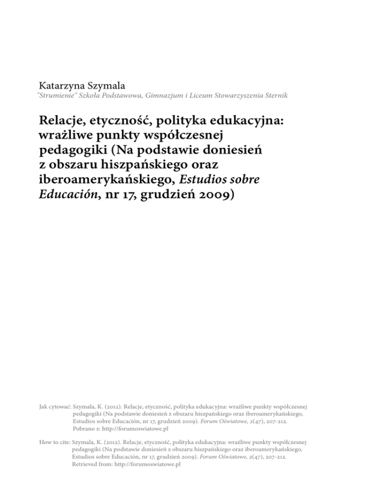 Katarzyna Szymala "Strumienie" Szkoła Podstawowa, Gimnazjum i Liceum Stowarzyszenia Sternik Relacje, etyczność, polityka edukacyjna: wrażliwe punkty współczesnej pedagogiki (Na podstawie doniesień z obszaru hiszpańskiego oraz iberoamerykańskiego, Estudios sobre Educación, nr 17, grudzień 2009) Jak cytować: Szymala, K. (2012). Relacje, etyczność, polityka edukacyjna: wrażliwe punkty współczesnej pedagogiki (Na podstawie doniesień z obszaru hiszpańskiego oraz iberoamerykańskiego, Estudios sobre Educación, nr 17, grudzień 2009). Forum Oświatowe, 2(47), 207-212. Pobrano z: http://forumoswiatowe.pl How to cite: Szymala, K. (2012). Relacje, etyczność, polityka edukacyjna: wrażliwe punkty współczesnej pedagogiki (Na podstawie doniesień z obszaru hiszpańskiego oraz iberoamerykańskiego, Estudios sobre Educación, nr 17, grudzień 2009). Forum Oświatowe, 2(47), 207-212. Retrieved from: http://forumoswiatowe.pl Nasza rodzima pedagogika poddawana jest nieustannie od dłuższego czasu wielorakim napięciom z tego powodu, że różnym napięciom poddawana jest szkoła. Wycofywanie się rodziców z odpowiedzialności za wychowanie dzieci, a więc ze współpracy ze szkołą, nieefektywność pedagogicznych działań, a także (pozorne?) fiasko tradycyjnego podejścia do kształcenia wobec wymagań neoliberalnej rzeczywistości stanowią jedną – być może bardziej zauważalną – stronę rzeczywistości. Pedagogikę trawi rozdział od klasycznie pojmowanej polityki, co skutkuje postulatami znalezienia sposobu na etycznie zaangażowaną praxis edukacyjną1. Jednocześnie myśleniu o oświacie towarzyszą artykułowane wobec niej na różny sposób oczekiwania – m.in. potrzeba przekazywania nadziei2 czy portretowania dobrych praktyk, które byłyby impulsem do działania dla innych placówek. Przed szkołą rysuje się więc trudne zadanie. Prawdopodobnie w żadnej innej instytucji publicznej nie pokładano nigdy tak wielkich nadziei. I jednocześnie prawdopodobnie żadna inna instytucja nie zawiodła tak boleśnie tych oczekiwań. Można więc zaryzykować stwierdzenie, że rewitalizacja pedagogiki oznaczałaby ponowne określenie celu i kierunku swoich działań. W wymiarze praktycznym zaś: wyodrębnienie życiodajnej siły płynącej z konkretnych udanych działań edukacyjnych oraz indeksowanie dobrych zachowań. Warto się dowiedzieć, czy te „wrażliwe” – jeśli można tak powiedzieć – punkty pedagogiki obecne są również w perspektywie innych krajów. Podstawą do tych rozważań będzie analiza treści 17. numeru Estudios sobre Educación (ESE, Studia nad Edukacją) z grudnia 2009 roku – czasopisma naukowego wydawanego co semestr przez Uniwersytet w Nawarze (Hiszpania). Celem tej pracy jest wyłonienie z publikacji dominujących wątków, najczęściej pojawiających się tez oraz wniosków. Na początku kilka uwag o charakterze ogólnym, które pozwolą się lepiej zorientować w ramach instytucjonalnych opisywanego przedsięwzięcia3. Zasięg czasopisma (ESE) wykracza daleko ponad obszar jednego państwa. Redakcja publikuje również materiały z badań empirycznych oraz rozprawy z krajów kręgu iberoamerykańskiego4, co uzupełnia perspektywę pedagogiki europejskiej o zwykle mało dostępne dane5. Wzorem wielu publikacji naukowych, również i tutaj obowiązuje podział na rozprawy (teoretyczne, wyniki badań), artykuły o mniejszym ciężarze gatunkowym oraz recenzje. Część zamieszczonych w numerze prac stanowi fragment wieloletnich projektów rządowych, co pozwala na konceptualizację głównych kierunków polityki edukacyjnej państw, z których pochodzą prezentowane teksty. Sam zaś dobór materiałów wskazuje raczej na dominację praktycznego (pragmatycznego) podejścia autorów do omawianej tematyki edukacyjnej nad czysto teoretycznymi rozprawami, choć i takie można tutaj znaleźć6. Relacje, etyczność, polityka edukacyjna: oto kluczowe kategorie – klamry spinające zamieszczone w tym numerze ESE teksty. W rzeczywistości stanowią one interpretacyjną całość, choć można je również do pewnego stopnia wyabstrahować i rozpatrywać osobno. Relacje zawsze nasycone się etycznym (bądź nieetycznym) zabarwieniem, zaś polityczność rozumiana jest tutaj jako poszukiwanie oraz utrwalanie sposobów działania uważanych za społecznie korzystne – czy po prostu moralnie dobre. Analiza poszczególnych artykułów pozwala na następującą uwagę: w pedagogii 208 Forum Oświatowe Recenzje coraz bardziej wysuwa się na pierwszy plan umiejętność nawiązywania dobrych relacji między uczniami oraz uczniów z nauczycielami. I odwrotnie: negatywne postawy i zachowania w szkole są często konsekwencją nieudanych relacji intrapersonalnych i interpersonalnych, a także skutkiem zaniedbania odpowiedniego przygotowania nauczycieli w tej dziedzinie. Autorzy prac poddają analizie kilka niepożądanych zjawisk obecnych na różnych etapach kształcenia – m.in. nieuczciwość studentów (ściąganie na egzaminach pisemnych – Hiszpania), brak życzliwości wśród rówieśników w szkole (przemoc, konflikty – Hiszpania), a także (w innym porządku) relacje profesorów akademickich z pracownikami bibliotek w zakresie pozyskiwania informacji źródłowych oraz przekazywania tej umiejętności studentom (Wielka Brytania). Nawiązywanie relacji/ komunikatywność staje się dominującym wyzwaniem praktycznym, wobec którego relacje instytucjonalne (przekaz, jaki niesie szkoła jako instytucja) nie mogą pozostać obojętne. Pociąga to za sobą dyskusję nad kulturą szkoły, autorytetem nauczyciela oraz przewagą strategii wzmacniających pozytywną samoocenę ucznia nad czysto represyjną polityką koncentrującą się wyłącznie na zaostrzaniu dyscypliny. W czasopiśmie pojawiają się pomysły na zacieśnianie więzi w społecznościach uczących się oraz na etyczne zasady postępowania. Warto wymienić niektóre z nich: 