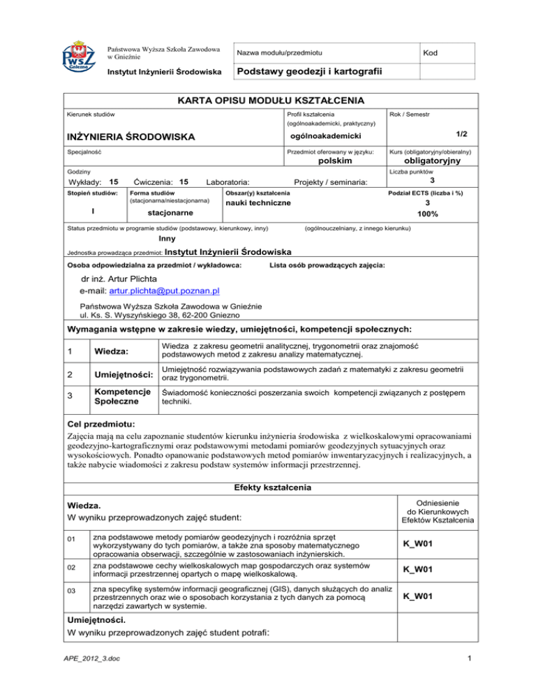 Państwowa Wyższa Szkoła Zawodowa w Gnieźnie Nazwa modułu/przedmiotu Instytut Inżynierii Środowiska Podstawy geodezji i kartografii Kod KARTA OPISU MODUŁU KSZTAŁCENIA Kierunek studiów Profil kształcenia Rok / Semestr (ogólnoakademicki, praktyczny) 1/2 ogólnoakademicki INŻYNIERIA ŚRODOWISKA Specjalność Przedmiot oferowany w języku: Kurs (obligatoryjny/obieralny) polskim obligatoryjny Liczba punktów Godziny Wykłady: 15 Stopień studiów: I Ćwiczenia: 15 Laboratoria: Forma studiów (stacjonarna/niestacjonarna) 3 Projekty / seminaria: Obszar(y) kształcenia Podział ECTS (liczba i %) nauki techniczne 3 100% stacjonarne Status przedmiotu w programie studiów (podstawowy, kierunkowy, inny) Liczba punktów (ogólnouczelniany, z innego kierunku) Inny Jednostka prowadząca przedmiot: Instytut xx Inżynierii Środowiska Osoba odpowiedzialna za przedmiot / wykładowca: xxx Lista osób prowadzących zajęcia: dr inż. Artur Plichta e-mail: [email protected] Państwowa Wyższa Szkoła Zawodowa w Gnieźnie ul. Ks. S. Wyszyńskiego 38, 62-200 Gniezno Wymagania wstępne w zakresie wiedzy, umiejętności, kompetencji społecznych: Wiedza z zakresu geometrii analitycznej, trygonometrii oraz znajomość podstawowych metod z zakresu analizy matematycznej. 1 Wiedza: 2 Umiejętności: oraz trygonometrii. 3 Kompetencje Społeczne Umiejętność rozwiązywania podstawowych zadań z matematyki z zakresu geometrii Świadomość konieczności poszerzania swoich kompetencji związanych z postępem techniki. Cel przedmiotu: Zajęcia mają na celu zapoznanie studentów kierunku inżynieria środowiska z wielkoskalowymi opracowaniami geodezyjno-kartograficznymi oraz podstawowymi metodami pomiarów geodezyjnych sytuacyjnych oraz wysokościowych. Ponadto opanowanie podstawowych metod pomiarów inwentaryzacyjnych i realizacyjnych, a także nabycie wiadomości z zakresu podstaw systemów informacji przestrzennej. Efekty kształcenia Wiedza. W wyniku przeprowadzonych zajęć student: 01 02 03 Odniesienie do Kierunkowych Efektów Kształcenia zna podstawowe metody pomiarów geodezyjnych i rozróżnia sprzęt wykorzystywany do tych pomiarów, a także zna sposoby matematycznego opracowania obserwacji, szczególnie w zastosowaniach inżynierskich. K_W01 zna podstawowe cechy wielkoskalowych map gospodarczych oraz systemów informacji przestrzennej opartych o mapę wielkoskalową. K_W01 zna specyfikę systemów informacji geograficznej (GIS), danych służących do analiz przestrzennych oraz wie o sposobach korzystania z tych danych za pomocą narzędzi zawartych w systemie. K_W01 Umiejętności. W wyniku przeprowadzonych zajęć student potrafi: APE_2012_3.doc 1 Państwowa Wyższa Szkoła Zawodowa w Gnieźnie Nazwa modułu/przedmiotu Instytut Inżynierii Środowiska Podstawy geodezji i kartografii Kod K_U16 01 obsługiwać sprzęt geodezyjny i wykonywać pomiary zgodnie z zasadami przyjętymi w geodezji. 02 wykorzystywać dane pomiarowe do obliczenia wielkości geometrycznych opisujących mierzony obiekt oraz obliczać wielkości służące do wyniesienia projektu w teren, K_U13 03 odczytywać mapę lub zbiór danych przestrzennych oraz korzystać z pozyskanej informacji do wykonania analiz przestrzennych. K_U14 K_U16 Kompetencje społeczne. W wyniku przeprowadzonych zajęć student zdobędzie następujące kompetencje: 01 zrozumie potrzebę permanentnego kształcenia się i przekazywania w sposób zrozumiały informacji z najbliższym otoczeniem w działalności zawodowej; K_K01 02 zrozumie pozatechniczne ( w tym ekologiczne) skutki swojego działania i jego wpływu na środowisko; K_K02 wypracuje w sobie zdolność działania integralnego i twórczego. K_K06 03 Sposoby sprawdzenia efektów kształcenia sprawdzian problemowy z zakresu wykorzystania metod pomiarowych lub materiałów kartograficznych w celu rozwiązania zagadnienia inżynierskiego – 1 godz. w połowie semestru, sprawdzian z wiedzy o GIS, źródłach danych przestrzennych i sposobach przetwarzania informacji (analiz) – 1 godz. na koniec semestru, wykonanie poszczególnych zadań pomiarowo-obliczeniowych – sukcesywnie w ramach ćwiczeń oraz wykonanie operatów pomiarowo – obliczeniowych, wykonanie i obrona projektu wykorzystującego dane pomiarowe i kartograficzne oraz obliczenia – rozliczenie na koniec semestru. Treści programowe Informacja przestrzenna w praktyce inżynierskiej. Przestrzeń geodezyjna, układy współrzędnych, klasyfikacja pomiarów geodezyjnych. Mapa jako źródło informacji przestrzennej. Klasyfikacja map ze względu na kryterium treści i skale opracowań. Metodyka prezentacji kartograficznej. Systemy informacji przestrzennej. Prace inżynierskie w funkcji informacji przestrzennej. Wartość nieruchomości jako atrybut w systemie informacji o terenie. Istota powszechnej taksacji nieruchomości. Ład przestrzenny i gospodarka przestrzenna. Metody pomiarów sytuacyjnych i wysokościowych. Posługiwanie się instrumentami geodezyjnymi. Geodezyjne techniki nawigacji satelitarnej i skaningu laserowego. Metody fotogrametryczne w pozyskiwaniu i przetwarzaniu informacji o terenie. Zdjęcia lotnicze i satelitarne do celów pomiarowych i fotointerpretacyjnych. Fotomapy, ortofotomapy, mapy kreskowe oraz tematyczne. Państwowy zasób geodezyjny i kartograficzny. Ośrodki dokumentacji geodezyjnej i kartograficznej. Mapa zasadnicza. Elementy ewidencji gruntów i budynków, księgi wieczyste, miejscowy plan zagospodarowania przestrzennego. Geodezyjna ewidencja sieci uzbrojenia terenu. Zespoły uzgadniania dokumentacji projektowej. Geodezyjne pomiary realizacyjna; osnowy realizacyjne, tyczenie i obsługa budowy, pomiary powykonawcze i kontrolne. Literatura podstawowa: 1) 2) Wójcik M., Wyczałek I., - Geodezja, WPP, Poznań 2004 Przewłocki S. Geodezja dla inżynierii Środowiska, PWSZ, Warszawa 1997 APE_2012_3.doc 2 Państwowa Wyższa Szkoła Zawodowa w Gnieźnie Nazwa modułu/przedmiotu Instytut Inżynierii Środowiska P