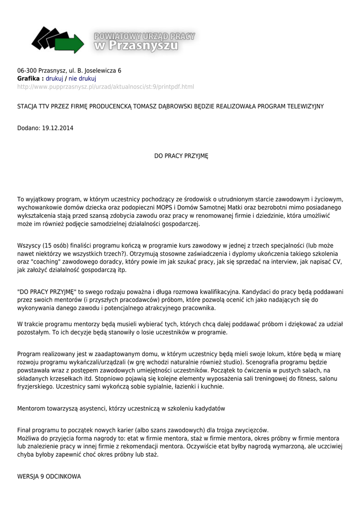 06-300 Przasnysz, ul. B. Joselewicza 6 Grafika : drukuj / nie drukuj http://www.pupprzasnysz.pl/urzad/aktualnosci/st:9/printpdf.html STACJA TTV PRZEZ FIRMĘ PRODUCENCKĄ TOMASZ DĄBROWSKI BĘDZIE REALIZOWAŁA PROGRAM TELEWIZYJNY Dodano: 19.12.2014 DO PRACY PRZYJMĘ To wyjątkowy program, w którym uczestnicy pochodzący ze środowisk o utrudnionym starcie zawodowym i życiowym, wychowankowie domów dziecka oraz podopieczni MOPS i Domów Samotnej Matki oraz bezrobotni mimo posiadanego wykształcenia stają przed szansą zdobycia zawodu oraz pracy w renomowanej firmie i dziedzinie, która umożliwić może im również podjęcie samodzielnej działalności gospodarczej. Wszyscy (15 osób) finaliści programu kończą w programie kurs zawodowy w jednej z trzech specjalności (lub może nawet niektórzy we wszystkich trzech?). Otrzymują stosowne zaświadczenia i dyplomy ukończenia takiego szkolenia oraz "coaching" zawodowego doradcy, który powie im jak szukać pracy, jak się sprzedać na interview, jak napisać CV, jak założyć działalność gospodarczą itp. "DO PRACY PRZYJMĘ" to swego rodzaju poważna i długa rozmowa kwalifikacyjna. Kandydaci do pracy będą poddawani przez swoich mentorów (i przyszłych pracodawców) próbom, które pozwolą ocenić ich jako nadających się do wykonywania danego zawodu i potencjalnego atrakcyjnego pracownika. W trakcie programu mentorzy będą musieli wybierać tych, których chcą dalej poddawać próbom i dziękować za udział pozostałym. To ich decyzje będą stanowiły o losie uczestników w programie. Program realizowany jest w zaadaptowanym domu, w którym uczestnicy będą mieli swoje lokum, które będą w miarę rozwoju programu wykańczali/urządzali (w grę wchodzi naturalnie również studio). Scenografia programu będzie powstawała wraz z postępem zawodowych umiejętności uczestników. Początek to ćwiczenia w pustych salach, na składanych krzesełkach itd. Stopniowo pojawią się kolejne elementy wyposażenia sali treningowej do fitness, salonu fryzjerskiego. Uczestnicy sami wykończą sobie sypialnie, łazienki i kuchnie. Mentorom towarzyszą asystenci, którzy uczestniczą w szkoleniu kadydatów Finał programu to początek nowych karier (albo szans zawodowych) dla trojga zwycięzców. Możliwa do przyjęcia forma nagrody to: etat w firmie mentora, staż w firmie mentora, okres próbny w firmie mentora lub znalezienie pracy w innej firmie z rekomendacji mentora. Oczywiście etat byłby nagrodą wymarzoną, ale uczciwiej chyba byłoby zapewnić choć okres próbny lub staż. WERSJA 9 ODCINKOWA CZAS TRWANIA ODCINKA 44’ ILOŚĆ ODCINKÓW W SERII - 9 UCZESTNICY ● ● 10 KOBIET W WIEKU OD 18 DO 30 LAT 10 MĘŻCZYZN W WIEKU OD 18 DO 30 LAT MISTRZOWIE / MENTORZY: FRYZJER http://dobrawahouseofhair.pl LUB http://www.berendowicz-kublin.pl STOLARZ/MALARZ/KAFELKARZ - ZŁOTA RĄCZKA DOMINIK STRZELEC INSTRUKTOR FITNESS https://www.youtube.com/watch?v=HNiHUC4GowA LUB http://www.ifaa.pl/zapowiedzi/340-magdalena-prieditis-ifaa-polska.html https://www.youtube.com/watch?v=kNx7IAu978Y SCHEMAT ROBOCZY PROGRAMU: 1 ODCINEK- MENTORZY NA CASTINGACH ● WYBIERAMY 20 OSÓB (WIZYTÓWKI) 2 ODCINEK- SPOTKANIE Z MENTORAMI ● ● ● PROSTE ZADANIA PRAKTYCZNE OCENIAJĄCE PREDYSPOZYCJE PIERWSZA SELEKCJA PO ZAJĘCIACH POZWALAJĄCYCH OCENIĆ PREDYSPOZYCJE PSYCHOFIZYCZNE DO ZAWODU, MOTORYKĘ, ZDOLNOŚCI MANUALNE I KOORDYNACJĘ ZOSTAJE 15 OSÓB 3 ODCINEK- CAŁA PIĘTNASTKA WYKONUJE PROSTE ZADANIA ZAWODOWE W KAŻDEJ SPECJALNOŚCI. ● ● UCZESTNICY NA OCHOTNIKA ZGŁASZAJĄ SIĘ DO WYBRANYCH SPECJALNOŚCI. KAŻDEGO Z OCHOTNIKÓW CZEKA ZADANIE WYMYŚLONE PRZEZ MENTORA. NASTĘPNIE MENTORZY ZAPRASZAJĄ DO WYKONANIA SWOICH ZADAŃ UPATRZONYCH PRZEZ SIEBIE UCZESTNIKÓW 4 ODCINEK - MENTORZY WYBIERAJĄ "SWOICH" ● ● ● ● GRUPA ROZDZIELONA ZOSTAJE NA TRZY 5 OSOBOWE ZESPOŁY ZAJĘCIA Z MENTORAMI W PODGRUPACH PIERWSZE SZLIFY ZAWODOWE - PODSTAWY KURSU MENTORZY MOGĄ WYMIENIĆ PO 1-2 UCZESTNIKÓW - ODBYWA SIĘ COŚ W RODZAJU "HEAD HUNTING" 5 ODCINEK- PIERWSZE KONKURENCJE ● ● ● ● ● ● ● UCZESTNICY W 5 OSOBOWYCH GRUPACH ZAWODOWYCH PRZYGOTOWUJĄ SIĘ DO PROSTEGO KONKURSU KONKURS PRZY UDZIALE KOLEGÓW Z POZOSTAŁYCH GRUP: FRYZJERZY CZESZĄ ZŁOTE RĄCZKI, ZŁOTE RĄCZKI KŁADĄ GLAZURĘ LUB TAPETĘ INSTRUKTORZY FITNESS "ĆWICZĄ" FRYZJERÓW I ZŁOTE RĄCZKI KOLEDZY "NOMINUJĄ" NAJLEPSZE I NAJGORSZE ZAJĘCIA I FRYZURY ORAZ NAJLEPSZE I NAJGORSZE PRACE ZŁOTYCH RĄCZEK MENTORZY PODEJMUJĄ DECYZJE I WYBIERAJĄ PO 4 OSOBY ZOSTAJE 12 OSÓB 6 ODCINEK - KOLEJNE KONKURENCJE ● ● UCZESTNICY PRZYGOTOWUJĄ SIĘ DO NASTĘPNEGO KONKURSU KONKURS PRZY UDZIALE KOLEGÓW Z POZOSTAŁYCH GRUP: FRYZJERZY CZESZĄ ZŁOTE RĄCZKI INSTRUKTORZY FITNESS "ĆWICZĄ" FRYZJERÓW I ZŁOTE RĄCZKI, ZŁOTE RĄCZKI MONTUJĄ SZAFKI W KUCHNI NA CZAS KOLEDZY "NOMINUJĄ" NAJLEPSZE I NAJGORSZE ZAJĘCIA I FRYZURY ORAZ NAJLEPSZE I NAJGORSZE PRACE ZŁOTYCH RĄCZEK MENTORZY PODEJMUJĄ DECYZJE I WYBIERAJĄ PO 3 OSOBY ZOSTAJE 9 OSÓB ❍ ❍ ● ● ● ● 7 ODCINEK - OD TEGO ODCINKA JESTEŚMY ŚWIADKAMI SZKOLENIA UCZESTNIKÓW W MAŁYCH ZESPOŁACH ZAWODOWYCH ● ● MIĘDZY MENTOREM I UCZESTNIKIEM POJAWIA SIĘ RELACJA MISTRZ-UCZEŃ WIZYTA W DOMACH RODZINNYCH UCZESTNIKÓW. POZNAJEMY BLIŻEJ ŚRODOWISKO, W KTÓRYM ŻYJĄ, EW. DORASTALI. POZNAJEMY ICH PRZYJACIÓŁ, RODZICÓW. UCZESTNICY PREZENTUJĄ BLISKIM NABYTE UMIEJĘTNOŚCI NAPRAWIAJĄ KRAN LUB DRZWI, STRZYGĄ KOLEGĘ, "TRENUJĄ" POKAZOWO DZIECIAKI Z PODWÓRKA 8 ODCINEK - CAŁA DZIEWIĄTKA UCZESTNICZY W SZKOLENIU "W TERENIE". ● ● ● SZKOLENIE Z POSZUKIWANIA PRACY - OGŁOSZENIA, AUTOPREZENTACJA, INTERVIEW, CV, LIST MOTYWACYJNY ITD. ZASTĘPSTWA "PO ZNAJOMOŚCI" - UCZESTNICY BIORĄ ZASTĘPSTWO ZA ZAWODOWYCH KOLEGÓW I PRACUJĄ W SALONIE FRYZJERSKIM, JAKO ZŁOTA RĄCZKA Z OGŁOSZENIA I W KLUBIE FITNESS. WSZYSTKIE TE PRACE PODGLĄDAMY TAK, JAK W PROGRAMIE USTERKA, UKRYTYCH PRZED WZROKIEM UCZESTKÓW KAMER. POZ WYKONANIU ZADAŃ MENTORZY OCENIAJ