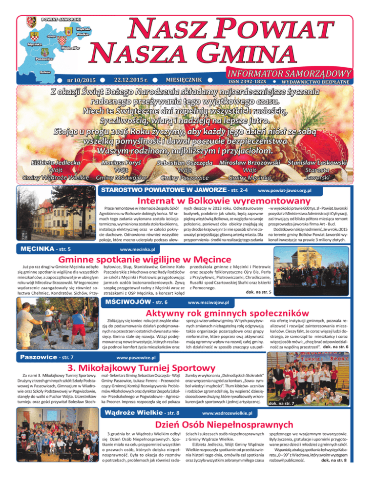 POWIAT JAWORSKI NASZ POWIAT NASZA GMINA Wądroże Męcinka Mściwojów Paszowice Bolków ● ● nr 10/2015 22.12.2015 r. ● MIESIĘCZNIK ● INFORMATOR SAMORZĄDOWY ● Wielkie Jawor ISSN 2392-182X WYDAWNICTWO BEZPŁATNE Z okazji Świąt Bożego Narodzenia składamy najserdeczniejsze życzenia radosnego przeżywania tego wyjątkowego czasu. Niech te Świąteczne dni napełnią wszystkich radością, życzliwością, wiarą i nadzieją na lepsze jutro. Stojąc u progu 2016 Roku życzymy, aby każdy jego dzień niósł ze sobą wszelką pomyślność i dawał poczucie bezpieczeństwa Waszym rodzinom, najbliższym i przyjaciołom. Elżbieta Jedlecka Wójt Gminy Wądroże Wielkie Mariusz Foryś Wójt Gminy Mściwojów Sebastian Oszczęda Wójt Gminy Paszowice Mirosław Brzozowski Wójt Gminy Męcinka STAROSTWO POWIATOWE W JAWORZE - str. 2-4 Stanisław Laskowski Starosta Jaworski www.powiat-jawor.org.pl Internat w Bolkowie wyremontowany Prace remontowe w internacie Zespołu Szkół Agrobiznesu w Bolkowie dobiegły końca. W ramach tego zadania wykonana została izolacja termiczna, wymieniona została stolarka okienna, instalacja elektrycznej oraz w całości pokrycie dachowe. Odnowiono również wszystkie pokoje, które mocno ucierpiały podczas ulew- MĘCINKA - str. 5 nych deszczy w 2013 roku. Odrestaurowany budynek, podobnie jak szkoła, będą zapewne piękną wizytówką Bolkowa, ze względu na swoje położenie, ponieważ oba obiekty znajdują się przy drodze krajowej nr 5 i nie sposób ich nie zauważyć przejeżdżając główną arterią miasta. Dla przypomnienia - środki na realizację tego zadania - w wysokości prawie 600 tys. zł - Powiat Jaworski pozyskał z Ministerstwa Administracji i Cyfryzacji, zaś trwający od blisko półtora miesiąca remont przeprowadza jaworska firma Art - Bud. Dodatkowo należy nadmienić, że w roku 2015 na terenie gminy Bolków Powiat Jaworski wykonał inwestycje na prawie 3 miliony złotych. www.mecinka.pl Gminne spotkanie wigilijne w Męcince Już po raz drugi w Gminie Męcinka odbyło się gminne spotkanie wigilijne dla wszystkich mieszkańców, a zapoczątkował je w ubiegłym roku wójt Mirosław Brzozowski. W tegoroczne wydarzenie zaangażowały się również sołectwa Chełmiec, Kondratów, Sichów, Przy- byłowice, Słup, Stanisławów, Gminne Koło Pszczelarskie z Muchowa oraz Rady Rodziców ze szkół z Męcinki i Piotrowic przygotowując jarmark ozdób bożonarodzeniowych. Żywą szopkę przygotował radny z Męcinki wraz ze strażakami z OSP Męcinka, a koncert kolęd MŚCIWOJÓW - str. 6 przedszkola gminne z Męcinki i Piotrowic oraz zespoły folklorystyczne Ojry Bis, Perła z Przybyłowic, Piotrowiczanki, Chrośliczanie, Rusałki spod Czartowskiej Skałki oraz Iskierki z Pomocnego. dok. na str. 5 www.msciwojow.pl Aktywny rok gminnych społeczników Zbliżający się koniec roku jest zwykle okazją do podsumowania działań podejmowanych na przestrzeni ostatnich dwunastu miesięcy. Gmina stale się rozwija. Wciąż podejmowane są nowe inwestycje, których realizacja podnosi komfort życia mieszkańców oraz Paszowice - str. 7 sprzyja wizerunkowi gminy. W tych pozytywnych zmianach niebagatelną rolę odgrywają także organizacje pozarządowe oraz grupy nieformalne, które poprzez swą aktywność mają ogromny wpływ na rozwój całej gminy. Ich działalność w sposób znaczący uzupeł- nia ofertę instytucji gminnych, pozwala realizować i rozwijać zainteresowania mieszkańców. Cieszy fakt, że coraz więcej ludzi dostrzega, że samorząd to mieszkańcy i coraz więcej osób mówi: „chcę brać odpowiedzialność za wspólną przestrzeń”. dok. na str. 6 www.paszowice.pl 3. Mikołajkowy Turniej Sportowy Za nami 3. Mikołajkowy Turniej Sportowy. Drużyny z trzech gminnych szkół: Szkoły Podstawowej w Paszowicach, Gimnazjum w Wiadrowie oraz Szkoły Podstawowej w Pogwizdowie, stanęły do walki o Puchar Wójta. Uczestników turnieju oraz gości przywitał Bolesław Stoch- mal - Sekretarz Gminy, Sebastian Oszczęda - Wójt Gminy Paszowice, Łukasz Ferenc - Przewodniczący Gminnej Komisji Rozwiązywania Problemów Alkoholowych oraz dyrektor Zespołu Szkolno- Przedszkolnego w Pogwizdowie - Agnieszka Procner. Impreza rozpoczęła się od pokazu Wądroże Wielkie - str. 8 Zumby w wykonaniu „Dolnośląskich Stokrotek” oraz wręczenia nagród za konkurs „Sowa- symbol wiedzy i mądrości”. Tłum kibiców- uczniów i rodziców zgromadził się, by wspierać dziesięcioosobowe drużyny, które rywalizowały w konkurencjach sportowych i jednej artystycznej. dok. na str. 7 www.wadrozewielkie.pl Dzień Osób Niepełnosprawnych 3 grudnia br. w Wądrożu Wielkim odbył się Dzień Osób Niepełnosprawnych. Spotkanie miało na celu przypomnieć wszystkim o prawach osób, których dotyka niepełnosprawność. Była to okazja do rozmów o potrzebach, problemach jak również rado- ściach i sukcesach osób niepełnosprawnych z Gminy Wądroże Wielkie. Elżbieta Jedlecka, Wójt Gminy Wądroże Wielkie rozpoczęła spotkanie od przedstawienia historii tego dnia, omówiła cel spotkania oraz życzyła wszystkim zebranym miłego czasu spędzonego we wzajemnym towarzystwie. Były życzenia, gratulacje i upominki przygotowane przez dzieci i młodzież z gminnych szkół. Wspaniałą atrakcją spotkania był występ Kabaretu „0 – 99” z Wiadrowa, który swoim występem dok. na str. 8 rozbawił publiczność. Starostwo Powiatowe w Jaworze Bezrobocie spada 7 grudnia 2015 r. w Starostwie Powiatowym w Jaworze odbyło się czwarte, ostatnie w tym roku posiedzenie Powiatowej Rady Rynku Pracy w Jaworze. W posiedzeniu uczestniczyli członkowie PRRP, a także przedstawiciele Powiatowego Urzędu Pracy. Rada, zgodnie z przyjętym porządkiem posiedzenia zapoznała się z informacją z realizacji programów na rzecz promocji zatrudnienia, łagodzenia skutków bezrobocia i aktywizacji zawodowej w 2015 roku, którą omówiła Dyrektor Powiatowego Ur