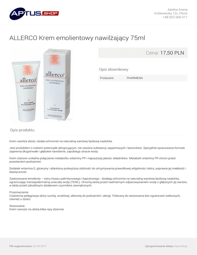 Apteka Avena Królewiecka 12c, Płock +48 502 666 011 ALLERCO Krem emolientowy nawilżający 75ml Cena: 17,50 PLN Opis słownikowy Producent PHARMENA Opis produktu Krem nawilża skórę i działa ochronnie na naturalną warstwę lipidową naskórka. Jest produktem o niskiem potencjale alergizującym, nie zawiera substancji zapachowych i barwników. Specjalnie opracowana formuła zapewnia długotrwałe i głębokie nawilżenie, zapobiega utracie wody. Krem stanowi unikalne połączenie metabolitu witaminy PP i najwyższej jakości składników. Metabolit witaminy PP chroni przed powstaniem podrażnień. Dodatek witaminy E, gliceryny i allantoiny podwyższa zdolność do utrzymywania prawidłowej wilgotności skóry, poprawia jej miękkość i elastyczność. Zastosowane emolienty – estry kwasu palmitynowego i kaprylowego - działają ochronnie na naturalną warstwę lipidową naskórka, ograniczając transepidermalną ucieczkę wody (TEWL). Chronią skórę przed nadmiernym odparowywaniem wody z głębszych jej warstw, a także przed szkodliwym działaniem czynników zewnętrznych. Przeznaczenie Codzienna pielęgnacja skóry suchej, wrażliwej, skłonnej do podrażnień i alergii. Polecany do stosowania bez ograniczeń wiekowych, również u dzieci. Stosowanie Krem nanosić na skórę kilka razy dziennie. Plik wygenerowano: 02-03-2017 Powered by TCPDF (www.tcpdf.org) Oprogramowanie sklepu: AptusShop