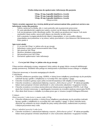 Ulotka dołączona do opakowania: informacja dla pacjenta Ultop, 10 mg, kapsułki dojelitowe, twarde Ultop, 20 mg, kapsułki dojelitowe, twarde Ultop, 40 mg, kapsułki dojelitowe, twarde Omeprazolum Należy uważnie zapoznać się z treścią ulotki przed zastosowaniem leku, ponieważ zawiera ona informacje ważne dla pacjenta. Należy zachować tę ulotkę, aby w razie potrzeby móc ją ponownie przeczytać. W razie jakichkolwiek wątpliwości należy zwrócić się do lekarza lub farmaceuty. Lek ten przepisano ściśle określonej osobie. Nie należy go przekazywać innym. Lek może zaszkodzić innej osobie, nawet jeśli objawy jej choroby są takie same. Jeśli u pacjenta wystąpią jakiekolwiek objawy niepożądane, w tym wszelkie objawy niepożądane niewymienione w tej ulotce, należy powiedzieć o tym lekarzowi lub farmaceucie, Patrz punkt 4. Spis treści ulotki 1. Co to jest lek Ultop i w jakim celu się go stosuje 2. Informacje ważne przed zastosowaniem leku Ultop 3. Jak stosować lek Ultop 4. Możliwe działania niepożądane 5. Jak przechowywać lek Ultop 6. Zawartość opakowania i inne informacje 1. Co to jest lek Ultop i w jakim celu się go stosuje Ultop zawiera substancję czynną, omeprazol, który należy do grupy leków zwanych inhibitorami pompy protonowej. Działanie leku polega na zmniejszaniu wydzielania kwasu solnego w żołądku. Ultop jest stosowany w leczeniu następujących chorób: U dorosłych: • Choroba refluksowa przełyku (ang. GERD), w której kwas żołądkowy przedostaje się do przełyku (odcinek łączący gardło z żołądkiem) co wywołuje ból, stan zapalny i zgagę. • Choroba wrzodowa górnej części jelita (wrzód dwunastnicy) lub żołądka (wrzód żołądka). • Choroba wrzodowa z zakażeniem bakterią o nazwie „Helicobacter pylori”. W takim przypadku lekarz może przepisać również antybiotyki w celu wyleczenia zakażenia i wygojenia wrzodu. • Choroba wrzodowa wywołana niesteroidowymi lekami przeciwzapalnymi (NLPZ). Lek Ultop może być również stosowany w zapobieganiu tworzenia się wrzodów podczas stosowania NLPZ. • Zbyt duża ilość kwasu w żołądku wywołana przez guz w trzustce (zespół Zollingera-Ellisona). U dzieci: Dzieci powyżej 1 roku życia i o masie ciała ≥10 kg • Choroba refluksowa przełyku, w której kwas żołądkowy przedostaje się do przełyku (odcinek łączący gardło z żołądkiem) co wywołuje ból, stan zapalny i zgagę. U dzieci choroba może objawiać się cofaniem się treści żołądka do jamy ustnej (ulewanie), nudnościami (wymioty) i małym przyrostem masy ciała. Dzieci i młodzież powyżej 4 roku życia • Choroba wrzodowa z zakażeniem bakterią o nazwie „Helicobacter pylori”. W takim przypadku lekarz może przepisać również antybiotyki w celu wyleczenia zakażenia i wygojenia wrzodu. 1 2. Informacje ważne przed zastosowaniem leku Ultop Kiedy nie stosować leku Ultop: • jeśli pacjent ma uczulenie na omeprazol lub którykolwiek z pozostałych składników tego leku (wymienionych w punkcie 6), • jeśli u pacjenta stwierdzono nadwrażliwość na leki zawierające inne inhibitory pompy protonowej (np. pantoprazol, lanzoprazol, rabeprazol, ezomeprazol), • jeśli jednocześnie przyjmowany jest nelfinawir (lek stosowany w leczeniu zakażeń HIV). Nie należy stosować leku Ultop, jeśli którakolwiek z powyższych sytuacji dotyczy pacjenta. W razie wątpliwości należy zwrócić się do lekarza lub farmaceuty przed zażyciem leku Ultop. Ostrzeżenia i środki ostrożności Przed rozpoczęciem stosowania leku Ultop należy omówić to z lekarzem lub farmaceutą. Ultop może maskować objawy innych chorób, dlatego w razie wystąpienia poniższych objawów przed rozpoczęciem lub podczas przyjmowania leku Ultop, należy niezwłocznie skontaktować się z lekarzem: • niezamierzona utrata masy ciała i trudności z połykaniem, • ból brzucha lub niestrawność, • wymioty lub wymioty z domieszką krwi, • smoliste stolce (z domieszką krwi), • ostra lub uporczywa biegunka, ponieważ omeprazol może wywoływać niewielki wzrost występowania biegunki zakaźnej, • poważne problemy z wątrobą, • jeśli u pacjenta kiedykolwiek występowała reakcja skórna w wyniku stosowania leku podobnego do leku Ultop, który zmniejsza wydzielanie kwasu żołądkowego. Jeśli u pacjenta wystąpiła wysypka skórna, zwłaszcza w miejscach narażonych na działanie promieni słonecznych, należy jak najszybciej powiedzieć o tym lekarzowi, ponieważ konieczne może być przerwanie stosowania leku Ultop. Należy również powiedzieć o wszelkich innych występujących działaniach niepożądanych takich, jak ból stawów. W razie długotrwałego zażywania leku Ultop (ponad 1 rok), lekarz będzie prowadził obserwację stanu zdrowia pacjenta. Należy zgłaszać lekarzowi wszelkie nowe i nietypowe objawy. Przyjmowanie inhibitorów pompy protonowej, takich jak lek Ultop, zwłaszcza przez okres dłuższy niż jeden rok, może nieznacznie zwiększać ryzyko wystąpienia złamań kości biodrowej, kości nadgarstka lub kręgosłupa. Należy poinformować lekarza w przypadku rozpoznanej osteoporozy lub przyjmowania leków z grupy kortykosteroidów (mogących zwiększać ryzyko wystąpienia osteoporozy). Ultop a inne leki Należy powiedzieć lekarzowi lub farmaceucie o wszystkich lekach przyjmowanych przez pacjenta obecnie lub ostatnio, a także o lekach, które pacjent planuje przyjmować, w tym również o lekach wydawanych bez recepty. Ultop może wpływać na działanie innych leków, a inne leki mogą wpływać na działanie leku Ultop. Nie należy stosować leku Ultop w przypadku jednoczesnego stosowania leku zawierającego nelfinawir (stosowany w leczeniu zakażeń HIV). Należy powiadomić lekarza lub farmaceutę o przyjmowaniu któregokolwiek z następujących leków: • ketokonazol, itrakonazol, posakonazol lub worykonazol (stosowane w leczeniu zakażeń grzybiczych), 