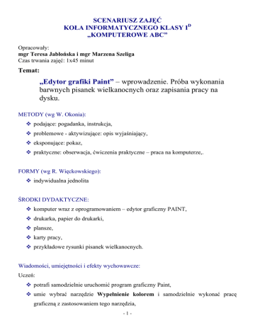SCENARIUSZ ZAJĘĆ KOŁA INFORMATYCZNEGO KLASY ID „KOMPUTEROWE ABC” Opracowały: mgr Teresa Jabłońska i mgr Marzena Szeliga Czas trwania zajęć: 1x45 minut Temat: „Edytor grafiki Paint” – wprowadzenie. Próba wykonania barwnych pisanek wielkanocnych oraz zapisania pracy na dysku. METODY (wg W. Okonia): podające: pogadanka, instrukcja, problemowe - aktywizujące: opis wyjaśniający, eksponujące: pokaz, praktyczne: obserwacja, ćwiczenia praktyczne – praca na komputerze,. FORMY (wg R. Więckowskiego): indywidualna jednolita ŚRODKI DYDAKTYCZNE: komputer wraz z oprogramowaniem – edytor graficzny PAINT, drukarka, papier do drukarki, plansze, karty pracy, przykładowe rysunki pisanek wielkanocnych. Wiadomości, umiejętności i efekty wychowawcze: Uczeń: potrafi samodzielnie uruchomić program graficzny Paint, umie wybrać narzędzie Wypełnienie kolorem i samodzielnie wykonać pracę graficzną z zastosowaniem tego narzędzia, -1- samodzielnie podpisuje rysunek za pomocą narzędzia Tekst z wykorzystaniem pola tekstowego, potrafi zastosować polecenie Cofnij (w razie potrzeby), umie zapisać pracę na dysku, potrafi odczytać i zapisać hasło z rozsypanki sylabowej, zna tradycje związane ze Świętami Wielkanocnymi, przestrzega prawidłowej postawy ciała przy pracy z komputerem. PRZEBIEG ZAJĘĆ: 1. Nawiązanie do tematu – odczytanie i zapisanie hasła z rozsypanki sylabowej umieszczonej na rysunkach pisanek wielkanocnych. (KARTA PRACY NR 1). 2. Pogadanka na temat Świąt Wielkanocnych oraz tradycji wykonywania pisanek wielkanocnych: Z jakimi świętami związana jest tradycja wykonywania pisanek? Kiedy i dlaczego obchodzimy Święta Wielkanocne? Jakie znacie inne tradycje związane z tymi świętami? Czy wykonywaliście kiedyś wielkanocną pisankę? Jak ona wyglądała? 3. Nauka uruchomienia programu graficznego Paint STARTÆPROGRAMYÆAKCESORIAÆPAINT 4. Otwarcie przez nauczyciela pliku z rysunkiem pisanek do pokolorowania. 5. Rozdanie KART PRACY NR 2 zawierających instrukcję do pracy: wyjaśnienie instrukcji. 6. Wykonanie projektu - wypełnienie kolorem pisanek według własnego pomysłu oraz podpisanie ich. 7. Zapisanie pracy na dysku. 8. Drukowanie prac. 9. Ocena wykonanych prac oraz podsumowanie zajęć. 10. Ewaluacja zajęć. -2- KARTA PRACY NR 1 1. Uporządkuj pisanki od największej do najmniejszej. Odczytaj hasło z umieszczonych na pisankach sylab i zapisz je poniżej. ŚWIĘ NE TA WIEL NOC KA .................................................................................................... -3- KARTA PRACY NR 2 1. Uruchom program graficzny Paint. START→PROGRAMY→AKCESORIA→PAINT 2. Za pomocą narzędzia WYPEŁNIANIE KOLOREM pomaluj wielkanocne pisanki według własnego pomysłu. 3. Przy wykorzystaniu pola tekstowego podpisz je: Wielkanocne pisanki. 4. Zapisz swój dokument na dysku. -4-