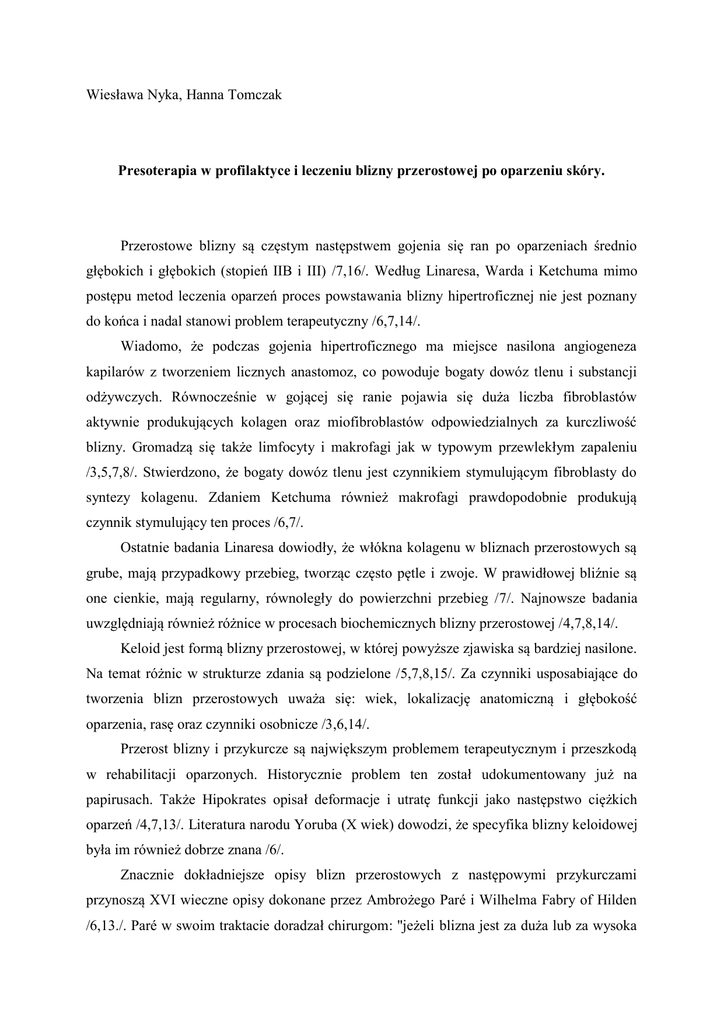 Wiesława Nyka, Hanna Tomczak Presoterapia w profilaktyce i leczeniu blizny przerostowej po oparzeniu skóry. Przerostowe blizny są częstym następstwem gojenia się ran po oparzeniach średnio głębokich i głębokich (stopień IIB i III) /7,16/. Według Linaresa, Warda i Ketchuma mimo postępu metod leczenia oparzeń proces powstawania blizny hipertroficznej nie jest poznany do końca i nadal stanowi problem terapeutyczny /6,7,14/. Wiadomo, że podczas gojenia hipertroficznego ma miejsce nasilona angiogeneza kapilarów z tworzeniem licznych anastomoz, co powoduje bogaty dowóz tlenu i substancji odżywczych. Równocześnie w gojącej się ranie pojawia się duża liczba fibroblastów aktywnie produkujących kolagen oraz miofibroblastów odpowiedzialnych za kurczliwość blizny. Gromadzą się także limfocyty i makrofagi jak w typowym przewlekłym zapaleniu /3,5,7,8/. Stwierdzono, że bogaty dowóz tlenu jest czynnikiem stymulującym fibroblasty do syntezy kolagenu. Zdaniem Ketchuma również makrofagi prawdopodobnie produkują czynnik stymulujący ten proces /6,7/. Ostatnie badania Linaresa dowiodły, że włókna kolagenu w bliznach przerostowych są grube, mają przypadkowy przebieg, tworząc często pętle i zwoje. W prawidłowej bliźnie są one cienkie, mają regularny, równoległy do powierzchni przebieg /7/. Najnowsze badania uwzględniają również różnice w procesach biochemicznych blizny przerostowej /4,7,8,14/. Keloid jest formą blizny przerostowej, w której powyższe zjawiska są bardziej nasilone. Na temat różnic w strukturze zdania są podzielone /5,7,8,15/. Za czynniki usposabiające do tworzenia blizn przerostowych uważa się: wiek, lokalizację anatomiczną i głębokość oparzenia, rasę oraz czynniki osobnicze /3,6,14/. Przerost blizny i przykurcze są największym problemem terapeutycznym i przeszkodą w rehabilitacji oparzonych. Historycznie problem ten został udokumentowany już na papirusach. Także Hipokrates opisał deformacje i utratę funkcji jako następstwo ciężkich oparzeń /4,7,13/. Literatura narodu Yoruba (X wiek) dowodzi, że specyfika blizny keloidowej była im również dobrze znana /6/. Znacznie dokładniejsze opisy blizn przerostowych z następowymi przykurczami przynoszą XVI wieczne opisy dokonane przez Ambrożego Paré i Wilhelma Fabry of Hilden /6,13./. Paré w swoim traktacie doradzał chirurgom: "jeżeli blizna jest za duża lub za wysoka powinna być uciśnięta opaską i płytką ołowiową". Z kolei Fabry of Hilden jako metodę zapobiegania przykurczom zalecał zakładanie unieruchomień, utrzymujących stawy w pozycjach anatomicznych. Pierwszy w pełni medyczny opis blizny przerostowej zawdzięczamy Retzowi (1790 r.), natomiast Alibert w swoich kolejnych publikacjach w latach 1809, 1816, 1817 wprowadził nazwy: Cancroid, Cheloide, Keloid /6,7/. Obaj autorzy nie byli zadowoleni z wyników leczenia keloidów. Alibert stwierdził, że chirurgia jest "bezużyteczna wobec nawrotów tej choroby" /6/. Rayer w 1935 roku był pierwszym, który w udokumentowany sposób opisał keloid powstały z blizny oparzeniowej /6/. Dalsze lata przynoszą ekscytujący przegląd pozornie skromnych obserwacji korzystnego efektu gojenia blizny przerostowej uciskiem pod aparatem korekcyjnym (Cronin), maską (Paderewsky), czy opaską noszoną z powodu zmian żylakowatych podudzi (Silverstein) /6,14/. Jako pierwsi efekty terapeutyczne zastosowania ucisku w leczeniu blizn przerostowych opublikowali w roku 1968 Fujimori, Hiramoto i Ofugi /7/. Równolegle z nimi zespół pod kierunkiem Larsona w Shriners Burns Institute w Galveston, Texas przeprowadził szerokie badania używając uciskowych unieruchomień w leczeniu oparzeń u dzieci /5,6/. Wyniki zostały przedstawione w 1971 roku na konferencji Amerykańskiego Towarzystwa Chirurgii Plastycznej i Rekonstrukcyjnej. Zapoczątkowało to współpracę z firmą Jobst, która jako pierwsza podjęła się szycia ubrań uciskowych z elastycznego materiału o dużej rozciągliwości. W świetle aktualnych poglądów leczenie blizn przerostowych składa się z kilku opcji chirurgicznych i terapii uciskowej /2,3,5,6,9,14,16/. Presoterapię uważa się za metodę profilaktyczno-leczniczą i zaleca stosowanie na świeżo wygojone rany z tendencją do przerostu blizny /5,6,9,17/. Dzięki badaniom Huanga wiadomo, że efektywny ucisk nie powinien być niższy niż 15 mmHg (optimum 20-25 mmHg) /7/. Obecnie istnieje wiele firm produkujących indywidualnie dopasowaną odzież uciskową, w tym także elastyczne lub plastikowe maski na twarz /7,16/. Zalecany czas noszenia wynosi 23 h na dobę przez okres co najmniej 6-18 miesięcy, a czasem dłużej aż do czasu osiągnięcia dojrzałości blizny /7/. Dopasowanie odzieży musi być okresowo sprawdzane. Zachęcające wyniki terapii uciskowej doprowadziły do rozszerzenia tej metody w kierunku stosowania opatrunków uciskowych (Coban) na nie wygojone rany /4,15/. Pozwala to na wcześniejsze rozpoczynanie leczenia uciskiem, co przyczynia się do zmniejszenia obrzęku i pozwala na szybsze uruchomienie kończyn. W Katedrze i Zakładzie Rehabilitacji AMG usprawnialiśmy 70 oparzonych chorych, u których w kompleksowym leczeniu, poza indywidualnie dobraną fizjoterapią, zastosowaliśmy odzież uciskową: rękawy, rękawice, rękawice z dociskami w przestrzeniach międzypalcowych oraz inne. Z tej grupy 62 osoby otrzymały zaopatrzenie w pierwszych 3 miesiącach po oparzeniu. Osiem osób z powodu nie wygojonej skóry, złego dopasowania lub trudności technicznych z zamówieniem zaopatrzono w okresie późniejszym. Trzynaście chorych z oparzeniem I/II stopnia zakończyło terapię po około 4 miesiącach, a efektem jest skóra wygojona bez blizny, odbarwiona, bądź lekko przebarwiona. Wstępna ocena po 10 miesiącach leczenia została omówiona w poprzednim rozdziale oraz była przedmiotem kilku innych opracowań /10,11,12/. W tym miejscu pragniemy przedstawić własne doświad