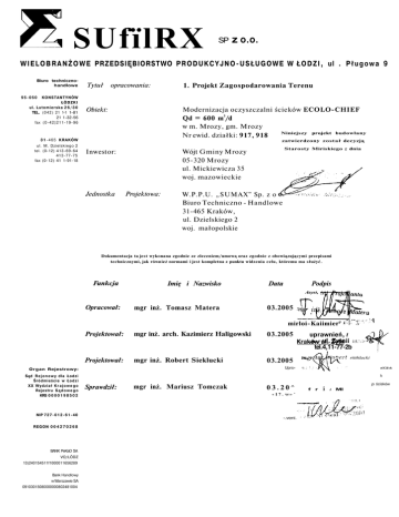SUfïlRX SP z o.o. W I E L O B R A N Ż O W E PRZEDSIĘBIORSTWO P R O D U K C Y J N O - U S Ł U G O W E W Ł O D Z I , ul . P ł u g o w a 9 Biuro technicznohandlowe KONSTANTYNÓW ŁÓDZKI ul. Lutomierska 2 6 / 3 0 TEL. ( 0 4 2 ) 21 1-1 1-81 21 1-32-56 fax (0-42)211-19-96 Tytuł opracowania: 1. Projekt Zagospodarowania Terenu 95-050 Obiekt: Modernizacja oczyszczalni ścieków ECOLO-CHIEF Qd = 600 m3/d w m. Mrozy, gm. Mrozy Niniejszy projekt budowlany Nr ewid. działki: 917, 918 3 1 - 4 6 5 KRAKÓW ul. M. Dzielskiego 2 tel. (0-12) 413-69-64 413-77-75 fax (0-12) 41 1-91-18 zatwierdzony z o s t a ł decyzją Inwestor: Jednostka Starosty Miriskiego z dnia Wójt Gminy Mrozy 05-320 Mrozy ul. Mickiewicza 35 woj. mazowieckie Projektowa: W.P.P.U. „SUMAX" Sp. z o Biuro Techniczno - Handlowe 31-465 Kraków, ul. Dzielskiego 2 woj. małopolskie Dokumentacja ta jest wykonana zgodnie ze zleceniem/umową oraz zgodnie z obowiązującymi przepisami technicznymi, jak również normami i jest kompletna z punktu widzenia celu, któremu ma służyć. Funkcja Imię i Nazwisko Data Podpis Asyst, Opracował: mgr inż. Tomasz Matera 03.2005 mirloi-Kaiimier Projektował: mgr inż. arch. Kazimierz Haligowski 03.2005 Projektował: mgr inż. Robert Sieklucki 03.2005 NIP 7 2 7 - 0 1 2 - 6 1 - 4 0 REGON 0 0 4 2 7 0 2 6 8 BANK PeKaO SA VO/LÓDZ 13)240154511f1000011656289 Bank Handlowy w Warszawie SA 09103015080000000802481004 ritthlucki Uprs» Organ Rejestrowy: Sąd R e j o n o w y dla Łodzi Śródmieście w Łodzi XX Wydział K r a j o w e g o Rejestru S ą d o w e g o KRS 0 0 0 0 1 9 8 5 0 2 uprawnień, t ,A«/ ul. ul. Zytn Zvtnií 15.'-> Kraków tel.4,11-77-2b n!Cif»ń h Sprawdził: mgr inż. Mariusz Tomczak 03.20^ « 1 7 . w» ' -.veni. f r i ¡o ścisków i Ml Projekt budowlany nr arch. PR - 0106 1. PROJEKT ZAGOSPODAROWANIA TERENU 1 PRZEDMIOT I ZAKRES OPRACOWANIA 3 2 PODSTAWA OPRACOWANIA 3 3 STAN ISTNIEJĄCY ZAGOSPODAROWANIA DZIAŁKI I ZAKRES PRZEWIDZIANYCH W NIM ZMIAN 6 3.1 ISTNIEJĄCE ZAGOSPODAROWANIE TERENU 3.2 PROJEKTOWANE ZAGOSPODAROWANIE TERENU OCZYSZCZALNI 3.2.1 3.2.2 3.2.3 3.2.4 3.2.5 3.2.6 4 6 6 Oczyszczalnia ścieków Komunikacja Doprowadzenie ścieków surowych Odprowadzenie ścieków oczyszczonych Media Ukształtowanie terenu 6 6 6 6 7 7 STOSUNKI WŁASNOŚCIOWE 7 4.1 OCZYSZCZALNIA ŚCIEKÓW 7 4.2 KANAL ŚCIEKÓW OCZYSZCZONYCH I WYLOT 7 4.3 PRZYŁĄCZ WODOCIĄGOWY 7 4.4 PROJEKTOWANY PRZYŁĄCZ ENERGETYCZNY 7 5 BILANS TERENU OBIEKTÓW ORAZ ZESTAWIENIE POWIERZCHNI I KUBATURY ISTNIEJĄCYCH 7 6 BILANS TERENU ORAZ ZESTAWIENIE POWIERZCHNI I KUBATURY PROJEKTOWANYCH OBIEKTÓW 8 7 CHARAKTER TERENU PRZEWIDZIANEGO POD INWESTYCJĘ 9 8 WPŁYW EKSPLOATACJI GÓRNICZEJ NA TEREN ZAMIERZENIA BUDOWLANEGO 9 9 WARUNKI HYDROGEOLOGICZNE 9 10 CHARAKTERYSTYKA EKOLOGICZNA OBIEKTU 9 11 WARUNKI GEOTECHNICZNE 10 12 OKREŚLENIE STREFY POŻAROWEJ I OCHRONY PRZECIWWYBUCHOWEJ 10 13 PROJEKT ZIELENI OCHRONNEJ 10 14 ZASILANIE OCZYSZCZALNI W TRAKCIE BUDOWY 11 RYSUNKI Rys. nr 1 M-l/PZT Orientacja Rys. nr 2 M-2/PZT Projekt zagospodarowania terenu 1:25 000 1:500 PB-0106 Sumax Sp. z o.o. 1. PROJEKT ZAGOSPODAROWANIA TERENU 1 Przedmiot i zakres opracowania Przedmiotem inwestycji jest mechaniczno-biologiczna sanitarnych o przepustowości docelowej Ojr.d. = 600 gm. Mrozy, pow. Mińsk Mazowiecki, woj. mazowieckie. oczyszczalnia m 3 /d w m. ścieków Mrozy, Inwestor: Wójt Gminy Mrozy, woj. mazowieckie. Przepustowość oczyszczalni dobrana została na podstawie danych przekazanych przez Inwestora. I" Oczyszczalnia będzie oczyszczała ścieki bytowo - gospodarcze pochodzące z zabudowań mieszkalnych m. Mrozy. Ścieki surowe będą dopływały na oczyszczalnię rurociągiem grawitacyjnym, a z terenów nie objętych kanalizacją będą dowożone na oczyszczalnię wozami asenizacyjnymi. Oczyszczalnia będzie mogła oczyścić docelowo w sumie 600 m 3 ścieków w ciągu doby, z tego ok. 560 dopłynie kanalizacją, a ok. 40 m 3 /d zostanie dowiezione beczkowozami. Ścieki obsługiwane przez oczyszczalnię, będą typowymi ściekami gospodarczo - bytowymi. Celem opracowania jest modernizacja istniejącej oczyszczalni ścieków w m. Mrozy mająca na celu unowocześnienie jej technologii oraz zwiększenie jej przepustowości z 300 m 3 /d do 600 m3/d Zakres opracowanego projektu budowlanego obejmuje budowę obiektów mechaniczno biologicznej oczyszczalni ścieków, obiektów pomocniczych, gospodarkę osadową, zagospodarowanie terenu oczyszczalni, instalacje elektryczne, odprowadzenie ścieków oczyszczonych do odbiornika." Na całość projektu składają się następujące opracowania branżowe: - technologia; - konstrukcja i architektura; elektryczna - zasilanie elektryczna - instalacje; - 2 komunikacja i ukształtowanie terenu; Podstawa opracowania - Umowa NR 17/KRK/2004 zawarta pomiędzy Gminą Mrozy reprezentowaną przez Wójta Gminy - Dariusza Jaszczuka, a Wielobranżowym Przedsiębiorstwem Produkcyjno Usługowym SUMAX Sp. z o.o. 94-213 Łódź ul. Pługowa 9, Biuro Techniczno Handlowe SUMAX w Krakowie, 31-465 Kraków ul. Dzielskiego 2 - Wypis z miejscowego planu zagospodarowania przestrzennego gminy i wsi Mrozy I.G.K. 7331/16 2004 - Wypisy z rejestru gruntów - Dokumentacja geotechniczna - Wizje lokalne w terenie 3 Sumax Sp. z o.o. PB-0106 Poniżej przedstawione zostały materiały źródłowe, wykorzystane do opracowania. Materiałami tymi są przepisy aktualnie obowiązujące w Polsce. [I] Ustawa z dnia 18 lipca 2001 r. Prawo wodne (Dz. U. 2001 r. Nr 115, poz. 1229 wraz z późniejszymi zmianami) [2] Ustawa z dnia 27 kwietnia 2001 r. Prawo ochrony środowiska (Dz. U. 2001 r. Nr 62, poz. 627) [3] Ustawa z dnia 27 lipca 2001 r. o wprowadzeniu ustawy - Prawo ochrony środowiska, ustawy o odpadach oraz z zmianie niektórych ustaw (Dz. U. 2001 r. Nr 100, poz. 1085) [4] Obwieszczenie Marszałka Sejmu Rzeczypospolitej Polskiej z dnia 21 listopada 2003 r. w sprawie ogłoszenia jednolitego tekstu ustawy - Prawo budowlane (Dz. U. 2003 r. Nr 207 poz. 201