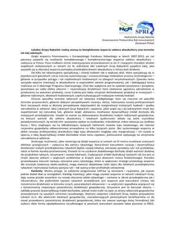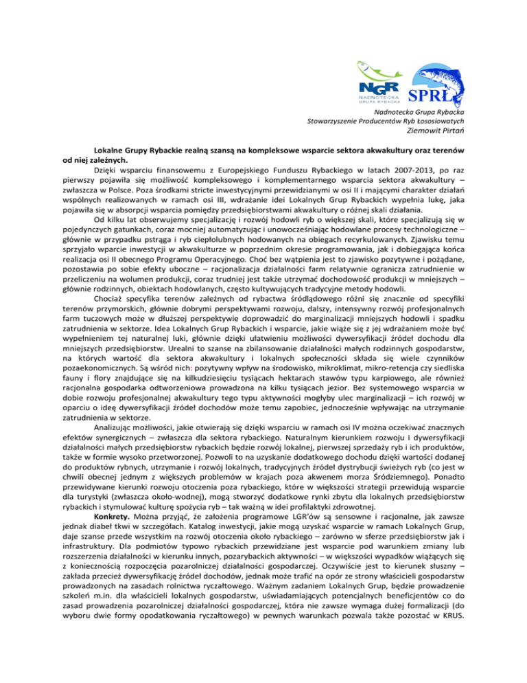 Nadnotecka Grupa Rybacka Stowarzyszenie Producentów Ryb Łososiowatych Ziemowit Pirtań Lokalne Grupy Rybackie realną szansą na kompleksowe wsparcie sektora akwakultury oraz terenów od niej zależnych. Dzięki wsparciu finansowemu z Europejskiego Funduszu Rybackiego w latach 2007-2013, po raz pierwszy pojawiła się możliwość kompleksowego i komplementarnego wsparcia sektora akwakultury – zwłaszcza w Polsce. Poza środkami stricte inwestycyjnymi przewidzianymi w osi II i mającymi charakter działań wspólnych realizowanych w ramach osi III, wdrażanie idei Lokalnych Grup Rybackich wypełnia lukę, jaka pojawiła się w absorpcji wsparcia pomiędzy przedsiębiorstwami akwakultury o różnej skali działania. Od kilku lat obserwujemy specjalizację i rozwój hodowli ryb o większej skali, które specjalizują się w pojedynczych gatunkach, coraz mocniej automatyzując i unowocześniając hodowlane procesy technologiczne – głównie w przypadku pstrąga i ryb ciepłolubnych hodowanych na obiegach recyrkulowanych. Zjawisku temu sprzyjało wparcie inwestycji w akwakulturze w poprzednim okresie programowania, jak i dobiegająca końca realizacja osi II obecnego Programu Operacyjnego. Choć bez wątpienia jest to zjawisko pozytywne i pożądane, pozostawia po sobie efekty uboczne – racjonalizacja działalności farm relatywnie ogranicza zatrudnienie w przeliczeniu na wolumen produkcji, coraz trudniej jest także utrzymać dochodowość produkcji w mniejszych – głównie rodzinnych, obiektach hodowlanych, często kultywujących tradycyjne metody hodowli. Chociaż specyfika terenów zależnych od rybactwa śródlądowego różni się znacznie od specyfiki terenów przymorskich, głównie dobrymi perspektywami rozwoju, dalszy, intensywny rozwój profesjonalnych farm tuczowych może w dłuższej perspektywie doprowadzić do marginalizacji mniejszych hodowli i spadku zatrudnienia w sektorze. Idea Lokalnych Grup Rybackich i wsparcie, jakie wiąże się z jej wdrażaniem może być wypełnieniem tej naturalnej luki, głównie dzięki ułatwieniu możliwości dywersyfikacji źródeł dochodu dla mniejszych przedsiębiorstw. Urealni to szanse na zbilansowanie działalności małych rodzinnych gospodarstw, na których wartość dla sektora akwakultury i lokalnych społeczności składa się wiele czynników pozaekonomicznych. Są wśród nich: pozytywny wpływ na środowisko, mikroklimat, mikro-retencja czy siedliska fauny i flory znajdujące się na kilkudziesięciu tysiącach hektarach stawów typu karpiowego, ale również racjonalna gospodarka odtworzeniowa prowadzona na kilku tysiącach jezior. Bez systemowego wsparcia w dobie rozwoju profesjonalnej akwakultury tego typu aktywności mogłyby ulec marginalizacji – ich rozwój w oparciu o ideę dywersyfikacji źródeł dochodów może temu zapobiec, jednocześnie wpływając na utrzymanie zatrudnienia w sektorze. Analizując możliwości, jakie otwierają się dzięki wsparciu w ramach osi IV można oczekiwać znacznych efektów synergicznych – zwłaszcza dla sektora rybackiego. Naturalnym kierunkiem rozwoju i dywersyfikacji działalności małych przedsiębiorstw rybackich będzie rozwój lokalnej, pierwszej sprzedaży ryb i ich produktów, także w formie wysoko przetworzonej. Pozwoli to na uzyskanie dodatkowego dochodu dzięki wartości dodanej do produktów rybnych, utrzymanie i rozwój lokalnych, tradycyjnych źródeł dystrybucji świeżych ryb (co jest w chwili obecnej jednym z większych problemów w krajach poza akwenem morza Śródziemnego). Ponadto przewidywane kierunki rozwoju otoczenia poza rybackiego, które w większości strategii przewidują wsparcie dla turystyki (zwłaszcza około-wodnej), mogą stworzyć dodatkowe rynki zbytu dla lokalnych przedsiębiorstw rybackich i stymulować kulturę spożycia ryb – tak ważną w idei profilaktyki zdrowotnej. Konkrety. Można przyjąć, że założenia programowe LGR’ów są sensowne i racjonalne, jak zawsze jednak diabeł tkwi w szczegółach. Katalog inwestycji, jakie mogą uzyskać wsparcie w ramach Lokalnych Grup, daje szanse przede wszystkim na rozwój otoczenia około rybackiego – zarówno w sferze przedsiębiorstw jak i infrastruktury. Dla podmiotów typowo rybackich przewidziane jest wsparcie pod warunkiem zmiany lub rozszerzenia działalności w kierunku innych, pozarybackich aktywności – w większości wypadków wiążących się z koniecznością rozpoczęcia pozarolniczej działalności gospodarczej. Oczywiście jest to kierunek słuszny – zakłada przecież dywersyfikację źródeł dochodów, jednak może trafić na opór ze strony właścicieli gospodarstw prowadzonych na zasadach rolnictwa ryczałtowego. Ważnym zadaniem Lokalnych Grup, będzie prowadzenie szkoleń m.in. dla właścicieli lokalnych gospodarstw, uświadamiających potencjalnych beneficjentów co do zasad prowadzenia pozarolniczej działalności gospodarczej, która nie zawsze wymaga dużej formalizacji (do wyboru dwie formy opodatkowania ryczałtowego) w pewnych warunkach pozwala także pozostać w KRUS. Ponadto jedną z form rozwoju, jaką można będzie wspierać w ramach osi IV, będzie sprzedaż bezpośrednia, która przy zachowaniu odpowiedniej skali może być prowadzona bez formalnego rozszerzania działalności gospodarczej. Zmiany. Mimo oczywistych korzyści płynących z rozszerzania działalności – przynajmniej teoretycznych – specyfika rybactwa śródlądowego daje jej perspektywy rozwoju także w ramach prowadzonej działalności. Wymienić można szereg działań inwestycyjnych, których realizacja w tradycyjnych gospodarstwach mogłaby wpłynąć na dywersyfikację ich dochodów. W dzisiejszym układzie przepisów, poza sprzedażą bezpośrednią wsparcie tego typy przedsięwzięć może być problematyczne – bez rozszerzenia działalności, choć w mojej ocenie powinny – głównie ze względu na śródlądową specyfikę branży. W najbliższym czasie zap