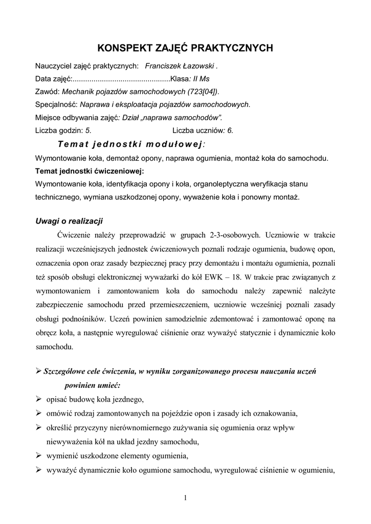 KONSPEKT ZAJĘĆ PRAKTYCZNYCH Nauczyciel zajęć praktycznych: Franciszek Łazowski . Data zajęć:...............................................Klasa: II Ms Zawód: Mechanik pojazdów samochodowych (723[04]). Specjalność: Naprawa i eksploatacja pojazdów samochodowych. Miejsce odbywania zajęć: Dział „naprawa samochodów”. Liczba godzin: 5. Liczba uczniów: 6. Temat jednostki modułowej: Wymontowanie koła, demontaż opony, naprawa ogumienia, montaż koła do samochodu. Temat jednostki ćwiczeniowej: Wymontowanie koła, identyfikacja opony i koła, organoleptyczna weryfikacja stanu technicznego, wymiana uszkodzonej opony, wyważenie koła i ponowny montaż. Uwagi o realizacji Ćwiczenie należy przeprowadzić w grupach 2-3-osobowych. Uczniowie w trakcie realizacji wcześniejszych jednostek ćwiczeniowych poznali rodzaje ogumienia, budowę opon, oznaczenia opon oraz zasady bezpiecznej pracy przy demontażu i montażu ogumienia, poznali też sposób obsługi elektronicznej wyważarki do kół EWK – 18. W trakcie prac związanych z wymontowaniem i zamontowaniem koła do samochodu należy zapewnić należyte zabezpieczenie samochodu przed przemieszczeniem, uczniowie wcześniej poznali zasady obsługi podnośników. Uczeń powinien samodzielnie zdemontować i zamontować oponę na obręcz koła, a następnie wyregulować ciśnienie oraz wyważyć statycznie i dynamicznie koło samochodu. Ø Szczegółowe cele ćwiczenia, w wyniku zorganizowanego procesu nauczania uczeń powinien umieć: Ø opisać budowę koła jezdnego, Ø omówić rodzaj zamontowanych na pojeździe opon i zasady ich oznakowania, Ø określić przyczyny nierównomiernego zużywania się ogumienia oraz wpływ niewyważenia kół na układ jezdny samochodu, Ø wymienić uszkodzone elementy ogumienia, Ø wyważyć dynamicznie koło ogumione samochodu, wyregulować ciśnienie w ogumieniu, 1 Ø zamocować koło do piasty samochodu, Ø stosować przepisy bhp i przeciwpożarowe obowiązujące na stanowisku pracy. Formy nauczania: grupowa. Metody nauczania: omówienie, pokaz filmu dydaktycznego pt. „Ogumienie samochodu” z wyjaśnieniem, ćwiczenia. Materiały dydaktyczne: Film dydaktyczny na nośniku CD-ROM pt. „Ogumienie samochodu”. Techniczne środki dydaktyczne: stanowisko komputerowe z systemem operacyjnym Windows i odtwarzaczem Windows Media Player. Dydaktyczne środki pracy: podnośnik samochodowy, urządzenie do montażu i demontażu ogumienia UDO – 18, elektroniczna wyważarka do kół EWK – 18, przyrząd do pompowania opon PO – 1. Narzędzia: klucze do kół, klucze nasadowe, pokrętła dynamometryczne, czujnik zegarowy z podkładką magnetyczną, przyrząd do miejscowego ściskania opony RSO – 18, szczypce do montażu i demontażu ciężarków, kluczyk do zaworków. Materiały: opony na wymianę, pasta do montażu opon, talk, czyściwo, ciężarki do wyrównoważenia kół o różnym wagoniarze, kreda. T r e ś ć z a j ę ć : Wstępne czynności przygotowawcze przed rozpoczęciem zajęć, czas około 10 min: ·Witam się z uczniami. ·Pytam, czy nie ma chorych i niedysponowanych. ·Oceniam ubrania robocze. ·Sprawdzam listę obecności. ·Polecam przygotowanie zeszytów zajęć praktycznych. Instruktaż wstępny, czas około 20 min: · Podaję temat i cele zajęć. · Podaję szczegółowe cele kształcenia i przedstawiam uwagi do realizacji, · Informuję uczniów, że zasadniczą częścią instruktażu będzie film dydaktyczny pt. ”Ogumienie samochodu”, który obejrzymy na monitorze komputera (czas trwania 12 min). · Proszę uczniów, aby zwrócili szczególną uwagę na następujące fragmenty filmu: 2 Ø Budowa opony radialnej i diagonalnej, Opona diagonalna Opona radialna Ø Budowa opony dętkowej i bezdętkowej, Uszczelnienie opony bezdętkowej Ø Oznaczenie opon Opona radialna, oznaczenie parametrów Symbol rzeźby bieżnika Oznaczenie producenta Numer fabryczny opony Ø Procedura montażu ogumienia przy pomocy urządzenia UDO – 18, 1 2 3 4 5 6 7 8 3 Ø Procedura wyważania kół, 1 5 2 3 6 4 7 Ø Procedura sprawdzania stanu technicznego opon. 1 2 3 4 Po projekcji filmu następuje podział uczniów na 2 – 3 osobowe grupy. Każda grupa otrzymuje dokumentację zawierającą opis praktycznego wykonania ćwiczenia, instrukcję do wykonania zadania, druk pod nazwą „plan działania”, materiały pomocnicze do jednostki modułowej „Wymontowanie koła, demontaż opony, naprawa ogumienia, montaż koła do samochodu”, fabryczne instrukcje obsługi wyważarki i urządzenia do demontażu i montażu opon. Przed przejściem do kolejnej fazy zajęć przypominam uczniom przepisy BHP obowiązujące podczas naprawy ogumienia i zarządzam przejście do kolejnej fazy zajęć, czyli analizowania przez uczniów otrzymanej dokumentacji. Instruktaż bieżący, analiza informacji, czas około 20 min: Ø Uczniowie analizują dokumentację, Ø Zastanawiają się nad skonstruowaniem planów działania, Ø Zastanawiają się nad wykazami części zamiennych, narzędzi i urządzeń pomocniczych, Ø Zastanawiają się nad zestawieniem niezbędnych do wykonania zadania urządzeń, narzędzi i przyrządów kontrolno pomiarowych oraz środków pomocniczych, Ø Obserwuję pracę uczniów, Ø W przypadku, gdy uczniowie napotykają trudności, z którymi nie mogą sobie poradzić, staram się naprowadzić na prawidłowy tok rozumowania. 4 Instruktaż bieżący, planowanie – od tej chwili uczniowie mają na wykonanie ćwiczenia około 240 minut: Ø Uczniowie na podstawie dokumentacji konstruują plany działania, Ø Z pomocą dokumentacji tworzą wykazy części zamiennych, narzędzi i urządzeń pomocniczych, Ø Sporządzają zestawienia niezbędnych do wykonania zadania urządzeń, narzędzi i przyrządów kontrolno pomiarowych oraz środków pomocniczych, Ø Obserwuję pracę uczniów, Ø W przypadku, gdy uczniowie napotykają trudności, z którymi nie mogą sobie poradzić, staram się naprowadzić 