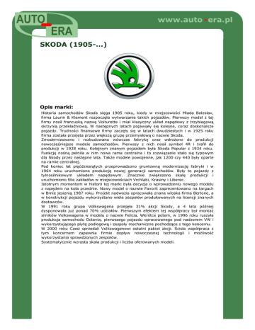 www.auto - era.pl SKODA (1905-...) Opis marki: Historia samochodów Skoda sięga 1905 roku, kiedy w miejscowości Mlada Boleslav, firma Laurin & Klement rozpoczęła wytwarzanie takich pojazdów. Pierwszy model z tej firmy nosił francuską nazwę Voiturette i miał klasyczny układ napędowy z trzybiegową skrzynią przekładniową. W następnych latach pojawiały się kolejne, coraz doskonalsze pojazdy. Trudności finansowe firmy zaczęły się w latach dwudziestych i w 1925 roku firma została przejęta przez większą grupę przemysłową o nazwie Skoda. Zmodernizowano i rozbudowano wówczas fabrykę oraz wdrożono do produkcji nowocześniejsze modele samochodów. Pierwszy z nich nosił symbol 4R i trafił do produkcji w 1928 roku. Kolejnym znanym pojazdem była Skoda Popular z 1934 roku. Funkcję nośną pełniła w nim nowa rama centralna i to rozwiązanie stało się typowym dla Skody przez następne lata. Także modele powojenne, jak 1200 czy 440 były oparte na ramie centralnej. Pod koniec lat pięćdziesiątych przeprowadzono gruntowną modernizację fabryki i w 1964 roku uruchomiono produkcję nowej generacji samochodów. Były to pojazdy z tylnosilnikowym układem napędowym. Znacznie zwiększono skalę produkcji i uruchomiono filie zakładów w miejscowościach Vrchlabi, Krasiny i Liberec. Istotnym momentem w historii tej marki była decyzja o wprowadzeniu nowego modelu z napędem na koła przednie. Nowy model o nazwie Favorit zaprezentowano na targach w Brnie jesienią 1987 roku. Projekt nadwozia opracowała znana włoska firma Bertone, a w konstrukcji pojazdu wykorzystano wiele zespołów produkowanych na licencji znanych dostawców. W 1991 roku grupa Volkswagena przejęła 31% akcji Skody, a 4 lata później dysponowała już ponad 70% udziałów. Pierwszym efektem tej współpracy był montaż silników Volkswagena w modelu o nazwie Felicia. Wkrótce potem, w 1996 roku ruszyła produkcja samochodu Octavia, pierwszego pojazdu opracowanego pod nadzorem VW i wykorzystującego płytę podłogową i zespoły mechaniczne pochodzące z tego koncernu. W 2000 roku Czesi sprzedali Volkswagenowi ostatni pakiet akcji. Ścisła współpraca z tym koncernem zapewnia firmie dopływ nowoczesnej technologii i możliwość wykorzystania sprawdzonych zespołów. Systematycznie wzrasta skala produkcji i liczba oferowanych modeli.