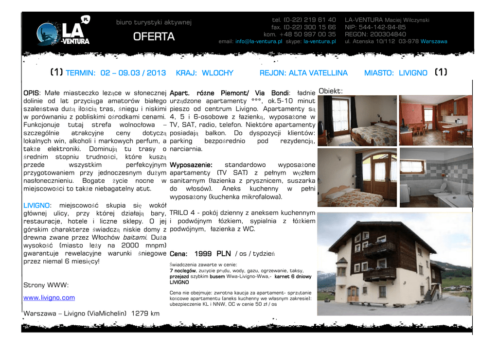 tel. (0-22) 219 61 40 fax. (0-22) 300 15 66 kom. +48 50 997 00 35 biuro turystyki aktywnej OFERTA (1) TERMIN: 02 – 09.03 / 2013 OPIS: Małe miasteczko lezące w słonecznej dolinie od lat przyciąga amatorów białego szaleństwa dużą ilością tras, śniegu i niskimi w porównaniu z pobliskimi ośrodkami cenami. Funkcjonuje tutaj strefa wolnocłowa – szczególnie atrakcyjne ceny dotyczą lokalnych win, alkoholi i markowych perfum, a także elektroniki. Dominują tu trasy o średnim stopniu trudności, które kuszą przede wszystkim perfekcyjnym przygotowaniem przy jednoczesnym dużym nasłonecznieniu. Bogate życie nocne w miejscowości to także niebagatelny atut. LIVIGNO: miejscowość skupia się wokół głównej ulicy, przy której działają bary, restauracje, hotele i liczne sklepy. O jej górskim charakterze świadczą niskie domy z drewna zwane przez Włochów baitami. Duża wysokość (miasto leży na 2000 mnpm) gwarantuje rewelacyjne warunki śniegowe przez niemal 6 miesięcy! Strony WWW: www.livigno.com Warszawa – Livigno (ViaMichelin) 1279 km email: [email protected] skype: la-ventura.pl KRAJ: WLOCHY ul. Atenska 10/112 03-978 Warszawa REJON: ALTA VATELLINA Apart. różne Piemont/ Via Bondi: ładnie Obiekt: urządzone apartamenty ***, ok.5-10 minut pieszo od centrum Livigno. Apartamenty są 4, 5 i 6-osobowe z łazienką, wyposażone w TV, SAT, radio, telefon. Niektóre apartamenty posiadają balkon. Do dyspozycji klientów: parking bezpośrednio pod rezydencją, narciarnia. Wyposazenie: standardowo wyposażone apartamenty (TV SAT) z pełnym węzłem sanitarnym (łazienka z prysznicem, suszarka do włosów). Aneks kuchenny w pełni wyposażony (kuchenka mikrofalowa). TRILO 4 - pokój dzienny z aneksem kuchennym i podwójnym łózkiem, sypialnia z łóżkiem podwójnym, łazienka z WC. Cena: LA-VENTURA Maciej Wilczynski NIP: 544-142-94-85 REGON: 200304840 1999 PLN / os / tydzień Świadczenia zawarte w cenie: 7 noclegów, zużycie prądu, wody, gazu, ogrzewanie, taksy, przejazd szybkim busem Wwa-Livigno-Wwa,- karnet 6 dniowy LIVIGNO Cena nie obejmuje: zwrotna kaucja za apartament- sprzątanie końcowe apartamentu (aneks kuchenny we własnym zakresie): ubezpieczenie KL i NNW, OC w cenie 50 zł / os MIASTO: LIVIGNO (1) czarne: 20 km czerwone: 55 km niebieskie: 40 km Razem: 115 km