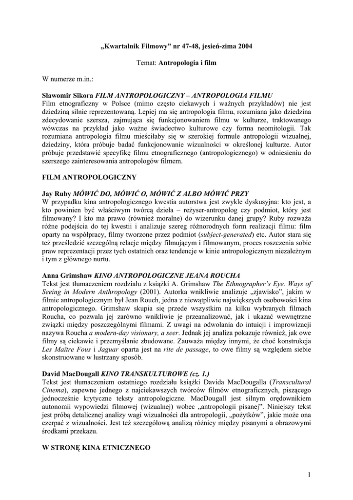 „Kwartalnik Filmowy” nr 47-48, jesień-zima 2004 Temat: Antropologia i film W numerze m.in.: Sławomir Sikora FILM ANTROPOLOGICZNY – ANTROPOLOGIA FILMU Film etnograficzny w Polsce (mimo często ciekawych i ważnych przykładów) nie jest dziedziną silnie reprezentowaną. Lepiej ma się antropologia filmu, rozumiana jako dziedzina zdecydowanie szersza, zajmująca się funkcjonowaniem filmu w kulturze, traktowanego wówczas na przykład jako ważne świadectwo kulturowe czy forma neomitologii. Tak rozumiana antropologia filmu mieściłaby się w szerokiej formule antropologii wizualnej, dziedziny, która próbuje badać funkcjonowanie wizualności w określonej kulturze. Autor próbuje przedstawić specyfikę filmu etnograficznego (antropologicznego) w odniesieniu do szerszego zainteresowania antropologów filmem. FILM ANTROPOLOGICZNY Jay Ruby MÓWIĆ DO, MÓWIĆ O, MÓWIĆ Z ALBO MÓWIĆ PRZY W przypadku kina antropologicznego kwestia autorstwa jest zwykle dyskusyjna: kto jest, a kto powinien być właściwym twórcą dzieła – reżyser-antropolog czy podmiot, który jest filmowany? I kto ma prawo (również moralne) do wizerunku danej grupy? Ruby rozważa różne podejścia do tej kwestii i analizuje szereg różnorodnych form realizacji filmu: film oparty na współpracy, filmy tworzone przez podmiot (subject-generated) etc. Autor stara się też prześledzić szczególną relacje między filmującym i filmowanym, proces roszczenia sobie praw reprezentacji przez tych ostatnich oraz tendencje w kinie antropologicznym niezależnym i tym z głównego nurtu. Anna Grimshaw KINO ANTROPOLOGICZNE JEANA ROUCHA Tekst jest tłumaczeniem rozdziału z książki A. Grimshaw The Ethnographer’s Eye. Ways of Seeing in Modern Anthropology (2001). Autorka wnikliwie analizuje „zjawisko”, jakim w filmie antropologicznym był Jean Rouch, jedna z niewątpliwie największych osobowości kina antropologicznego. Grimshaw skupia się przede wszystkim na kilku wybranych filmach Roucha, co pozwala jej zarówno wnikliwie je przeanalizować, jak i ukazać wewnętrzne związki między poszczególnymi filmami. Z uwagi na odwołania do intuicji i improwizacji nazywa Roucha a modern-day visionary, a seer. Jednak jej analiza pokazuje również, jak owe filmy są ciekawie i przemyślanie zbudowane. Zauważa między innymi, że choć konstrukcja Les Maître Fous i Jaguar oparta jest na rite de passage, to owe filmy są względem siebie skonstruowane w lustrzany sposób. David MacDougall KINO TRANSKULTUROWE (cz. 1.) Tekst jest tłumaczeniem ostatniego rozdziału książki Davida MacDougalla (Transcultural Cinema), zapewne jednego z najciekawszych twórców filmów etnograficznych, piszącego jednocześnie krytyczne teksty antropologiczne. MacDougall jest silnym orędownikiem autonomii wypowiedzi filmowej (wizualnej) wobec „antropologii pisanej”. Niniejszy tekst jest próbą detalicznej analizy wagi wizualności dla antropologii, „pożytków”, jakie może ona czerpać z wizualności. Jest też szczegółową analizą różnicy między pisanymi a obrazowymi środkami przekazu. W STRONĘ KINA ETNICZNEGO 1 Renata Lubomirska W POSZUKIWANIU CIĄGŁOŚCI. TRADYCJA W KINEMATOGRAFII I KULTURZE AFRYKI ZACHODNIEJ Autorka próbuje przedstawić sytuację współczesnego kina Afryki subsaharyjskiej (francuskojęzycznej) w kontekście jego historii, sposobów finansowania, dystrybucji i szkolenia afrykańskich filmowców. Główny temat tekstu koncentruje się jednak wokół znaczenia ustnej tradycji dla tej kinematografii oraz funkcji postaci griota – „opowiadacza” (story-teller), który przechowuje i przekazuje dla następnych pokoleń opowieści i mity tak ważne dla tradycyjnych społeczeństw afrykańskich. Janet A. Kaplan „MONGOLSKA JOANNA D’ARC”. ROZMOWA Z ULRIKE OTTINGER Ottinger opowiada Janet Kaplan o realizacji filmu Mongolska Joanna D’Arc, a także o swoich inspiracjach artystycznych, ukształtowanych podczas studiów w Paryżu i potem w Niemczech pod wpływem Fasbindera. Wbrew temu, co można by podejrzewać, zawsze lubiła klasyczne kino nieme, a zwłaszcza Stroheima. Ceni też Altmana i Scorsesego, a przede wszystkim amerykańskich twórców niezależnych. Mówi też o feminizmie, queer theory i o korzeniach żydowskich. Odwołania do wszystkich tych źródeł można odnaleźć w jej filmie. Najważniejsza jest jednak Mongolia Wewnętrzna i kultura tego regionu, wraz z jej mitologią, rytuałami, pieśniami, rzemiosłem, a przede wszystkim wspaniałą przyrodą i krajobrazami. Tym, co interesowało ją najbardziej, były relacje i kontrasty kulturowe między tubylcami a przybyszami z Europy. Realne problemy wynikające z realizacji splotły się nierozerwalnie z fikcyjną historią, jaką miała zamiar opowiedzieć. PŁEĆ – KULTURA – INNY Robert Kulpa „TRYLOGIA MIŁOŚCI”. ANTROPOLOGICZNE SPOJRZENIE NA FILM GEJOWSKI Kulpa próbuje podjąć dyskusję nad pytaniem, czym jest „kino gejowskie”, analizując film Paula Bogarta z 1988 r. Trylogia miłości (Torch Song Trilogy). Film ten, choć paradoksalnie bardzo popularny wśród środowisk homoseksualnych, dość mocno operuje stereotypami, niekoniecznie działającymi na korzyść grup gejowsko-lesbijskich. Autor analizuje film, przywołując teorie dotyczące kategorii tożsamości (Marcela Maussa, Immanuela Kanta, Judith Butler) i kultury (w ujęciu Ruth Benedtict, Ewy Nowickiej, Ralpha Lintona). Obserwując metodę konstrukcji bohaterów filmu, autor zastanawia się, czym jest jednostka w pajęczynie społecznej. Kinga Gałuszka „WSZYSTKO O EWIE” – „KOBIECOŚĆ” W ROLI GŁÓWNEJ Analiza filmu Wszystko o Ewie Josepha L. Mankiewicza jest pretekstem do refleksji o naturze aktorstwa filmowego. Fenomen bycia aktorem podważa granice między prawdą a fałszem, byciem a graniem. W sposób szczególny ujawnia się, kiedy na ekranie oglądamy aktorów, którzy grają aktorów. Jeszcze mocniej staje się on wyraźny w momenc