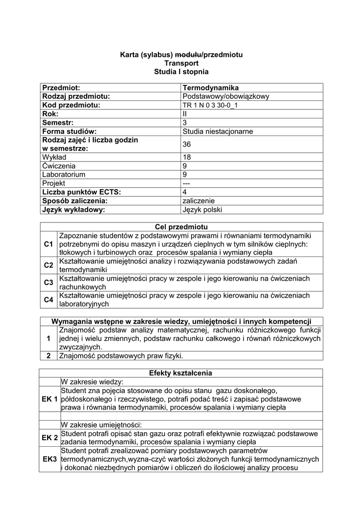 Karta (sylabus) modułu/przedmiotu Transport Studia I stopnia Przedmiot: Rodzaj przedmiotu: Kod przedmiotu: Rok: Semestr: Forma studiów: Rodzaj zajęć i liczba godzin w semestrze: Wykład Ćwiczenia Laboratorium Projekt Liczba punktów ECTS: Sposób zaliczenia: Język wykładowy: C1 C2 C3 C4 Termodynamika Podstawowy/obowiązkowy TR 1 N 0 3 30-0_1 II 3 Studia niestacjonarne 36 18 9 9 --4 zaliczenie Język polski Cel przedmiotu Zapoznanie studentów z podstawowymi prawami i równaniami termodynamiki potrzebnymi do opisu maszyn i urządzeń cieplnych w tym silników cieplnych: tłokowych i turbinowych oraz procesów spalania i wymiany ciepła Kształtowanie umiejętności analizy i rozwiązywania podstawowych zadań termodynamiki Kształtowanie umiejętności pracy w zespole i jego kierowaniu na ćwiczeniach rachunkowych Kształtowanie umiejętności pracy w zespole i jego kierowaniu na ćwiczeniach laboratoryjnych Wymagania wstępne w zakresie wiedzy, umiejętności i innych kompetencji Znajomość podstaw analizy matematycznej, rachunku różniczkowego funkcji 1 jednej i wielu zmiennych, podstaw rachunku całkowego i równań różniczkowych zwyczajnych. 2 Znajomość podstawowych praw fizyki. Efekty kształcenia W zakresie wiedzy: Student zna pojęcia stosowane do opisu stanu gazu doskonałego, EK 1 półdoskonałego i rzeczywistego, potrafi podać treść i zapisać podstawowe prawa i równania termodynamiki, procesów spalania i wymiany ciepła W zakresie umiejętności: Student potrafi opisać stan gazu oraz potrafi efektywnie rozwiązać podstawowe EK 2 zadania termodynamiki, procesów spalania i wymiany ciepła Student potrafi zrealizować pomiary podstawowych parametrów EK3 termodynamicznych,wyzna-czyć wartości złożonych funkcji termodynamicznych i dokonać niezbędnych pomiarów i obliczeń do ilościowej analizy procesu wymiany ciepła i procesu spalania W zakresie kompetencji społecznych: Kształtowanie aktywnej postawy w prezentacji rozwiązań zadań w doraźnych EK 4 zespołach na ćwiczeniach rachunkowych Umiejętność współpracy w doraźnych zespołach powołanych do rozwiązywania EK5 zadań na ćwiczeniach EK6 Umiejętność współpracy w grupach laboratoryjnych W1 W2 W3 W4 W5 W6 W7 W8 W9 ĆW1 Treści programowe przedmiotu Forma zajęć – wykłady Treści programowe Wiadomości wstępne,przedmiot, zakres i metody termodynamiki, definicje i jednostki miar Układ termodynamiczny i jego otoczenie. Intensywne i ekstensywne parametry stanu. Stan równowagi termodynamicznej. Modele czynników termodynamicznych i ich własności. Prawa gazów doskonałych Boyle'a – Mariotte'a, Gay Lussaca – Charlesa, Avogadro. Gaz półdoskonały, gaz rzeczywisty. Termiczny opis stanu gazów doskonałych, półdoskonałych i rzeczywistych, wykres stanu p-V. Prawo Daltona i termiczny opis stanu mieszanin gazów doskonałych. Energia układu, energia wewnętrzna, prawo Joule'a, entalpia statyczna i entalpia spiętrzenia. Oddziaływania pomiędzy układem a otoczeniem, oddziaływania na sposób pracy i na sposób ciepła. Prace: bezwzględna, techniczna i praca umieszczenia, praca użyteczna, wykres pracy p-V. Ciepło, ciepło przemiany i ciepło właściwe, równanie Mayera. Funkcje termodynamiczne i ich właściwości. Bilans energii układu w warunkach równowagi termodynamicznej. I Zasada Termodynamiki dla układów zamkniętych i otwartych, dla procesów odwracalnych i nieodwracalnych. Pewnik równowagi. Zerowa Zasada Termodynamiki. Pojęcie entropii. II Zasada Termodynamiki i jej sformułowania. Wykres ciepła T-S. Zmiana entropii w odwracalnych i nieodwracalnych przemianach energetycznych. Równowagowa przemiana termodynamiczna. Odwracalne przemiany politropowe gazów doskonałych i półdoskonałych, dławienie izentalpowe, interpretacja graficzna przemian na wykresach pracy i ciepła. Nieodwracalność przemian. Procesy sprężania gazów. Sprężarka tłokowa, sprężarki: teoretyczna, wzorcowa, rzeczywista. Sprężarka wielostopniowa. Zasady zamiany ciepła na pracę, prawobieżny obieg termodynamiczny. Obieg Carnota. Obiegi silników cieplnych, Joule'a, Otto, Diesla, Sabathe. Lewobieżny obieg termodynamiczny, lewobieżny obieg Carnota. Zagadnienie użyteczności energii. Praca maksymalna, egzergia, anergia. Zjawisko spalania. Wartość opałowa i ciepło spalania. Zapotrzebowanie powietrza do spalania. Wykresy charakteryzujące procesy spalania. Rodzaje wymiany ciepła. Podstawowe prawa opisujące wymianę ciepła przez przewodzenie, konwekcję i promieniowanie. Przenikanie ciepła. Forma zajęć – ćwiczenia Treści programowe Wprowadzenie w tematykę ćwiczeń rachunkowych. Jednostki, przeliczanie ĆW2 ĆW3 ĆW4 ĆW5 ĆW6 ĆW7 ĆW8 ĆW9 L1 L2 L3 L4 L5 1 2 3 jednostek występujących w technice cieplnej na układ SI. Zadania z zakresu równania stanu termicznego gazu doskonałego. Zadania z zakresu równania stanu termicznego gazu półdoskonałego. Mieszaniny gazów doskonałych. Zadania z zakresu bilansów energetycznych Kolokwium I Zadania z przemian odwracalnych gazów doskonałych i przemian nieodwracalnych Silnikowe i chłodnicze obiegi termodynamiczne. Teoretyczna i wzorcowa sprężarka tłokowa. Spalanie. Obliczanie zapotrzebowania powietrza do spalania. Objętość spalin. Temperatura spalania. Wymiana ciepła przez przewodzenie, konwekcję i promieniowanie. Przenikanie ciepła. Kolokwium II Forma zajęć – laboratoria Treści programowe Pomiary ciśnienia Pomiary temperatury Analiza gazów Pomiar współczynnika przewodzenia ciepła Zaliczenie poprawkowe L1-L4 w semestrze Metody dydaktyczne Wykład prowadzony metodą informacyjną z uwzględnieniem problemów obliczeniowych i wykorzystaniu technik audiowizualnych Ćwiczenia audytoryjne stanowią rachunkową ilustrację wykładów i dotyczą wybranych zagadnień obliczeniowych z poszczególnych działów Ćwiczenia laboratoryjne – wykonywanie doświadczeń i pomiarów Obciążenie pracą studenta Śred