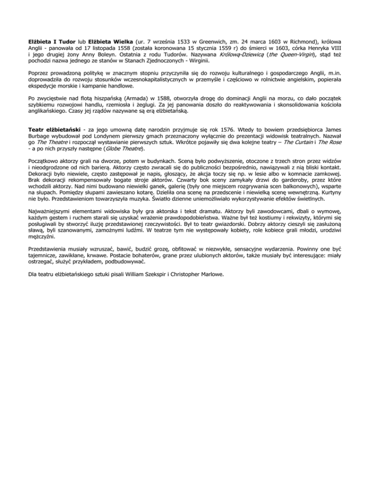 Elżbieta I Tudor lub Elżbieta Wielka (ur. 7 września 1533 w Greenwich, zm. 24 marca 1603 w Richmond), królowa Anglii - panowała od 17 listopada 1558 (została koronowana 15 stycznia 1559 r) do śmierci w 1603, córka Henryka VIII i jego drugiej żony Anny Boleyn. Ostatnia z rodu Tudorów. Nazywana Królową-Dziewicą (the Queen-Virgin), stąd też pochodzi nazwa jednego ze stanów w Stanach Zjednoczonych - Wirginii. Poprzez prowadzoną politykę w znacznym stopniu przyczyniła się do rozwoju kulturalnego i gospodarczego Anglii, m.in. doprowadziła do rozwoju stosunków wczesnokapitalistycznych w przemyśle i częściowo w rolnictwie angielskim, popierała ekspedycje morskie i kampanie handlowe. Po zwycięstwie nad flotą hiszpańską (Armada) w 1588, otworzyła drogę do dominacji Anglii na morzu, co dało początek szybkiemu rozwojowi handlu, rzemiosła i żeglugi. Za jej panowania doszło do reaktywowania i skonsolidowania kościoła anglikańskiego. Czasy jej rządów nazywane są erą elżbietańską. Teatr elżbietański - za jego umowną datę narodzin przyjmuje się rok 1576. Wtedy to bowiem przedsiębiorca James Burbage wybudował pod Londynem pierwszy gmach przeznaczony wyłącznie do prezentacji widowisk teatralnych. Nazwał go The Theatre i rozpoczął wystawianie pierwszych sztuk. Wkrótce pojawiły się dwa kolejne teatry – The Curtain i The Rose - a po nich przyszły następne (Globe Theatre). Początkowo aktorzy grali na dworze, potem w budynkach. Sceną było podwyższenie, otoczone z trzech stron przez widzów i nieodgrodzone od nich barierą. Aktorzy często zwracali się do publiczności bezpośrednio, nawiązywali z nią bliski kontakt. Dekoracji było niewiele, często zastępował je napis, głoszący, że akcja toczy się np. w lesie albo w komnacie zamkowej. Brak dekoracji rekompensowały bogate stroje aktorów. Czwarty bok sceny zamykały drzwi do garderoby, przez które wchodzili aktorzy. Nad nimi budowano niewielki ganek, galerię (były one miejscem rozgrywania scen balkonowych), wsparte na słupach. Pomiędzy słupami zawieszano kotarę. Dzieliła ona scenę na przedscenie i niewielką scenę wewnętrzną. Kurtyny nie było. Przedstawieniom towarzyszyła muzyka. Światło dzienne uniemożliwiało wykorzystywanie efektów świetlnych. Najważniejszymi elementami widowiska były gra aktorska i tekst dramatu. Aktorzy byli zawodowcami, dbali o wymowę, każdym gestem i ruchem starali się uzyskać wrażenie prawdopodobieństwa. Ważne był też kostiumy i rekwizyty, którymi się posługiwali by stworzyć iluzję przedstawionej rzeczywistości. Był to teatr gwiazdorski. Dobrzy aktorzy cieszyli się zasłużoną sławą, byli szanowanymi, zamożnymi ludźmi. W teatrze tym nie występowały kobiety, role kobiece grali młodzi, urodziwi mężczyźni. Przedstawienia musiały wzruszać, bawić, budzić grozę, obfitować w niezwykłe, sensacyjne wydarzenia. Powinny one być tajemnicze, zawikłane, krwawe. Postacie bohaterów, grane przez ulubionych aktorów, także musiały być interesujące: miały ostrzegać, służyć przykładem, podbudowywać. Dla teatru elżbietańskiego sztuki pisali William Szekspir i Christopher Marlowe.