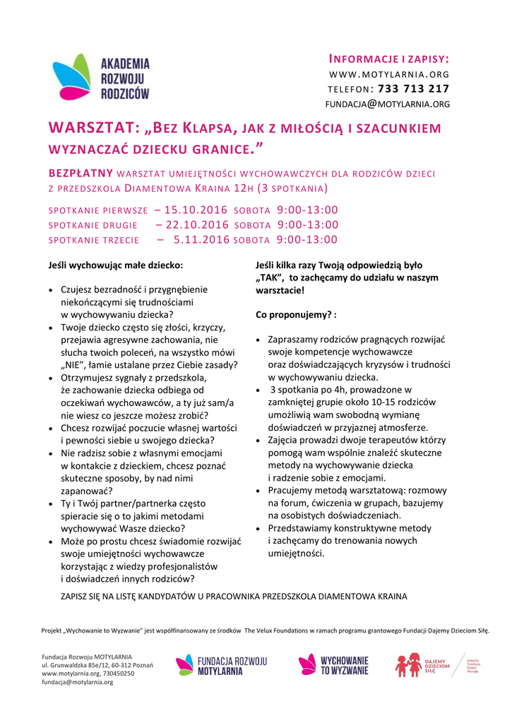 I NFORMACJE I ZAPISY : WWW. MOTYLARNIA. ORG TELEFON : 733 713 217 [email protected] WARSZTAT: „B EZ K LAPSA , JAK Z MIŁOŚCIĄ I SZACUNKIEM WYZNACZAĆ DZIECKU GRANICE .” BEZPŁATNY WARSZTAT UMIEJĘTNOŚC I WYCH OWAWCZYCH DLA R ODZICÓ W DZIECI Z PRZEDSZKOLA D IAMENTOWA K RAINA 12 H (3 SPOTKANIE PIERWSZE SPOTKANIE DRUGIE SPOTKANIE TRZECIE – 15.10.2016 – 22.10.2016 – 5.11.2016 SOBOTA SOBOTA S OBOTA Jeśli wychowując małe dziecko: S POTKANIA ) Czujesz bezradność i przygnębienie niekończącymi się trudnościami w wychowywaniu dziecka? Twoje dziecko często się złości, krzyczy, przejawia agresywne zachowania, nie słucha twoich poleceń, na wszystko mówi „NIE”, łamie ustalane przez Ciebie zasady? Otrzymujesz sygnały z przedszkola, że zachowanie dziecka odbiega od oczekiwań wychowawców, a ty już sam/a nie wiesz co jeszcze możesz zrobić? Chcesz rozwijać poczucie własnej wartości i pewności siebie u swojego dziecka? Nie radzisz sobie z własnymi emocjami w kontakcie z dzieckiem, chcesz poznać skuteczne sposoby, by nad nimi zapanować? Ty i Twój partner/partnerka często spieracie się o to jakimi metodami wychowywać Wasze dziecko? Może po prostu chcesz świadomie rozwijać swoje umiejętności wychowawcze korzystając z wiedzy profesjonalistów i doświadczeń innych rodziców? 9:00-13:00 9:00-13:00 9:00-13:00 Jeśli kilka razy Twoją odpowiedzią było „TAK”, to zachęcamy do udziału w naszym warsztacie! Co proponujemy? : Zapraszamy rodziców pragnących rozwijać swoje kompetencje wychowawcze oraz doświadczających kryzysów i trudności w wychowywaniu dziecka. 3 spotkania po 4h, prowadzone w zamkniętej grupie około 10-15 rodziców umożliwią wam swobodną wymianę doświadczeń w przyjaznej atmosferze. Zajęcia prowadzi dwoje terapeutów którzy pomogą wam wspólnie znaleźć skuteczne metody na wychowywanie dziecka i radzenie sobie z emocjami. Pracujemy metodą warsztatową: rozmowy na forum, ćwiczenia w grupach, bazujemy na osobistych doświadczeniach. Przedstawiamy konstruktywne metody i zachęcamy do trenowania nowych umiejętności. ZAPISZ SIĘ NA LISTĘ KANDYDATÓW U PRACOWNIKA PRZEDSZKOLA DIAMENTOWA KRAINA Projekt „Wychowanie to Wyzwanie” jest współfinansowany ze środków The Velux Foundations w ramach programu grantowego Fundacji Dajemy Dzieciom Siłę. Fundacja Rozwoju MOTYLARNIA ul. Grunwaldzka 85e/12, 60-312 Poznań www.motylarnia.org, 730450250 [email protected]