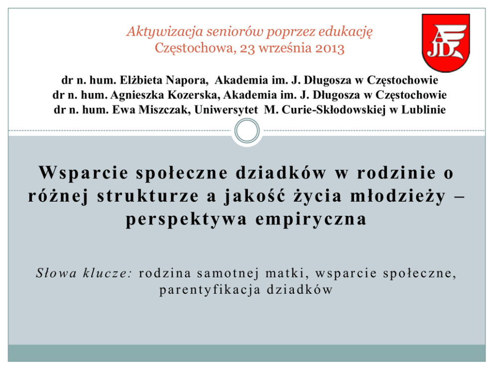 Aktywizacja seniorów poprzez edukację Częstochowa, 23 września 2013 dr n. hum. Elżbieta Napora, Akademia im. J. Długosza w Częstochowie dr n. hum. Agnieszka Kozerska, Akademia im. J. Długosza w Częstochowie dr n. hum. Ewa Miszczak, Uniwersytet M. Curie-Skłodowskiej w Lublinie Wsparcie społeczne dziadków w rodzinie o różnej strukturze a jakość życia młodzieży – perspektywa empiryczna Słowa klucze: rodzina samotnej matki, wsparcie społeczne, parentyfikacja dziadków o projekcie Projekt ten jest wynikiem międzydyscyplinarnej współpracy grupy badawczej z Zakładu Psychologii oraz Zakładu Pedagogiki Ogólnej i Metodologii Badań Akademii im. Jana Długosza w Częstochowie wraz z Zakładem Socjologii Medycyny i Rodziny UMCS w Lublinie. Jednym z celów prowadzonych badań jest określenie czynników ochronnych w rodzinie samotnej matki. Projekt integruje pozytywną psychologię, edukację, socjologię w celu określenia warunków optymalnego funkcjonowania rodziny wielopokoleniowej w prowincjonalnej Polsce z uwzględnieniem regionalnego kontekstu kulturowego. Wyniki mogą stanowić wkład do bazy naukowej służącej do wypracowywania optymalnych struktur opieki społecznej w polskich małych miastach i na wsi. Badania dotyczą tych ochronnych czynników, które prowadzą do przeciwdziałania wykluczeniu społecznemu rodzin samotnych matek, czynników związanych ze wsparciem społecznym (w szczególności: parentyfikacją) dziadków w rodzinie wielopokoleniowej. Projekt w części był finansowany ze środków na działalność statutową DS/IFSiP/40/2013 Wydziału Nauk Społecznych Akademii im. Jana Długosza w Częstochowie. W oparciu o wyniki badań przygotowano tekst: Wsparcie dziadków w rodzinie o różnej strukturze a jakość życia młodzieży, Acta Humanica (2013). Elżbieta Napora, adiunkt Wydziału Nauk Społecznych w AJD w Częstochowie. Prowadzi badania i zajęcia z psychologii, którą ukończyła na KUL-u. Obszary zainteresowań badawczych: rodzina samotnej matki w różnej konfiguracji, m.in. w diadzie homogenicznej i heterogenicznej. Przyczyny zagrożenia marginalizacją dzieci i młodzieży. Publikuje w czasopismach o zasięgu krajowym i zagranicznym. Agnieszka Kozerska, adiunkt Wydziału Pedagogicznego w AJD w Częstochowie. Obszary zainteresowań: Środowisko edukacyjne seniorów. Rodzina jako przestrzeń uczenia się. Międzypokoleniowe uczenie się w rodzinie. Uczestnictwo dziadków w wychowaniu wnuków. Zastosowanie metod statystycznych w badaniach społecznych. Ewa Miszczak, adiunkt w Zakładzie Socjologii Medycyny i Rodziny, Instytutu Socjologii UMCS w Lublinie. Obszary zainteresowań zawodowych: socjologia religii, gerontologia społeczna i socjologia rodziny. Wyjaśnienie pojęć Wsparcie społeczne , funkcjonalne: rodzaj interakcji społecznych Strukturalne: obiektywnie istniejąca sieć (więzi, kontakty, przynależność) pełni funkcję pomocną osobie, będącej w trudnej sytuacji (Sęk, 2005). Jakość życia (dobre życie, zadowolenie, dobrostan). Satysfakcja z życia, poczucie szczęścia lub jego brak (Dalkey, Rurke, 1972). Indywidualnie odczuwana satysfakcja z powodu zaspokojenia potrzeb w danym okresie (Mitchell, 1997). Kształtowana przez czynniki subiektywne jak i obiektywne, np. poczucie wsparcia społecznego, sposób spędzania wolnego czasu. Parentyfikacja: „zamiana ról – funkcjonalna, emocjonalna lub obie – w której dziecko poświęca własne potrzeby: potrzebę uwagi, bezpieczeństwa i uzyskiwania wsparcia w rozwoju, aby przystosować się i troszczyć o instrumentalne lub emocjonalne potrzeby rodzica”. Parentyfikacja dziadków jest rozważana w kontekście trzech pokoleń i przyjmujemy, że termin ten odnosi się do relacji między rodzicami dziecka a dziadkami oraz do relacji między wnukiem a dziadkami. Parentyfikacja dziadków to oczekiwane przez rodzinę dorosłego dziecka i konieczne dla jej poprawnego funkcjonowania, udzielane przez nich wsparcie. Dziadkowie włączeni zostają w podsystem rodzicielski i pełnią rolę rodzica w odniesieniu do wnuka, mogą też – w odniesieniu do któregoś z rodziców wnuka udzielać wsparcia jakiego udziela współmałżonek. Powoduje to, że rola dziadków transferuje w stronę roli ojca. Przypuszczamy, że w pewnych warunkach może być zjawiskiem korzystnym zarówno dla dziadków jak i dla pozostałych członków rodziny. Wsparcie a życie rodzinne W traumatycznej sytuacji jaką jest rozwód, tworzy się silna więź między rozwodzącą się matką a babcią, której wsparcie jest czynnikiem ochronnym w czasie kryzysu (za Napora, Kozerska, Schneider, 2013) Badania pokazały, że w rodzinach samotnych matek (rozwiedzionych i będących w separacji) rola dziadków jest znacząca zarówno w trakcie procesu rozwodu jak i w okresie następującym bezpośrednio po nim (Timonen V., i in., 2009). Wsparcie członków rodziny, finansowe i instrumentalne pozytywnie wpływa na te dzieci, które żyją w środowiskach wysokiego ryzyka. Szczególnie babcie pomagają równoważyć potencjalnie negatywne skutki ryzyka dla wnuków (Hunter, 1997; Taylor, Roberts, 1995). Cel badań Uzyskanie odpowiedzi na pytania: jakiego rodzaju wsparcia udzielają dziadkowie rodzinom swoich dzieci w warunkach polskich, jaki jest związek pomiędzy wsparciem udzielanym przez dziadków, a psychospołecznym funkcjonowaniem młodzieży, by następnie określić warunki w jakich udzielane przez dziadków wsparcie jest najkorzystniejsze dla wszystkich członków rodziny. Hipotezy H1: młodzież z rodzin o różnej strukturze porównywalnie ocenia subiektywną jakość życia, H2: dziadkowie ze strony matki więcej udzielają wsparcia rodzinie bez ojca, niż rodzinie pełnej, H3: dziadkowie ze strony matki częściej udzielają wsparcia rodzinie co ma związek z jakością życia młodzieży, Metody JŻ – Skalą Huebnera SLSS (Student’s Life Satisfaction Scale), składającą się z siedmiu twierdze