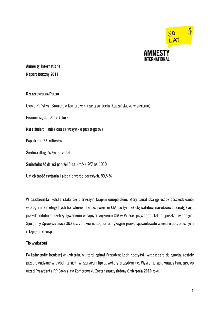 Amnesty International Raport Roczny 2011 RZECZPOSPOLITA POLSKA Głowa Państwa: Bronisław Komorowski (zastąpił Lecha Kaczyńskiego w sierpniu) Premier rządu: Donald Tusk Kara śmierci: zniesiona za wszystkie przestępstwa Populacja: 38 milionów Średnia długość życia: 76 lat Śmiertelność dzieci poniżej 5 r.ż. (m/k): 9/7 na 1000 Umiejętność czytania i pisania wśród dorosłych: 99,5 % W październiku Polska stała się pierwszym krajem europejskim, który uznał skargę osoby poszkodowanej w programie nielegalnych transferów i tajnych więzień CIA, po tym jak obywatelowi narodowości saudyjskiej, prawdopodobnie przetrzymywanemu w tajnym więzieniu CIA w Polsce, przyznano status „poszkodowanego”. Specjalny Sprawozdawca ONZ ds. zdrowia uznał, że restrykcyjne prawo spowodowało wzrost niebezpiecznych i tajnych aborcji. Tło wydarzeń Po katastrofie lotniczej w kwietniu, w której zginął Prezydent Lech Kaczyński wraz z całą delegacją, zostały przeprowadzone w dwóch turach, w czerwcu i lipcu, wybory prezydenckie. Wygrał je sprawujący tymczasowo urząd Prezydenta RP Bronisław Komorowski. Został zaprzysiężony 6 sierpnia 2010 roku. 1 Wojna z terroryzmem i bezpieczeństwo Wciąż trwa dochodzenie prowadzone przez Prokuraturę Apelacyjną w Warszawie w sprawie zaangażowania Polski w program nielegalnych transferów i tajnych więzień CIA. Polska Agencja Żeglugi Powietrznej podała w grudniu 2009 roku informację wskazującą na to, że samoloty latające w ramach tego programu lądowały w Polsce na lotnisku Szymany, niedaleko domniemanych tajnych więzień w Starych Kiejkutach. Dokumenty wydane przez Biuro Straży Granicznej w lipcu potwierdziły, że siedem samolotów używanych w programie nielegalnych transferów CIA wylądowało w Szymanach między grudniem 2002 a wrześniem 2003. Pasażerowie wraz z załogą byli obecni podczas lądowania i startu. We wrześniu, biuro prokuratora potwierdziło, że zbadało oskarżenie wniesione przez Abd al-Rahim al- Nashiri’ego, obywatela narodowości saudyjskiej, obecnie przetrzymywanego w Guantanamo, który twierdzi, że był przetrzymywany w tajnym więzieniu CIA na terenie Polski. W październiku przyznano mu status „poszkodowanego”; jest to pierwsza skarga w sprawie programu nielegalnych transferów i tajnych więzień CIA, uznana przez instytucję w państwie Unii Europejskiej. W grudniu, prawnicy współpracujący z organizacjami pozarządowymi Reprieve i Interights złożyli w imieniu Abu Zubajdy skargę za przestępstwa popełnione podczas przetrzymywania go przez CIA na terytorium Polski. Skarga zawierała żądanie Abu Zubajdy o formalne uznanie go za ofiarę tortur i nielegalnego zatrzymania. Po otrzymaniu statusu poszkodowanego, Abd al-Nashiri, Abu Zubajda i ich prawnicy otrzymali dostęp do aktów śledztwa prowadzonego przez prokuratorai pozwolono im na wzięcie udziału w śledztwie. W październiku Komitet Praw Człowieka wezwał polskie władze do zapewnienia, że dochodzenie w sprawie domniemanego zaangażowania urzędników w program nielegalnych transferów i tajnych więzień CIA, ma wszelkie upoważnienia niezbędne do wzywania świadków i otrzymywania dokumentacji. 17 września, działając zgodnie z międzynarodowym nakazem aresztowania wydanym przez władze rosyjskie, policja w Warszawie aresztowała Czeczena Akhmeda Zakajewa. W następstwie aresztowania, Rosja zażądała ekstradycji Akhmeda Zakajewa, powołując się na jego zaangażowanie w akcje terrorystyczne. 18 września, Warszawski Sąd Okręgowy, nakazał jego uwolnienie biorąc pod uwagę status uchodźcy, jaki otrzymał w Wielkiej Brytanii. Prokurator rejonowy zaskarżył tę decyzję. W październiku sąd apelacyjny podtrzymał decyzję o uwolnieniu Akhmeda Zakajewa, który wrócił do Anglii. 23 grudnia sąd rejonowy zaprzestał procedur ekstradycyjnych z powodów nieobecności Akhmeda Zakajewa na terytorium Polski. 2 Dyskryminacja Po latach przygotowań parlament przyjął w grudniu ustawę antydyskryminacyjną. Jednakże organizacje pozarządowe skrytykowały jej ograniczony katalog przesłanek, na podstawie których dyskryminacja jest zakazana. Są to tożsamość płciowa, poglądy polityczne czy np. stan cywilny. Organizacje wyraziły również zaniepokojenie faktem, że zamiast utworzenia nowego niezależnego biura do monitowania i promowania nowej ustawy, instytucją za to odpowiedzialną byłby Rzecznik Praw Obywatelskich. Prawa seksualne i reprodukcyjne Specjalny Sprawozdawca ONZ ds. prawa do zdrowia podkreślił w maju, że ustawa dotycząca planowania rodziny, która unieważniła ekonomiczne i socjalne powody, jako podstawy do prawnego przerwania ciąży, spowodowała wzrost niebezpiecznych i podziemnych aborcji. W październiku Komitet Praw Człowieka wyraził zaniepokojenie z powodu tego, że wielu kobietom odmówiono dostępu do usług zdrowia reprodukcyjnego, w tym prawa do legalnego przerwania ciąży. Organizacje monitorujące przestrzeganie praw człowieka wskazały przepis w ustawie mówiący o „klauzuli sumienia”, który daje personelowi medycznemu prawo do odmowy przeprowadzenia niektórych procedur, jako przeszkodę w dostępnie do praw reprodukcyjnych. Według raportu przyjętego we wrześniu przez Komitet ds. Społecznych, Zdrowia i Rodziny Zgromadzenia Parlamentarnego Rady Europy, polskim instytucjom zdrowotnym brakowało formalnych przepisów dotyczących stosowania „klauzuli sumienia”. W raporcie wyrażono zaniepokojenie, że ten paragraf jest nadużywany przez zarządy szpitali, które często przyjmowały niepisane zasady postępowania zakazujące niektórych interwencji, w tym aborcji. Sprawa kobiety w ciąży, która zmarła na skutek szoku septycznego po tym, jak odmówiono jej opieki diagnostycznej i leczenia w kilku szpitalach, ze strachu przed ryzykowaniem życia płodu, czeka na zbadanie przez Europejski Trybunał ds. Praw Człowieka. Nadużycie siły W październiku, Komitet