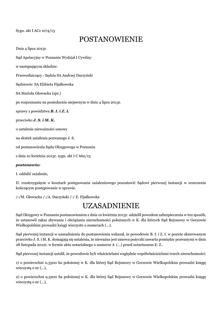 Sygn. akt I ACz 1074/13 POSTANOWIENIE Dnia 4 lipca 2013r. Sąd Apelacyjny w Poznaniu Wydział I Cywilny w następującym składzie: Przewodniczący - Sędzia SA Andrzej Daczyński Sędziowie: SA Elżbieta Fijałkowska SA Mariola Głowacka (spr.) po rozpoznaniu na posiedzeniu niejawnym w dniu 4 lipca 2013r. sprawy z powództwa B. I. i Z. I. przeciwko J. S. i M. K. o ustalenie nieważności umowy na skutek zażalenia pozwanego J. S. od postanowienia Sądu Okręgowego w Poznaniu z dnia 10 kwietnia 2013r. sygn. akt I C 662/13 postanawia: I. oddalić zażalenie, II. rozstrzygnięcie o kosztach postępowania zażaleniowego pozostawić Sądowi pierwszej instancji w orzeczeniu kończącym postępowanie w sprawie. /-/M. Głowacka /-/A. Daczyński /-/ E. Fijałkowska UZASADNIENIE Sąd Okręgowy w Poznaniu postanowieniem z dnia 10 kwietnia 2013r. udzielił powodom zabezpieczenia w ten sposób, że ustanowił zakaz zbywania i obciążania nieruchomości położonych w K. dla których Sąd Rejonowy w Gorzowie Wielkopolskim prowadzi księgi wieczyste o numerach (...). Sąd pierwszej instancji w uzasadnieniu do postanowienia wskazał, że powodowie B. I. i Z. I. w pozwie skierowanym przeciwko J. S. i M. K. domagają się ustalenia, że nieważna jest umowa pożyczki zawarta pomiędzy pozwanymi w dniu 28 listopada 2012r. w formie aktu notarialnego o numerze A (...) przed notariuszem E. Z.. Sąd pierwszej instancji ustalił, że powodowie byli właścicielami względnie współwłaścicielami trzech nieruchomości: 1) o powierzchni 0,3500 ha położonej w K. dla której Sąd Rejonowy w Gorzowie Wielkopolskim prowadzi księgę wieczystą o nr (...), 2) o powierzchni 9,3200 ha położonej w K. dla której Sąd Rejonowy w Gorzowie Wielkopolskim prowadzi księgę wieczystą o nr (...), 3) o powierzchni 26,3200 ha położonej w K. dla której Sąd Rejonowy w Gorzowie Wielkopolskim prowadzi księgę wieczystą o nr (...). Powodowie zamierzali sprzedać te nieruchomości i w tym celu nawiązali kontakt z pozwanym J. S.. Powód w dniu 26 listopada 2012r. zawarł z A. S. umowę w której ustalono zasady prowadzenia tej transakcji. Istotnym postanowieniem umowy było udzielenie przez powodów pełnomocnictwa do wszystkich czynności związanych ze sprzedażą nieruchomości, a także ustalenie, iż sprzedaż nieruchomości może nastąpić za kwotę nie mniejszą niż 15 zł za 1 m2. Po dwóch dniach powodowie udzielili pełnomocnictwa pozwanemu J. S., którego zakres był znacznie szerszy niż ustalenia zawarte w umowie z dnia 26 listopada 2012r. Pełnomocnictwo to obejmowało m.in. uprawnienie do przewłaszczenia na zabezpieczenie zobowiązań osób trzecich. Tego samego dnia tj. 28 listopada 2012r. pozwani zawarli umowę pożyczki na kwotę 450.000 zł, której zabezpieczeniem było przewłaszczenie nieruchomości powodów. Sąd pierwszej instancji w świetle art. 730 § 1 i 2 k.p.c. uznał, że powodowie uprawdopodobnili zarówno roszczenie jak i interes prawny w udzieleniu zabezpieczenia. Sąd pierwszej instancji wskazał, że powodowie w wyniku zawarcia przez pozwanych umowy pożyczki i przewłaszczenia nieruchomości na jej zabezpieczenie stracili prawo własności nieruchomości nie uzyskując w zamian żadnego ekwiwalentnego świadczenia. Czynności prawne dokonane przez pozwanych doprowadziły do utraty własności nieruchomości przez powodów za 1/5 części wartości za jaką nieruchomość miała być sprzedana przez A. S.. Zdaniem Sądu pozwani przygotowani byli z zawarciem umowy pożyczki ( o ile w rzeczywistości została ona zawarta) i czekali tylko na sposobność, która umożliwi im takie działanie, że pod pozorem pożyczki pozwoli im przejąć majątek, którego wartość piętnastokrotnie przekracza wartość wskazaną w umowie z dnia 26 listopada 2012r. przez A. S.. Zbycie i obciążenie nieruchomości, których dotyczy niniejszy proces, uniemożliwiłoby wykonanie wyroku jaki zapadnie w sprawie w sytuacji, kiedy roszczenie powodów zostałoby uwzględnione. Zażalenie od tego postanowienia złożył pozwany J. S. zaskarżając postanowienie w całości i domagając się uchylenia zaskarżonego postanowienia lub jego zmiany i oddalenia wniosku o udzielenie zabezpieczenia. Powodowie B. I. i Z. I. w odpowiedzi na zażalenie wnieśli o oddalenie zażalenia i zasądzenie od pozwanego na rzecz powodów zwrot kosztów zastępstwa procesowego w postępowaniu zażaleniowym według norm przepisanych. Sąd Apelacyjny zważył, co następuje. Zażalenie pozwanego J. S. nie zasługiwało na uwzględnienie. Sąd Apelacyjny podziela uznanie Sądu pierwszej instancji, że na tym etapie postępowania powodowie uprawdopodobnili roszczenie i istnienie interesu prawnego w udzieleniu zabezpieczenia. Powodowie zaprzeczają, że udzielili pozwanemu J. S. pełnomocnictwa do zaciągania zobowiązań w ich imieniu w szczególności do zawarcia w ich imieniu umowy pożyczki i umowy przewłaszczenia nieruchomości w celu zabezpieczenia wykonania zobowiązania. W pełnomocnictwie udzielonym w dniu 28 listopada 2012r. przez powodów pozwanemu J. S. nie wyszczególniono, że upoważnia ono do zawarcia umowy pożyczki. Podkreślić należy, że jeżeli umowa pożyczki została zawarta w imieniu powodów to powodowie powinni otrzymać od pozwanego M. K. kwotę 450.000 zł. Powodowie zaprzeczyli, żeby pozwany J. S. przekazał im tę kwotę. Zarówno w zażaleniu jak i w odpowiedzi na pozew pozwany J. S. nie zarzucił, że kwotę 450.000 zł przekazał powodom. Z § 4 a umowy pożyczki i umowy przewłaszczenia nieruchomości w celu zabezpieczenia wykonania zobowiązania zawartej w formie aktu notarialnego w dniu 28 listopada 2012r. wynika, że pożyczka udzielona przez pozwanego M. K. w kwocie 450.000 zł winna była być spłacona w terminie do 28 lutego 2013r. W § 5 tej umowy postanowiono, że niespłacenie przez pożyczkobiorcę (J. S.) pożyczki w terminie ustalonym w umowie powoduje możliwość zaspokojenia się p