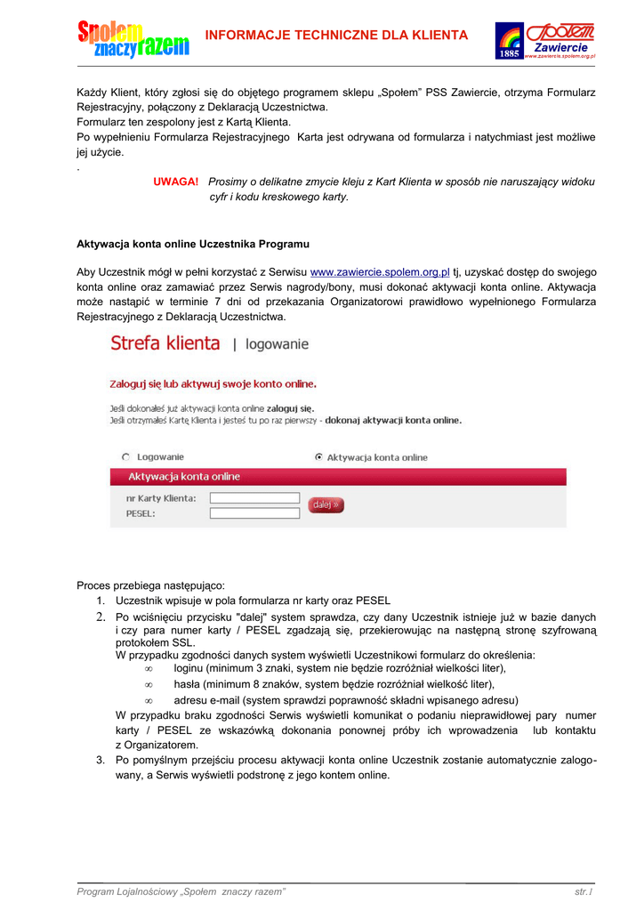 INFORMACJE TECHNICZNE DLA KLIENTA Każdy Klient, który zgłosi się do objętego programem sklepu „Społem” PSS Zawiercie, otrzyma Formularz Rejestracyjny, połączony z Deklaracją Uczestnictwa. Formularz ten zespolony jest z Kartą Klienta. Po wypełnieniu Formularza Rejestracyjnego Karta jest odrywana od formularza i natychmiast jest możliwe jej użycie. . UWAGA! Prosimy o delikatne zmycie kleju z Kart Klienta w sposób nie naruszający widoku cyfr i kodu kreskowego karty. Aktywacja konta online Uczestnika Programu Aby Uczestnik mógł w pełni korzystać z Serwisu www.zawiercie.spolem.org.pl tj, uzyskać dostęp do swojego konta online oraz zamawiać przez Serwis nagrody/bony, musi dokonać aktywacji konta online. Aktywacja może nastąpić w terminie 7 dni od przekazania Organizatorowi prawidłowo wypełnionego Formularza Rejestracyjnego z Deklaracją Uczestnictwa. Proces przebiega następująco: 1. Uczestnik wpisuje w pola formularza nr karty oraz PESEL 2. Po wciśnięciu przycisku "dalej" system sprawdza, czy dany Uczestnik istnieje już w bazie danych i czy para numer karty / PESEL zgadzają się, przekierowując na następną stronę szyfrowaną protokołem SSL. W przypadku zgodności danych system wyświetli Uczestnikowi formularz do określenia: • loginu (minimum 3 znaki, system nie będzie rozróżniał wielkości liter), • hasła (minimum 8 znaków, system będzie rozróżniał wielkość liter), • adresu e-mail (system sprawdzi poprawność składni wpisanego adresu) W przypadku braku zgodności Serwis wyświetli komunikat o podaniu nieprawidłowej pary numer karty / PESEL ze wskazówką dokonania ponownej próby ich wprowadzenia lub kontaktu z Organizatorem. 3. Po pomyślnym przejściu procesu aktywacji konta online Uczestnik zostanie automatycznie zalogowany, a Serwis wyświetli podstronę z jego kontem online. Program Lojalnościowy „Społem znaczy razem” str.1 INFORMACJE TECHNICZNE DLA KLIENTA Logowanie i wylogowanie Zalogowanie się w Serwisie jest warunkiem koniecznym, aby Uczestnik miał dostęp do swojego konta online i mógł poprzez Serwis zamawiać nagrody. Formularz logowania znajduje się na podstronie szyfrowanej protokołem SSL. Aby się zalogować, Uczestnik musi wpisać prawidłowy login i hasło, podane podczas aktywacji konta online. Po wpisaniu prawidłowych danych Serwis przekierowuje Uczestnika do podstrony z jego kontem online. W przypadku podania nieprawidłowej pary login / hasło Serwis wyświetli o tym fakcie komunikat. Ilość nieudanych prób logowania jest nieograniczona. Wylogowanie się następuje: • poprzez kliknięcie przez Uczestnika w link wylogowujący • w przypadku bezczynności przeglądarki dłużej niż limit czasu trwania sesji Reset hasła Jeśli Uczestnik nie pamięta swojego loginu i/lub hasła może skorzystać z funkcji resetowania loginu/hasła. Link do niej („Nie pamiętam loginu, hasła >”) znajduje się przy formularzu do logowania (patrz rys. powyżej). Po kliknięciu w link Serwis poprosi Uczestnika o wpisanie adresu e-mail podanego podczas aktywacji konta online oraz numeru PESEL. Jeśli adres e-mail istnieje w bazie wraz z podanym numerem PESEL system wyśle na ten adres informację o loginie wraz z nowym hasłem i instrukcją. Program Lojalnościowy „Społem znaczy razem” str.2 INFORMACJE TECHNICZNE DLA KLIENTA Bony Na podstronie Bony dodatkowo uruchomiony jest wykaz dostępnych bonów wraz z narzędziami do ich zamawiania. Dostępne są 3 rodzaje bonów: 10,-zł, 20,-zł, 50,-zł. Wyświetlane są takie informacje jak: • informacja o ilości dostępnych punktów – aktualizowana nie rzadziej niż co 9 dni od daty ich naliczenia, • zdjęcie bonu, nominał i krótki opis Zamawianie bonów online Na podstronie Bony, po zalogowaniu na swoje konto, przy każdym bonie wyświetlany będzie przycisk dodający dany bon do „koszyka”. Koszyk to mały moduł znajdujący się na podstronie Bony i Konto online, w którym Uczestnik ma możliwość stałego podglądu ilości dodanych do niego bonów wraz sumą punktów. Po dodaniu do koszyka bonu (lub większej ilości bonów) Uczestnik dokonuje wyboru (przez kliknięcie w link przy koszyku) realizacji zamówienia - Serwis przenosi go do podstrony ze szczegółowym podglądem dodanych wcześniej bonów. Tutaj Uczestnik może dokonać modyfikacji swojego zamówienia (np usunąć bon z koszyka, zmienić ilość zamawianego bonu). Serwis na bieżąco sprawdza, czy Uczestnik ma wystarczającą ilość punktów dla zamawianych przez siebie bonów, a jeśli nie ma - informuje go od razu, wyświetlając komunikat. Po kliknięciu w przycisk "dalej" Serwis wyświetli stronę z informacjami o Uczestniku (imię, nazwisko, adres) oraz zamówionymi bonami. W zamówieniu Uczestnik wskazuje sklep Spółdzielni objęty programem w którym dokona odbioru bonu. Na tym etapie Uczestnik ma jeszcze możliwość wycofania się z zamówienia lub dokonania korekty. Program Lojalnościowy „Społem znaczy razem” str.3 INFORMACJE TECHNICZNE DLA KLIENTA Po kliknięciu w przycisk „zamawiam” Serwis zapisuje w bazie danych informacje o zamówieniu oraz wysyła wiadomość z potwierdzeniem o zamówieniu na adres e-mail Uczestnika. Informacja o zamówieniu zostaje również wysłana na e-mail podmiotu obsługującego zamówienia bonów (Organizator). Następuje również wymiana zgromadzonych przez Uczestnika punktów na bon/bony i rozliczenie (odjęcie wartości punktowej bonu/bonów od dotychczas zgromadzonych przez Uczestnika punktów). Konto online Konto online Uczestnika to spersonalizowana podstrona, na której wyświetlane są w postaci tabelarycznej: a) sumaryczne zestawienie wg miesięcy transakcji Uczestnika dokonanych w sklepach Społem z Kartą oraz naliczonych za te transakcje punktów b) historia zamówionych bonów (data zamówienia, nazwa, ilość punktów pobranych za bon, status). Serwis wyświetlać będzie propozycje bonu/bonów (zdjęcie, nazwa, warto