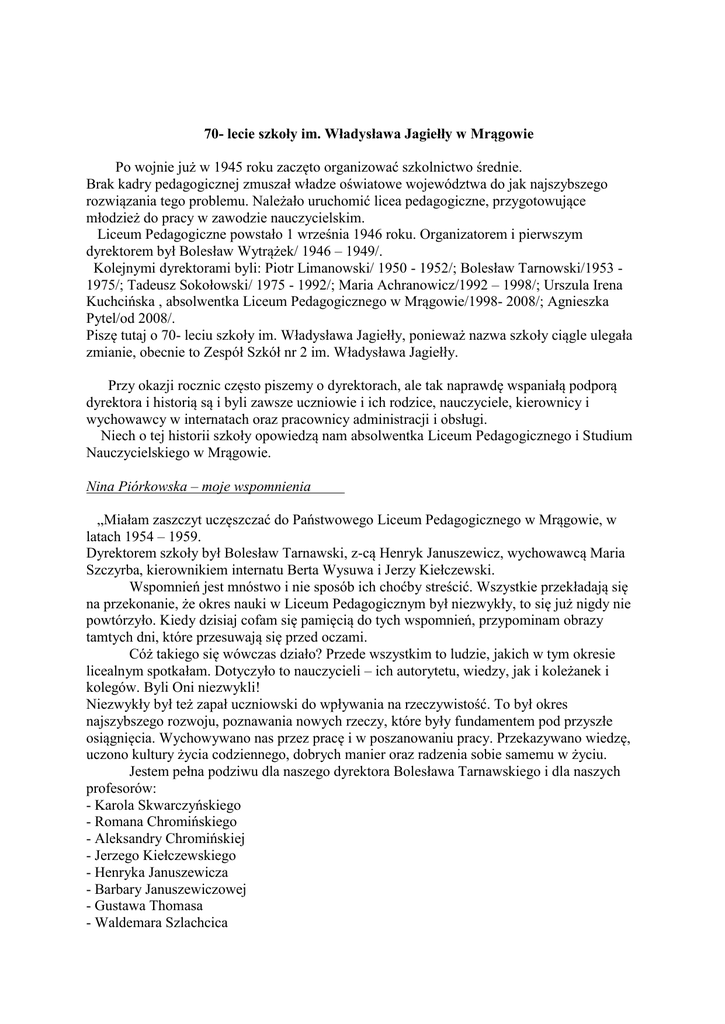 70- lecie szkoły im. Władysława Jagiełły w Mrągowie Po wojnie już w 1945 roku zaczęto organizować szkolnictwo średnie. Brak kadry pedagogicznej zmuszał władze oświatowe województwa do jak najszybszego rozwiązania tego problemu. Należało uruchomić licea pedagogiczne, przygotowujące młodzież do pracy w zawodzie nauczycielskim. Liceum Pedagogiczne powstało 1 września 1946 roku. Organizatorem i pierwszym dyrektorem był Bolesław Wytrążek/ 1946 – 1949/. Kolejnymi dyrektorami byli: Piotr Limanowski/ 1950 - 1952/; Bolesław Tarnowski/1953 1975/; Tadeusz Sokołowski/ 1975 - 1992/; Maria Achranowicz/1992 – 1998/; Urszula Irena Kuchcińska , absolwentka Liceum Pedagogicznego w Mrągowie/1998- 2008/; Agnieszka Pytel/od 2008/. Piszę tutaj o 70- leciu szkoły im. Władysława Jagiełły, ponieważ nazwa szkoły ciągle ulegała zmianie, obecnie to Zespół Szkół nr 2 im. Władysława Jagiełły. Przy okazji rocznic często piszemy o dyrektorach, ale tak naprawdę wspaniałą podporą dyrektora i historią są i byli zawsze uczniowie i ich rodzice, nauczyciele, kierownicy i wychowawcy w internatach oraz pracownicy administracji i obsługi. Niech o tej historii szkoły opowiedzą nam absolwentka Liceum Pedagogicznego i Studium Nauczycielskiego w Mrągowie. Nina Piórkowska – moje wspomnienia „Miałam zaszczyt uczęszczać do Państwowego Liceum Pedagogicznego w Mrągowie, w latach 1954 – 1959. Dyrektorem szkoły był Bolesław Tarnawski, z-cą Henryk Januszewicz, wychowawcą Maria Szczyrba, kierownikiem internatu Berta Wysuwa i Jerzy Kiełczewski. Wspomnień jest mnóstwo i nie sposób ich choćby streścić. Wszystkie przekładają się na przekonanie, że okres nauki w Liceum Pedagogicznym był niezwykły, to się już nigdy nie powtórzyło. Kiedy dzisiaj cofam się pamięcią do tych wspomnień, przypominam obrazy tamtych dni, które przesuwają się przed oczami. Cóż takiego się wówczas działo? Przede wszystkim to ludzie, jakich w tym okresie licealnym spotkałam. Dotyczyło to nauczycieli – ich autorytetu, wiedzy, jak i koleżanek i kolegów. Byli Oni niezwykli! Niezwykły był też zapał uczniowski do wpływania na rzeczywistość. To był okres najszybszego rozwoju, poznawania nowych rzeczy, które były fundamentem pod przyszłe osiągnięcia. Wychowywano nas przez pracę i w poszanowaniu pracy. Przekazywano wiedzę, uczono kultury życia codziennego, dobrych manier oraz radzenia sobie samemu w życiu. Jestem pełna podziwu dla naszego dyrektora Bolesława Tarnawskiego i dla naszych profesorów: - Karola Skwarczyńskiego - Romana Chromińskiego - Aleksandry Chromińskiej - Jerzego Kiełczewskiego - Henryka Januszewicza - Barbary Januszewiczowej - Gustawa Thomasa - Waldemara Szlachcica - Jana Dwilewicza - Alfredy Piotrowskiej - Tadeusza Jędrzejewskiego - Jadwigi Jędrzejewskiej - Mariana Dłuskiego - Romana Kozłowskiego - Zofii Kozłowskiej - Ewy Hołowni - Hanny Korolec - Irminy Nowickiej - Włodzimierza Obłamskiego - Bolesława Martko - Jana Błażejczyka - Mariana Zborowskiego - Ireny Jeske – kierownika Szkoły Ćwiczeń Nauczyciele formowali z nas pedagogów, społeczników, ludzi świadomych misji, jakiej w tych trudnych czasach podejmują się. Mówili o nas: „ Młodzież wspaniała. W ogniu żywych dyskusji, ścierających się opinii i sądów wypowiadanych gwarą warmińsko-mazurską, kurpiowską, wileńską – czasem popartą określeniami niemieckimi, rosyjskimi, czy ukraińskimi rodził się nowy człowiek charakteryzujący się mocnym charakterem, stanowczością, ambicją, poczuciem obowiązku i chęcią bycia kimś”. Nauce towarzyszył teatr, muzyka, śpiew – a wszystko to przepojone było patriotycznym kształtowaniem świadomości historycznej”. Kiedy opuszczaliśmy szkołę (5-letnie LP) po maturze – nasza wychowawczyni Maria Szczyrba i inni nauczyciele dawali nam wskazówki na przyszłość. Pamiętajcie!: – nie stójcie w miejscu – pogłębiajcie swoją wiedzę – wprowadzajcie innowacje, szukając nowych rozwiązań metodycznych i wychowawczych – Ważne w życiu abyście dobierali sobie partnerów godnych siebie Myślę, że wszyscy odebraliśmy te wskazówki poważnie. Jestem dumna, że ukończyłam Liceum Pedagogiczne w Mrągowie, mając wspaniałych nauczycieli, którzy kształtowali nasze umysły, wcielali w życie ideały i wartości. Serdecznie dziękuję za ich pracę i trud. Nina Piórkowska z.d Semeniuk, absolwentka PLP 1959.” Beatka, moja uczennica tak wspomina swoją szkolę: „Wspomnienia ze szkoły. Nazywam się Beata Somerschaf z domu Domagała. Jestem Absolwentką z rocznika 1987 to znaczy, że rozpoczęłam naukę w Studium Wychowania Przedszkolnego w 1981 roku z skończyłam Studium Nauczycielskie właśnie w 1987 roku. Od początku mieszkałam w internacie na ul. Wojska Polskiego. Miałam wtedy 14 lat i wyjechałam z domu , jak się potem okazało, już na zawsze Moje wspomnienia z tamtych czasów to : Wędrówki z internatu do szkoły na śniadanie i kolacje – na stołówkę Obieranki - obieranie ziemniaków na obiad dla całej szkoły wg grafiku. Idziesz do szkoły na 6.30 ( o ile dobrze pamiętam) a potem obierasz strasznie dużo ziemniaków. Dyżury na stołówce na przerwach obiadowych tzn odieranie brudnych naczyń, wyrzucanie resztek, rozkładanie czystych naczyń na stolikach na następną przerwę dla kolejnych osób Obiady wszystko było na kartki tzn każda osoba dostawała w Urzędzie oficjalną kartkę z oznaczeniem produktów i ich gramatury, do kupienia przez cały miesiąc. Pani intendentka w szkole, wycinała część produktów z tych naszych kartek żebyśmy mogły jeść obiady. A jadłyśmy np. ,,podeszwę” czyli wołowe mięso w kształcie placka z sosem; jajko w sosie musztardowym z ziemniakami; kiełbasa parówkowa z ziemniakami ; makaron z truskawkami . Nie jedliście czegoś takiego – wiele straciliście. Wykopki - jesienią każda klasa jechała do PGR