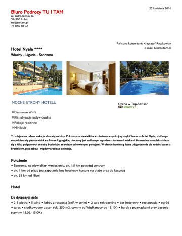 27 kwietnia 2016 Biuro Podrozy TU I TAM ul. Odrodzenia 3a 59-300 Lubin [email protected] 76 846 18 02 Hotel Nyala **** Państwa konsultant: Krzysztof Raczkowiak e-mail: [email protected] Włochy - Liguria - Sanremo MOCNE STRONY HOTELU Ocena w TripAdvisor »Darmowe Wi-Fi »Klimatyzacja indywidualna »Pokoje rodzinne »Miniklub To miejsce na udane wakacje dla całej rodziny. Położony na niewielkim wzniesieniu w spokojnej części Sanremo hotel Nyala, z którego rozpościera się piękny widok na Morze Liguryjskie, otoczony jest zadbanym ogrodem z tarasem i leżakami. Kameralny kompleks składa się z kilku połączonych ze sobą budynków ze świeżo odnowionymi pokojami. W ofercie hotelu są liczne udogodnienia dla rodzin: basen z brodzikiem, plac zabaw i międzynarodowe animacje. Położenie • Sanremo, na niewielkim wzniesieniu, ok. 1,5 km powyżej centrum • ok. 1 km od plaży (na zapytanie bus hotelowy kursuje na plażę oraz do kasyna) • ok. 55 km od Nicei Hotel Do dyspozycji gości • 2-3 piętra • 5 wind • lobby z recepcją (sejf, w cenie) • 2 sale rekreacyjne • bar hotelowy • restauracja • ogród • taras • słodkowodny basen (ok. 250 m2, czynny od Wielkanocy do 15.10.) • barek z przekąskami przy basenie (czynny 15.06.-15.09.) Wyposażenie • leżaki i parasole (przy basenie w cenie, na plaży płatne) • Wi-Fi (w określonych miejscach, w cenie) Dodatkowe udogodnienia • parking Karty Visa, Diners, MasterCard, Amex Kategoria lokalna 4 gwiazdki Dodatkowe informacje • hotel akceptuje psy (na zapytanie, w cenie) Liczba pokojów 85 Pokoje Pokój 2-osobowy (DZX1) • 1-3 os. • ok. 22 m2 • prysznic • WC • suszarka do włosów • indywidualnie regulowana klimatyzacja (czynna 15.06.-15.09.) • sejf • minibar • TV sat. • tel. Pokój 2-osobowy (DZX2) • 1-3 os. • balkon • prysznic • WC • suszarka do włosów • indywidualnie regulowana klimatyzacja (czynna 15.06.-15.09.) • sejf • minibar • TV sat. • tel. Pokój 2-osobowy (DZX3) • 1-3 os. • balkon • boczny widok na morze • wanna • WC • suszarka do włosów • indywidualnie regulowana klimatyzacja (czynna 15.06.-15.09.) • sejf • minibar • TV sat. • tel. Pokój rodzinny (FZX1) • 2-4 os. • ok. 32 m2 • pokój dzienno-sypialny • prysznic • WC • suszarka do włosów • indywidualnie regulowana klimatyzacja (czynna 15.06.-15.09.) • sejf • minibar • TV sat. • tel. Wyżywienie Dwa posiłki • śniadanie w formie bufetu • kolacja z 4-daniowym menu do wyboru (w lipcu i sierpniu w formie bufetu). Śniadania • w formie bufetu. Pełne wyżywienie • bogaty bufet śniadaniowy • obiad • kolacja • w soboty uroczysta kolacja z muzyką na żywo. Dla dzieci • łóżeczka (w cenie, należy zgłosić przy rezerwacji) • plac zabaw • brodzik wydzielony w basenie głównym • codziennie 4 godz. zajęć w miniklubie dla dzieci 3-11 lat (w terminie 27.06-31.08) Sport i Wellness W cenie • basen o powierzchni 250 m2 z brodzikiem. Płatne • wypożyczalnia rowerów miejskich i górskich • 12 kortów tenisowych (ok. 400 m od hotelu) • pole golfowe (18 dołków, w odległości ok. 6 km od hotelu) • centrum fitness (w odległości ok. 400 m od hotelu z salą fitness, sauną, łaźnią turecką, jacuzzi oraz ofertą masaży).