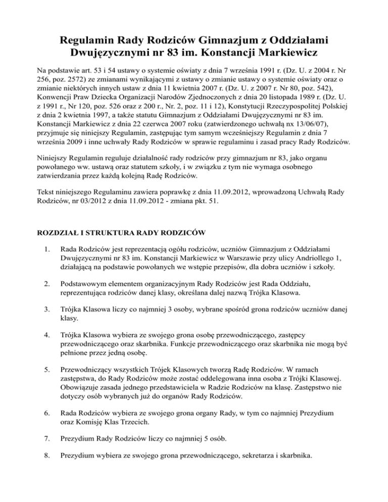 Regulamin Rady Rodziców Gimnazjum z Oddziałami Dwujęzycznymi nr 83 im. Konstancji Markiewicz Na podstawie art. 53 i 54 ustawy o systemie oświaty z dnia 7 września 1991 r. (Dz. U. z 2004 r. Nr 256, poz. 2572) ze zmianami wynikającymi z ustawy o zmianie ustawy o systemie oświaty oraz o zmianie niektórych innych ustaw z dnia 11 kwietnia 2007 r. (Dz. U. z 2007 r. Nr 80, poz. 542), Konwencji Praw Dziecka Organizacji Narodów Zjednoczonych z dnia 20 listopada 1989 r. (Dz. U. z 1991 r., Nr 120, poz. 526 oraz z 200 r., Nr. 2, poz. 11 i 12), Konstytucji Rzeczypospolitej Polskiej z dnia 2 kwietnia 1997, a także statutu Gimnazjum z Oddziałami Dwujęzycznymi nr 83 im. Konstancji Markiewicz z dnia 22 czerwca 2007 roku (zatwierdzonego uchwałą nx 13/06/07), przyjmuje się niniejszy Regulamin, zastępując tym samym wcześniejszy Regulamin z dnia 7 września 2009 i inne uchwały Rady Rodziców w sprawie regulaminu i zasad pracy Rady Rodziców. Niniejszy Regulamin reguluje działalność rady rodziców przy gimnazjum nr 83, jako organu powołanego ww. ustawą oraz statutem szkoły, i w związku z tym nie wymaga osobnego zatwierdzania przez każdą kolejną Radę Rodziców. Tekst niniejszego Regulaminu zawiera poprawkę z dnia 11.09.2012, wprowadzoną Uchwałą Rady Rodziców, nr 03/2012 z dnia 11.09.2012 - zmiana pkt. 51. ROZDZIAŁ I STRUKTURA RADY RODZICÓW 1. Rada Rodziców jest reprezentacją ogółu rodziców, uczniów Gimnazjum z Oddziałami Dwujęzycznymi nr 83 im. Konstancji Markiewicz w Warszawie przy ulicy Andriollego 1, działającą na podstawie powołanych we wstępie przepisów, dla dobra uczniów i szkoły. 2. Podstawowym elementem organizacyjnym Rady Rodziców jest Rada Oddziału, reprezentująca rodziców danej klasy, określana dalej nazwą Trójka Klasowa. 3. Trójka Klasowa liczy co najmniej 3 osoby, wybrane spośród grona rodziców uczniów danej klasy. 4. Trójka Klasowa wybiera ze swojego grona osobę przewodniczącego, zastępcy przewodniczącego oraz skarbnika. Funkcje przewodniczącego oraz skarbnika nie mogą być pełnione przez jedną osobę. 5. Przewodniczący wszystkich Trójek Klasowych tworzą Radę Rodziców. W ramach zastępstwa, do Rady Rodziców może zostać oddelegowana inna osoba z Trójki Klasowej. Obowiązuje zasada jednego przedstawiciela w Radzie Rodziców na klasę. Zastępstwo nie dotyczy osób wybranych już do organów Rady Rodziców. 6. Rada Rodziców wybiera ze swojego grona organy Rady, w tym co najmniej Prezydium oraz Komisję Klas Trzecich. 7. Prezydium Rady Rodziców liczy co najmniej 5 osób. 8. Prezydium wybiera ze swojego grona przewodniczącego, sekretarza i skarbnika. 9. Komisję Klas Trzecich składa się z osób reprezentujących klasy trzecie i liczy co najmniej 2 osoby. Komisja Klas Trzecich powołana jest do prowadzenia spraw właściwych tylko dla klas trzecich szkoły, w tym związanych z egzaminami końcowymi oraz balem trzecich klas. W skład Komisji Klas Trzecich mogą wchodzić członkowie innych organów Rady Rodziców. 10. Rada Rodziców może powoływać inne stałe lub doraźne komisje i zespoły, wybrane spośród siebie z ewentualnym udziałem osób spoza Rady Rodziców, dla realizacji określonych przez Radę Rodziców zadań. ROZDZIAŁ II WYBORY I KADENCJA RADY RODZICÓW 11. Wybory do Trójek Klasowych odbywają się z mocy prawa, w każdym nowym roku szkolnym, w terminie pierwszego wyznaczonego przez szkołę zebrania z rodzicami. 12. Wybory do Trójek Klasowych są tajne. Suma wszystkich głosów jest równa liczbie uczniów klasy, a w głosowaniu jednego ucznia reprezentuje jeden rodzic. 13. Głosowanie przeprowadza Komisja skrutacyjna wybrana w sposób jawny, zwykłą większością głosów. W skład komisji skrutacyjnej wchodzą co najmniej dwie osoby. Członkowie komisji skrutacyjnej nie tracą czynnego ani biernego prawa wyborczego do Trójki Klasowej. 14. Głosowanie polega na oddaniu głosu za lub przeciw, na każdego wskazanego do Trójki Klasowej kandydata. Do Trójki Klasowej wchodzą osoby które uzyskały największą liczbę głosów. W przypadku równej liczby głosów oddanych na kandydata, głosowanie powtarza się do uzyskania zwykłej przewagi głosów dla jednego z kandydatów. 15. Wyniki wyborów do Trójek Klasowych dostępne są do publicznej wiadomości rodziców danej klasy. 16. Wybory do organów Rady Rodziców odbywają się w każdym nowym roku szkolnym, w terminie pierwszego wyznaczonego przez szkołę zebrania z rodzicami, a w uzasadnionych przypadkach w innym terminie, nie później jednak niż do 30 września danego roku. Nowe organy Rady Rodziców zaczynają pełnić swoje obowiązki z chwilą wybrania ich składu. Do tego czasu i nie dłużej niż do 30 września danego roku, swoje obowiązki pełnią organy Rady Rodziców wybrane w poprzednim roku szkolnym, niezależnie od tego czy dzieci ich członków są czy nie są nadal uczniami szkoły. 17. Wybory do organów Rady Rodziców są jawne i odbywają się zwykłą większością głosów. W przypadku braku możliwości określenia przewagi głosów, głosowanie powtarza się do skutku. 18. Każda kandydatura do danego organu Rady Rodziców, głosowana jest niezależnie. 19. W każdym głosowaniu do Trójki Klasowej lub do organów Rady Rodziców, głos można oddać osobiście lub poprzez pisemnie upoważnionego przedstawiciela. 20. W przypadku ubytku więcej niż 1/3 składu Trójki Klasowej, dopuszcza się przeprowadzenie wyborów uzupełniających, na ogólnych okreslonych regulaminem zasadach. Analogiczne obowiązuje dla każdego organu Rady Rodziców. 21. Na wniosek conajmniej 2/3 rodziców klasy, przeprowadza się nowe wybory do Trójki Klasowej. Analogiczne na wniosek conajmniej 2/3 Rady Rodziców, przeprowadza się nowe wybory do organów rady. 22. Mając na uwadze zachowanie ciągłości prowadzonych przez Radę Rodziców spraw, do grona kandydatów, w wyborach w każdym nowym roku szkolnym, automatycznie włącza się 