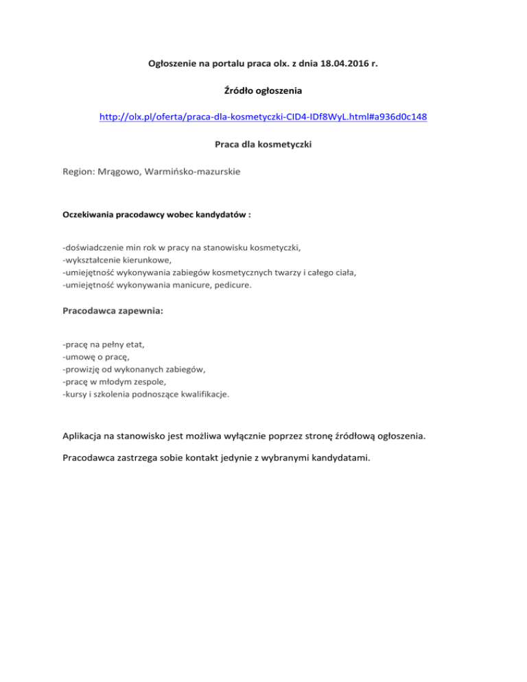 Ogłoszenie na portalu praca olx. z dnia 18.04.2016 r. Źródło ogłoszenia http://olx.pl/oferta/praca-dla-kosmetyczki-CID4-IDf8WyL.html#a936d0c148 Praca dla kosmetyczki Region: Mrągowo, Warmińsko-mazurskie Oczekiwania pracodawcy wobec kandydatów : -doświadczenie min rok w pracy na stanowisku kosmetyczki, -wykształcenie kierunkowe, -umiejętność wykonywania zabiegów kosmetycznych twarzy i całego ciała, -umiejętność wykonywania manicure, pedicure. Pracodawca zapewnia: -pracę na pełny etat, -umowę o pracę, -prowizję od wykonanych zabiegów, -pracę w młodym zespole, -kursy i szkolenia podnoszące kwalifikacje. Aplikacja na stanowisko jest możliwa wyłącznie poprzez stronę źródłową ogłoszenia. Pracodawca zastrzega sobie kontakt jedynie z wybranymi kandydatami.