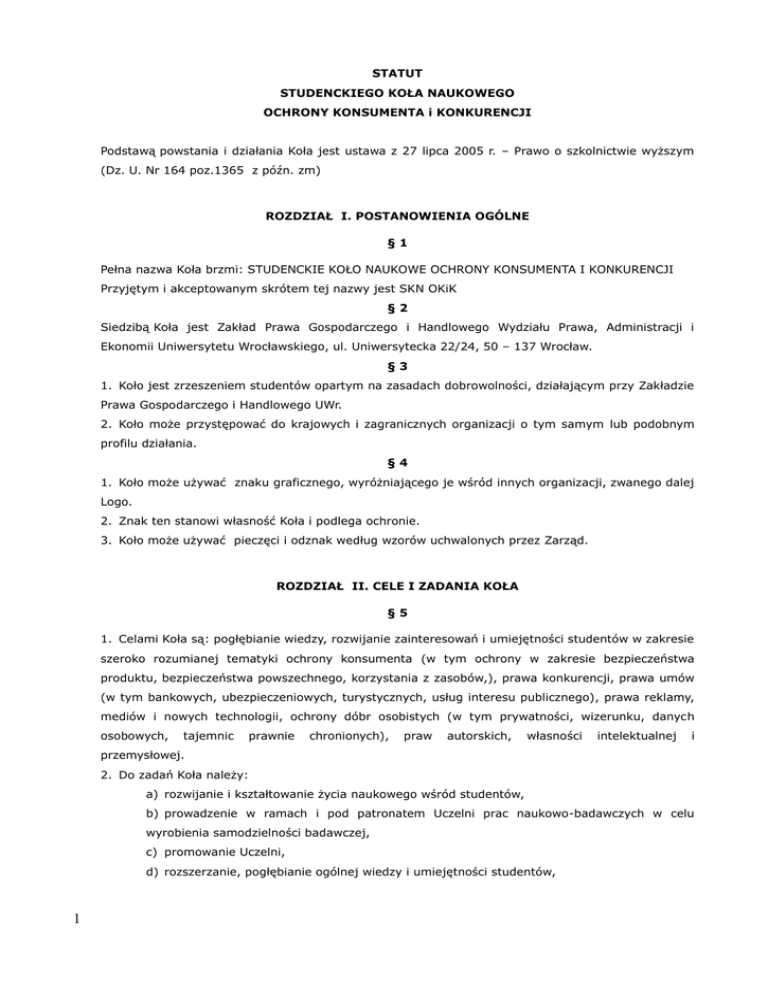 STATUT STUDENCKIEGO KOŁA NAUKOWEGO OCHRONY KONSUMENTA i KONKURENCJI Podstawą powstania i działania Koła jest ustawa z 27 lipca 2005 r. – Prawo o szkolnictwie wyższym (Dz. U. Nr 164 poz.1365 z późn. zm) ROZDZIAŁ I. POSTANOWIENIA OGÓLNE §1 Pełna nazwa Koła brzmi: STUDENCKIE KOŁO NAUKOWE OCHRONY KONSUMENTA I KONKURENCJI Przyjętym i akceptowanym skrótem tej nazwy jest SKN OKiK §2 Siedzibą Koła jest Zakład Prawa Gospodarczego i Handlowego Wydziału Prawa, Administracji i Ekonomii Uniwersytetu Wrocławskiego, ul. Uniwersytecka 22/24, 50 – 137 Wrocław. §3 1. Koło jest zrzeszeniem studentów opartym na zasadach dobrowolności, działającym przy Zakładzie Prawa Gospodarczego i Handlowego UWr. 2. Koło może przystępować do krajowych i zagranicznych organizacji o tym samym lub podobnym profilu działania. §4 1. Koło może używać znaku graficznego, wyróżniającego je wśród innych organizacji, zwanego dalej Logo. 2. Znak ten stanowi własność Koła i podlega ochronie. 3. Koło może używać pieczęci i odznak według wzorów uchwalonych przez Zarząd. ROZDZIAŁ II. CELE I ZADANIA KOŁA §5 1. Celami Koła są: pogłębianie wiedzy, rozwijanie zainteresowań i umiejętności studentów w zakresie szeroko rozumianej tematyki ochrony konsumenta (w tym ochrony w zakresie bezpieczeństwa produktu, bezpieczeństwa powszechnego, korzystania z zasobów,), prawa konkurencji, prawa umów (w tym bankowych, ubezpieczeniowych, turystycznych, usług interesu publicznego), prawa reklamy, mediów i nowych technologii, ochrony dóbr osobistych (w tym prywatności, wizerunku, danych osobowych, tajemnic prawnie chronionych), praw autorskich, własności intelektualnej i przemysłowej. 2. Do zadań Koła należy: a) rozwijanie i kształtowanie życia naukowego wśród studentów, b) prowadzenie w ramach i pod patronatem Uczelni prac naukowo-badawczych w celu wyrobienia samodzielności badawczej, c) promowanie Uczelni, d) rozszerzanie, pogłębianie ogólnej wiedzy i umiejętności studentów, 1 e) rozwijanie krajowych i międzynarodowych kontaktów i współpracy naukowej, f) rozwijanie umiejętności organizacyjnych i interpersonalnych członków Koła, g) integracja środowiska studenckiego i naukowego, h) nawiązywanie współpracy z innymi organizacjami, kołami naukowymi i ośrodkami akademickimi zajmującymi się pokrewną tematyką. §6 Cele i zadania, o których mowa w § 5, realizowane są w szczególności poprzez: a) samodzielne oraz we współpracy z innymi instytucjami organizowanie posiedzeń naukowych i dyskusyjnych, b) organizowanie odczytów, wykładów, warsztatów oraz konferencji naukowych i dydaktycznych itp., c) organizowanie wyjazdów na krajowe i zagraniczne seminaria, konferencje, spotkania z podobnymi organizacjami, organizowanie i udział w obozach naukowych. d) prowadzenie serwisu informacyjnego w postaci witryny internetowej, e) współpracę z krajowymi i zagranicznymi instytucjami i towarzystwami naukowymi, f) uczestnictwo w krajowym i międzynarodowym ruchu naukowym, prezentowanie osiągnięć własnych Koła oraz Uczelni, g) rozwijanie współpracy z instytucjami oświatowymi i podmiotami prowadzącymi działalność gospodarczą, h) wydawanie prac naukowo – badawczych studentów, biuletynów, broszur z dziedziny prawa własności, prawa gospodarczego i nauk pokrewnych, i) poparcie dla kreatywnych przedsięwzięć studenckich zgodnych ze Statutem Koła, j) tworzenie sekcji do wykonywania zadań określonych Statutem Koła, k) inne formy działalności społecznej, zgodne z założeniami Statutu. §7 Realizując swoje statutowe cele i zadania, Koło opiera się na społecznej pracy swoich członków. W przypadkach szczególnych możliwe jest skorzystanie z pomocy innych organizacji i podmiotów. ROZDZIAŁ III. ORGANIZACJA KOŁA §8 Członkowie Koła dzielą się na: a) członków-kandydatów, b) członków zwyczajnych, c) członków wspierających, d) członków honorowych. 2 §9 1. Do Koła mogą przystąpić studenci Wydziału Prawa, Administracji i Ekonomii niezależnie od trybu podjętych studiów licencjackich, magisterskich, którzy popierają cele Koła oraz deklarują i dają rękojmię czynnego uczestnictwa w realizacji tych celów. 2. Studenci studiów doktoranckich mogą uczestniczyć w pracach Koła w charakterze członków wspierających. 3. Każdy nowy członek przystępujący do Koła zostaje członkiem-kandydatem. Członek-kandydat powinien zapoznać się ze Statutem Koła i po okresie próbnym złożyć deklarację przystąpienia do Koła. 4. Członek-kandydat ma prawo: a) uczestniczenia w programach prowadzonych przez Koło i we wszystkich przedsięwzięciach Koła zgodnie z obowiązującymi zasadami; b) zgłaszania wniosków i zapytań do władz Koła we wszystkich sprawach dotyczących Koła; c) korzystania z wszelkich pomocy naukowych oraz urządzeń będących w dyspozycji Koła pod nadzorem członka zwyczajnego Koła lub po uzyskaniu pisemnej zgody jednego z członków Zarządu Koła; d) odwoływania się od decyzji Zarządu Koła do Walnego Zgromadzenia Członków, w zakresie decyzji o przyjęciu do Koła. 5. Okres próbny trwa jeden miesiąc kalendarzowy - do czasu podjęcia przez Zarząd Koła uchwały w przedmiocie przyjęcia kandydata w poczet członków zwyczajnych. W przypadku nieuzasadnionej zwłoki w podjęciu uchwały przez Zarząd, kandydatowi przysługuje skarga do Walnego Zgromadzenia, którego uchwała w tym przedmiocie jest ostateczna. 7. W uzasadnionych przypadkach Zarząd może przyjąć kandydata w poczet członków zwyczajnych przed upływem okresu próbnego. Uchwała Zarządu podlega zatwierdzeniu przez Walne Zgromadzenie. § 10 1. Członkiem wspierającym może być osoba fizyczna lub prawna uznająca i wspierająca cele Koła. 2. Członkiem honorowym może być osoba fizyczna zasłużona dla Koła lub szczególnie zasłużona dla nauki 3. Tytuł członka wspierającego lub honorowego nadaje Walne Zgro