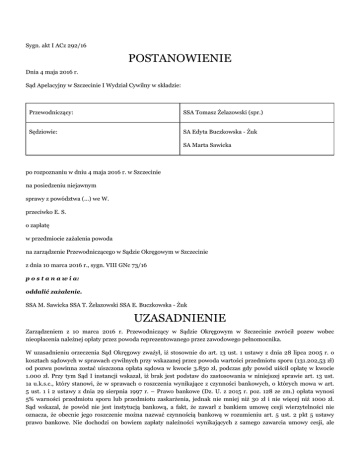 Sygn. akt I ACz 292/16 POSTANOWIENIE Dnia 4 maja 2016 r. Sąd Apelacyjny w Szczecinie I Wydział Cywilny w składzie: Przewodniczący: SSA Tomasz Żelazowski (spr.) Sędziowie: SA Edyta Buczkowska - Żuk SA Marta Sawicka po rozpoznaniu w dniu 4 maja 2016 r. w Szczecinie na posiedzeniu niejawnym sprawy z powództwa (...) we W. przeciwko E. S. o zapłatę w przedmiocie zażalenia powoda na zarządzenie Przewodniczącego w Sądzie Okręgowym w Szczecinie z dnia 10 marca 2016 r., sygn. VIII GNc 73/16 p o s t a n a w i a: oddalić zażalenie. SSA M. Sawicka SSA T. Żelazowski SSA E. Buczkowska - Żuk UZASADNIENIE Zarządzeniem z 10 marca 2016 r. Przewodniczący w Sądzie Okręgowym w Szczecinie zwrócił pozew wobec nieopłacenia należnej opłaty przez powoda reprezentowanego przez zawodowego pełnomocnika. W uzasadnieniu orzeczenia Sąd Okręgowy zważył, iż stosownie do art. 13 ust. 1 ustawy z dnia 28 lipca 2005 r. o kosztach sądowych w sprawach cywilnych przy wskazanej przez powoda wartości przedmiotu sporu (131.202,53 zł) od pozwu powinna zostać uiszczona opłata sądowa w kwocie 3.850 zł, podczas gdy powód uiścił opłatę w kwocie 1.000 zł. Przy tym Sąd I instancji wskazał, iż brak jest podstaw do zastosowania w niniejszej sprawie art. 13 ust. 1a u.k.s.c., który stanowi, że w sprawach o roszczenia wynikające z czynności bankowych, o których mowa w art. 5 ust. 1 i 2 ustawy z dnia 29 sierpnia 1997 r. – Prawo bankowe (Dz. U. z 2015 r. poz. 128 ze zm.) opłata wynosi 5% warności przedmiotu sporu lub przedmiotu zaskarżenia, jednak nie mniej niż 30 zł i nie więcej niż 1000 zł. Sąd wskazał, że powód nie jest instytucją bankową, a fakt, że zawarł z bankiem umowę cesji wierzytelności nie oznacza, że obecnie jego roszczenie można nazwać czynnością bankową w rozumieniu art. 5 ust. 2 pkt 5 ustawy prawo bankowe. Nie dochodzi on bowiem zapłaty należności wynikających z samego zawarcia umowy cesji, ale roszczenia, jakie nabył w drodze cywilnoprawnej umowy, które w tej sytuacji przestało być już czynnością bankową. Sąd podkreślił, że czynność bankowa to czynność prawna o charakterze obligacyjnym, której przynajmniej jedną ze stron jest bank. W ocenie Sądu I instancji dochodzone roszczenie nie jest należnością wynikającą bezpośrednio z udzielonego kredytu bankowego, ale już należnością wynikająca z cywilnoprawnej umowy przelewu wierzytelności, która to umowa reguluje wysokość należności i sposób naliczania odsetek. Podniósł również argumentację związaną z wprowadzaniem omawianej regulacji. Zażalenie na powyższe postanowienie wniosła strona powodowa, która zarzuciła temu rozstrzygnięciu naruszenie przepisu art. 13 ust. 1a ustawy z dnia 28 lipca 2005 r. o kosztach sądowych w sprawach cywilnych poprzez jego niezastosowanie w okolicznościach niniejszej sprawy i uznanie, że strona powodowa winna uiścić opłatę sądową od pozwu w wysokości wyższej niż 1.000 zł. W oparciu o powyższe wniosła o uchylenie zarządzenia o zwrocie pozwu, zasądzenie na rzecz strony powodowej zwrotu kosztów wywołanych wniesieniem zażalenia, w tym kosztów zastępstwa prawnego według norm przepisanych, a także domagała się zwrotu opłaty sądowej od zażalenia. W uzasadnieniu wskazał, że nie jest bankiem, jednakże zgodnie z art. 5 ust. 1 pkt 3 prawa bankowego czynnością bankową jest udzielanie kredytów. W niniejszej sprawie strona powodowa dochodzi roszczenia wynikającego z umowy kredytu hipotecznego zawartej przez pozwanego z (...) Bank S.A., a więc z czynności bankowej. Sama bowiem cesja nie zmienia pierwotnego charakteru zobowiązania, a jedynie stanowi podstawę przejścia praw z tej umowy. W konsekwencji strona powodowa była obowiązana uiścić opłatę od pozwu w wysokości 5% wartości sporu, nie większej jednak niż 1000 zł, zgodnie z 13 ust. 1a u.k.s.c. Powód wskazał, iż wyżej powołany przepis wprowadza rozróżnienie spraw o prawa majątkowe na sprawy wynikające z czynności bankowych oraz pozostałe sprawy, których źródłem nie są czynności bankowe. Rozróżnienie to nastąpiło jedynie w oparciu o kryterium przedmiotowe, ustawa pomija kwestie tego, jaki podmiot występuje z roszczeniem. W niniejszej sprawie źródłem roszczenia jest umowa kredytu, a nie umowa przelewu wierzytelności, bowiem roszczenie o zapłatę nie powstało na skutek zawarcia umowy przelewu wierzytelności. Skutkiem przelewu wierzytelności była jedynie zmiana podmiotu uprawnionego do dochodzenia roszczenia, nie zmieniło się natomiast jego pierwotnego źródła. Nie ma znaczenia, że strona powodowa nie jest bankiem, ponieważ ustawodawca oparł się jedynie na kryterium przedmiotowym. W ocenie powoda jednoznaczny wynik wykładni językowej potwierdza kontekst historyczny, względy celowościowe (ochrona konsumentów, którzy ostatecznie ponoszą koszty przegranego procesu), a także brak racjonalnego uzasadnienia dla zróżnicowania wysokości opłaty sądowej dla podmiotów dochodzących roszczeń z tytułu czynności bankowych. Sąd Apelacyjny zważył co następuje. Zażalenie powoda nie zasługiwało na uwzględnienie. Sąd Apelacyjny w całości podziela ustalenia faktyczne na jakie powołał się Sąd Okręgowy jak i ocenę prawną, zaprezentowaną przez ten Sąd w uzasadnieniu zaskarżonego zarządzenia. Niezbędnym w niniejszej sprawie było ustalenie, czy roszczenie powoda wynikało z umowy kredytu, jaką (...) Bank S.A. zawarł z pozwaną, a więc czy dotyczyło czynności bankowej, czy też podstawą dochodzonego w tej sprawie roszczenia była wierzytelność powoda wobec pozwanej powstała na skutek zawarcia umowy przelewu wierzytelności przysługującej bankowi. Od tej oceny zależała wysokość opłaty, jaką powód zobowiązany był wnieść tytułem opłaty od pozwu. W pierwszej kolejności wskazać należy, iż w prawie bankowym nie zdefiniowano samego pojęcia „czynności bankowej”. 
