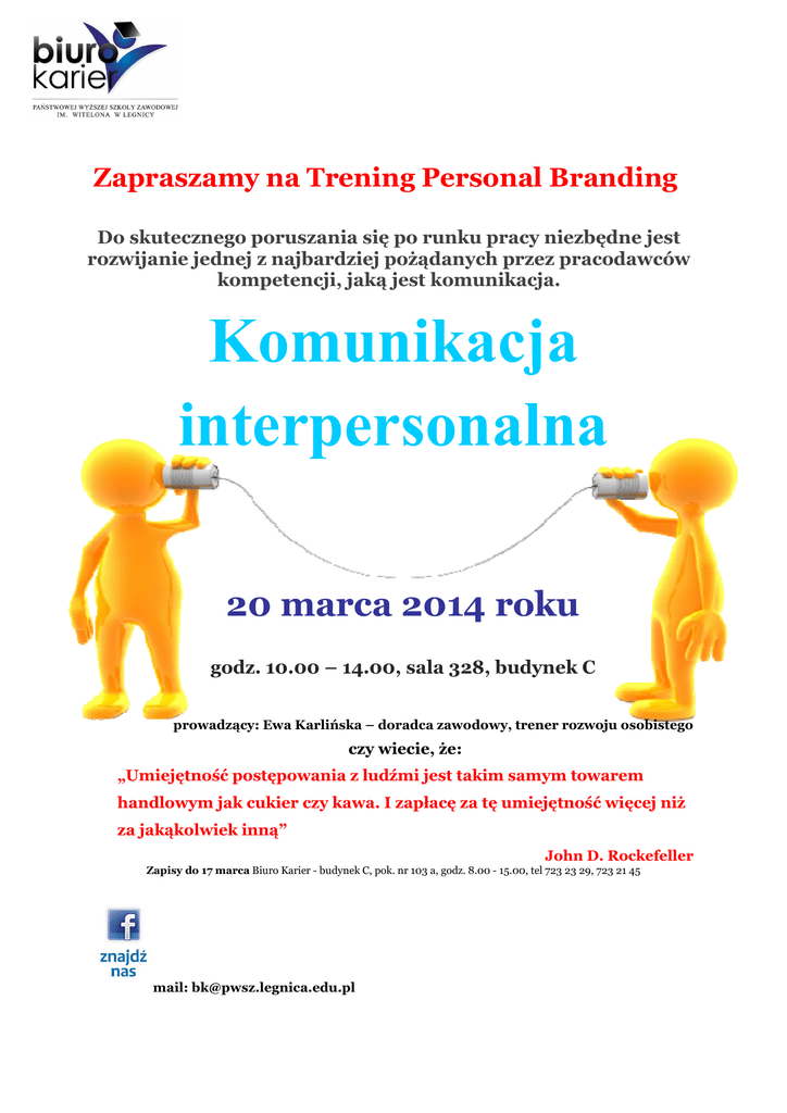 Zapraszamy na Trening Personal Branding Do skutecznego poruszania się po runku pracy niezbędne jest rozwijanie jednej z najbardziej pożądanych przez pracodawców kompetencji, jaką jest komunikacja. Komunikacja interpersonalna 20 marca 2014 roku godz. 10.00 – 14.00, sala 328, budynek C prowadzący: Ewa Karlińska – doradca zawodowy, trener rozwoju osobistego czy wiecie, że: „Umiejętność postępowania z ludźmi jest takim samym towarem handlowym jak cukier czy kawa. I zapłacę za tę umiejętność więcej niż za jakąkolwiek inną” John D. Rockefeller Zapisy do 17 marca Biuro Karier - budynek C, pok. nr 103 a, godz. 8.00 - 15.00, tel 723 23 29, 723 21 45 mail: [email protected]