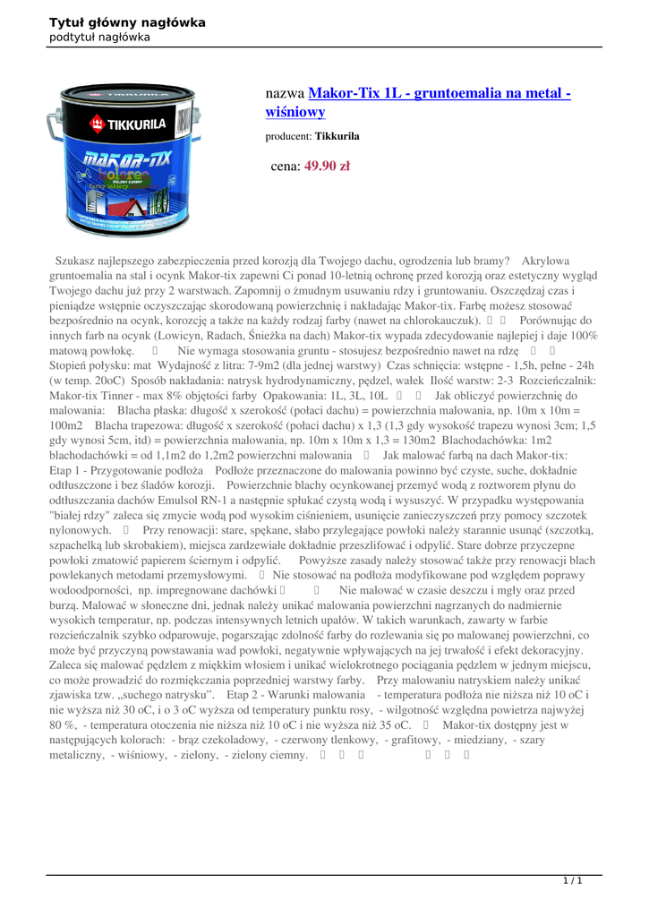 Tytuł główny nagłówka podtytuł nagłówka nazwa Makor-Tix 1L - gruntoemalia na metal wiśniowy producent: Tikkurila cena: 49.90 zł Szukasz najlepszego zabezpieczenia przed korozją dla Twojego dachu, ogrodzenia lub bramy? Akrylowa gruntoemalia na stal i ocynk Makor-tix zapewni Ci ponad 10-letnią ochronę przed korozją oraz estetyczny wygląd Twojego dachu już przy 2 warstwach. Zapomnij o żmudnym usuwaniu rdzy i gruntowaniu. Oszczędzaj czas i pieniądze wstępnie oczyszczając skorodowaną powierzchnię i nakładając Makor-tix. Farbę możesz stosować bezpośrednio na ocynk, korozcję a także na każdy rodzaj farby (nawet na chlorokauczuk). Porównując do innych farb na ocynk (Lowicyn, Radach, Śnieżka na dach) Makor-tix wypada zdecydowanie najlepiej i daje 100% matową powłokę. Nie wymaga stosowania gruntu - stosujesz bezpośrednio nawet na rdzę Stopień połysku: mat Wydajność z litra: 7-9m2 (dla jednej warstwy) Czas schnięcia: wstępne - 1,5h, pełne - 24h (w temp. 20oC) Sposób nakładania: natrysk hydrodynamiczny, pędzel, wałek Ilość warstw: 2-3 Rozcieńczalnik: Makor-tix Tinner - max 8% objętości farby Opakowania: 1L, 3L, 10L Jak obliczyć powierzchnię do malowania: Blacha płaska: długość x szerokość (połaci dachu) = powierzchnia malowania, np. 10m x 10m = 100m2 Blacha trapezowa: długość x szerokość (połaci dachu) x 1,3 (1,3 gdy wysokość trapezu wynosi 3cm; 1,5 gdy wynosi 5cm, itd) = powierzchnia malowania, np. 10m x 10m x 1,3 = 130m2 Blachodachówka: 1m2 blachodachówki = od 1,1m2 do 1,2m2 powierzchni malowania Jak malować farbą na dach Makor-tix: Etap 1 - Przygotowanie podłoża Podłoże przeznaczone do malowania powinno być czyste, suche, dokładnie odtłuszczone i bez śladów korozji. Powierzchnie blachy ocynkowanej przemyć wodą z roztworem płynu do odtłuszczania dachów Emulsol RN-1 a następnie spłukać czystą wodą i wysuszyć. W przypadku występowania "białej rdzy" zaleca się zmycie wodą pod wysokim ciśnieniem, usunięcie zanieczyszczeń przy pomocy szczotek nylonowych. Przy renowacji: stare, spękane, słabo przylegające powłoki należy starannie usunąć (szczotką, szpachelką lub skrobakiem), miejsca zardzewiałe dokładnie przeszlifować i odpylić. Stare dobrze przyczepne powłoki zmatowić papierem ściernym i odpylić. Powyższe zasady należy stosować także przy renowacji blach powlekanych metodami przemysłowymi. Nie stosować na podłoża modyfikowane pod względem poprawy wodoodporności, np. impregnowane dachówki Nie malować w czasie deszczu i mgły oraz przed burzą. Malować w słoneczne dni, jednak należy unikać malowania powierzchni nagrzanych do nadmiernie wysokich temperatur, np. podczas intensywnych letnich upałów. W takich warunkach, zawarty w farbie rozcieńczalnik szybko odparowuje, pogarszając zdolność farby do rozlewania się po malowanej powierzchni, co może być przyczyną powstawania wad powłoki, negatywnie wpływających na jej trwałość i efekt dekoracyjny. Zaleca się malować pędzlem z miękkim włosiem i unikać wielokrotnego pociągania pędzlem w jednym miejscu, co może prowadzić do rozmiękczania poprzedniej warstwy farby. Przy malowaniu natryskiem należy unikać zjawiska tzw. „suchego natrysku”. Etap 2 - Warunki malowania - temperatura podłoża nie niższa niż 10 oC i nie wyższa niż 30 oC, i o 3 oC wyższa od temperatury punktu rosy, - wilgotność względna powietrza najwyżej 80 %, - temperatura otoczenia nie niższa niż 10 oC i nie wyższa niż 35 oC. Makor-tix dostępny jest w następujących kolorach: - brąz czekoladowy, - czerwony tlenkowy, - grafitowy, - miedziany, - szary metaliczny, - wiśniowy, - zielony, - zielony ciemny. 1/1