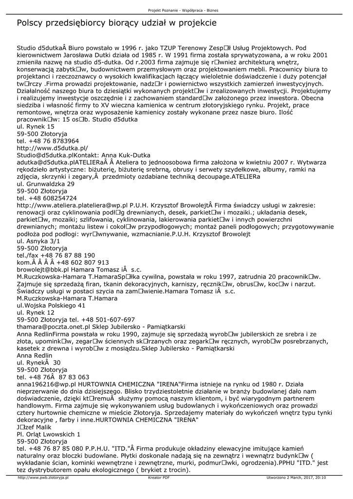 Projekt Poznanie - Współpraca - Biznes Polscy przedsiębiorcy biorący udział w projekcie Studio d5dutka Biuro powstało w 1996 r. jako TZUP Terenowy ZespÃłł Usług Projektowych. Pod kierownictwem Jarosława Dutki działa od 1985 r. W 1991 firma została sprywatyzowana, a w roku 2001 zmieniła nazwę na studio d5-dutka. Od r.2003 firma zajmuje się rÃłwnież architekturą wnętrz, konserwacją zabytkÃłw, budownictwem przemysłowym oraz projektowaniem mebli. Pracownicy biura to projektanci i rzeczoznawcy o wysokich kwalifikacjach łączący wieloletnie doświadczenie i duży potencjał twÃłrczy .Firma prowadzi projektowanie, nadzÃłr i powiernictwo wszystkich zamierzeń inwestycyjnych. Działalność naszego biura to dziesiątki wykonanych projektÃłw i zrealizowanych inwestycji. Projektujemy i realizujemy inwestycje oszczędnie i z zachowaniem standardÃłw założonego przez inwestora. Obecna siedziba i własność firmy to XV wieczna kamienica w centrum złotoryjskiego rynku. Projekt, prace remontowe, wnętrza oraz wyposażenie kamienicy zostały wykonane przez nasze biuro. Ilość pracownikÃłw: 15 osÃłb. Studio d5dutka ul. Rynek 15 59-500 Złotoryja tel. +48 76 8783964 http://www.d5dutka.pl/ [email protected]: Anna Kuk-Dutka [email protected]  Ateliera to jednoosobowa firma założona w kwietniu 2007 r. Wytwarza rękodzieło artystyczne: biżuterię, biżuterię srebrną, obrusy i serwety szydełkowe, albumy, ramki na zdjęcia, skrzynki i zegary, przedmioty ozdabiane techniką decoupage.ATELIERa ul. Grunwaldzka 29 59-500 Złotoryja tel. +48 608254724 http://[email protected] P.U.H. Krzysztof Browolejt Firma świadczy usługi w zakresie: renowacji oraz cyklinowania podłÃłg drewnianych, desek, parkietÃłw i mozaiki.; układania desek, parkietÃłw, mozaiki; szlifowania, cyklinowania, lakierowania parkietÃłw i innych powierzchni drewnianych; montażu listew i cokołÃłw przypodłogowych; montaż paneli podłogowych; przygotowywanie podłoża pod podłogi: wyrÃłwnywanie, wzmacnianie.P.U.H. Krzysztof Browolejt ul. Asnyka 3/1 59-500 Złotoryja tel./fax +48 76 87 88 190 kom.    +48 602 807 913 [email protected] Hamara Tomasz i s.c. M.Ruczkowska-Hamara T.HamaraSpÃłłka cywilna, powstała w roku 1997, zatrudnia 20 pracownikÃłw. Zajmuje się sprzedażą firan, tkanin dekoracyjnych, karniszy, ręcznikÃłw, obrusÃłw, kocÃłw i narzut. Świadczy usługi w postaci szycia na zamÃłwienie.Hamara Tomasz i s.c. M.Ruczkowska-Hamara T.Hamara ul.Wojska Polskiego 41 ul. Rynek 12 59-500 Złotoryja tel. +48 501-607-697 [email protected] Sklep Jubilersko - Pamiątkarski Anna RedlinFirma powstała w roku 1990, zajmuje się sprzedażą wyrobÃłw jubilerskich ze srebra i ze złota, upominkÃłw, zegarÃłw ściennych skÃłrzanych oraz zegarkÃłw ręcznych, wyrobÃłw posrebrzanych, kasetek z drewna i wyrobÃłw z mosiądzu.Sklep Jubilersko - Pamiątkarski Anna Redlin ul. Rynek 30 59-500 Złotoryja tel. +48 76 87 83 063 [email protected] HURTOWNIA CHEMICZNA "IRENA"Firma istnieje na rynku od 1980 r. Działa nieprzerwanie do dnia dzisiejszego. Blisko trzydziestoletnie działanie w branży budowlanej dało nam doświadczenie, dzięki ktÃłremu służymy pomocą naszym klientom, i być wiarygodnym partnerem handlowym. Firma zajmuje się wykonywaniem usług budowlanych i wykończeniowych oraz prowadzi cztery hurtownie chemiczne w mieście Złotoryja. Sprzedajemy materiały do wykończeń wnętrz typu tynki dekoracyjne , farby i inne.HURTOWNIA CHEMICZNA "IRENA" JÃłzef Malik Pl. Orląt Lwowskich 1 59-500 Złotoryja tel. +48 76 87 85 080 P.P.H.U. "ITD." Firma produkuje okładziny elewacyjne imitujące kamień naturalny oraz bloczki budowlane. Płytki doskonale nadają się na zewnątrz i wewnątrz budynkÃłw ( wykładanie ścian, kominki wewnętrzne i zewnętrzne, murki, podmurÃłwki, ogrodzenia).PPHU "ITD." jest tez dystrybutorem opału ekologicznego ( brykiet z trocin). http://www.pwb.zlotoryja.pl Kreator PDF Utworzono 2 March, 2017, 20:10 Projekt Poznanie - Współpraca - Biznes Aktualnie produkujemy okładziny elewacyjne imitujące kamień naturalny w następujących rozmiarach: 35x20 cm; 25x20 cm; 35x10 cm 25 x10 cm i 20 x10 cm. "ITD." produkuje także bloczki fundamentowe z wibroprasy w następujących rozmiarach : 38x25x12 cm i 38x25x14 cm.P.P.H.U. "ITD." Iwona Ćmikiewicz-Wolska ul. Hoża 50 59-500 ZłotoryjaZakład Produkcyjny: ul. Chojnowska 16 59-500 Złotoryja tel. +48 76 878 17 84, +48 697 290 159, +48 607 596 476 Pracownia plastyczna "PUNAART"Pracownia plastyczna -przedsiębiorstwo jednoosobowe powstało w 2000 r. Firma wytwarza rękodzieło artystyczne typu: bombki, wazony, malarstwo, pastele, i inne wyroby szklane. Firma własnoręcznie wykonuje dekorowanie ozdÃłb szklanych, z możliwością wykonania dedykacji na każdej ozdobie.Pracownia plastyczna "PUNA-ART" ul. Wyszyńskiego 6/5 59-500 Złotoryja tel. +48 665 826 000, +48 607 099 476 http://www.punaart.pl/ [email protected] Skarby NaturySklep SKARBY NATURY prowadzi sprzedaż najlepszych gatunkÃłw herbat i kawy na wagę oraz akcesoria do zaparzania kawy i herbaty. Posiadamy rÃłwnież w ofercie sprzedaży chińską porcelanę użytkową, oraz autorskie wyroby bizuterii z kamieni pÃłłszlachetnych w srebrze. W ramach propagowania zdrowego stylu życia oferujemy także żywność ekologiczną oraz wysokiej klasy suplementy diety dostępne na terenie całej UE.Skarby Natury ul. Piłsudskiego 13 59-500 Złotoryja tel. +48 607 706 513 [email protected] Przedsiębiorstwo Obrotu Artykułami Rolnymi SpÃłłka Jawna Centrum Ogrodniczo-Rolnicze POAR w Złotoryi istnieje od 1996 roku. W pierwszych latach firma zajmowała się obrotem artykułami rolnymi i skupem zboża. Wychodząc naprzeciw klientowi otworzyliśmy kolejny dział-części do maszyn i urządzeń rolniczych, a głÃłwnym dostawcą jest firma Grene, z ktÃłrą wspÃłłpracujemy do dziś. Z czasem nasza firma powiększyła swoją p