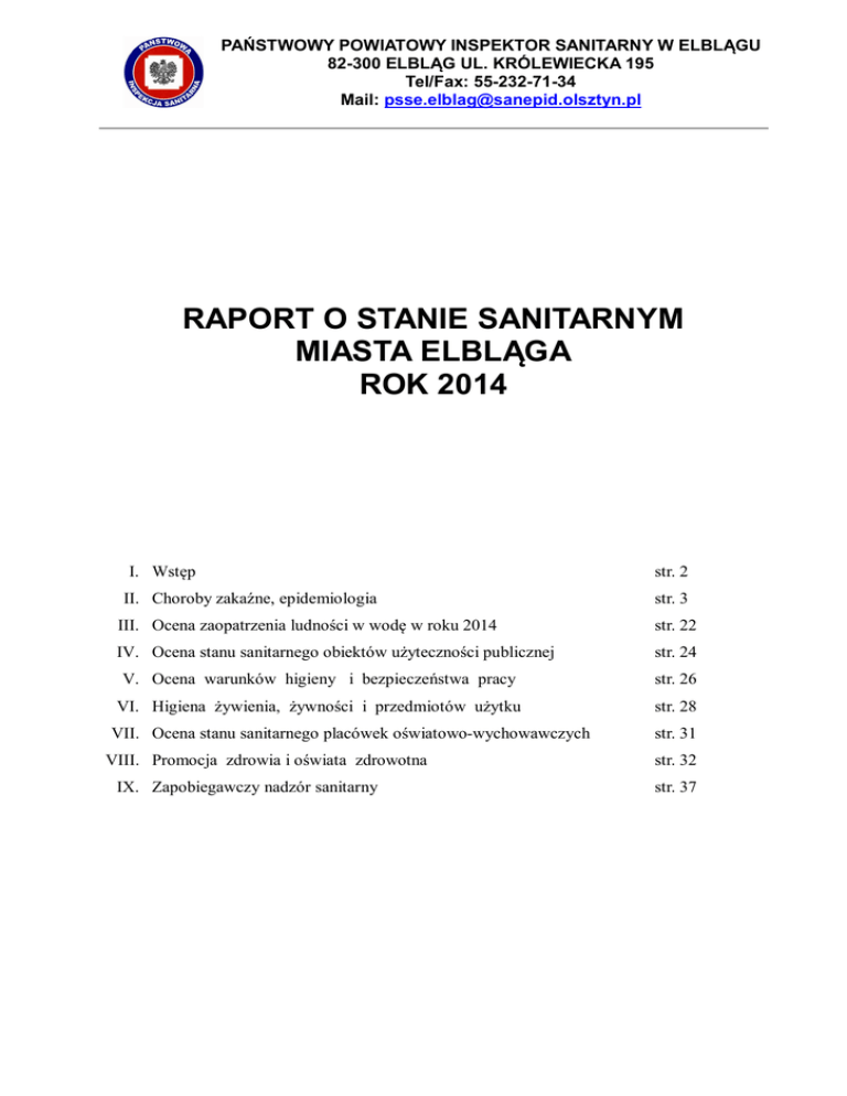 PAŃSTWOWY POWIATOWY INSPEKTOR SANITARNY W ELBLĄGU 82-300 ELBLĄG UL. KRÓLEWIECKA 195 Tel/Fax: 55-232-71-34 Mail: [email protected] RAPORT O STANIE SANITARNYM MIASTA ELBLĄGA ROK 2014 I. Wstęp II. Choroby zakaźne, epidemiologia str. 2 str. 3 III. Ocena zaopatrzenia ludności w wodę w roku 2014 str. 22 IV. Ocena stanu sanitarnego obiektów użyteczności publicznej str. 24 V. Ocena warunków higieny i bezpieczeństwa pracy str. 26 VI. Higiena żywienia, żywności i przedmiotów użytku str. 28 VII. Ocena stanu sanitarnego placówek oświatowo-wychowawczych VIII. Promocja zdrowia i oświata zdrowotna IX. Zapobiegawczy nadzór sanitarny str. 31 str. 32 str. 37 I. WSTĘP Państwowy Powiatowy Inspektor Sanitarny w Elblągu realizował w roku 2014 swoje zadania na terenie Miasta Elbląga na podstawie rocznego planu pracy, wynikającego z zakresu zadań ustawowych wykonywanych przez organy Państwowej Inspekcji Sanitarnej. Niezależnie od tych działań, znaczny udział w czynnościach podejmowanych przez PPIS w roku 2014 miały także nieplanowane działania doraźne, wynikające z potrzeb bieżących, mieszczące się w kompetencjach PIS. Szeroko rozumiany stan sanitarny Miasta można ocenić jako dobry. Był to kolejny okres, w którym zdecydowana większość potencjalnych zagrożeń sanitarnoepidemiologicznych, mierzona wskaźnikami epidemiologicznymi i innymi danymi w ujęciu statystycznym, utrzymywała się osiągniętym już w latach ubiegłych, akceptowalnym poziomie. Wyniki kontroli sanitarnych przeprowadzanych w roku 2014, wykazały postępującą poprawę standardów technicznych mających wpływ na bezpieczeństwo sanitarne (zdrowotne). Kontynuowano wcześniej zainicjowane działania oświatowo-promocyjne, mające na celu wzrost poziomu wiedzy ludności, dotyczącej zdrowia i jego zależności od własnej świadomości i dbałości o te zdrowie, a także podejmowano nowe. Szczegółowa charakterystyka zjawisk i przyczyn składających się na ocenę stanu sanitarnego została zawarta w poniższej analizie. Strona: 2 II. CHOROBY ZAKAŹNE, EPIDEMIOLOGIA Epidemiologia w ujęciu praktycznym zajmuje się zjawiskami zachodzącymi w ogólnej sytuacji zdrowotnej społeczeństwa, diagnozowaniem tego stanu poprzez ustalanie przyczyn i stawianie prognoz z uwzględnieniem zmieniających się uwarunkowań i zależności. W zakresie chorób zakaźnych i zakażeń, faktyczny obraz sytuacji epidemiologicznej zależny jest od stopnia dostępu do reprezentatywnych i pełnych danych, a w szczególności od rzetelności i terminowości przekazywanych do organów PIS zgłoszeń podejrzeń lub rozpoznań chorób i zakażeń oraz informacji o wykryciu czynników chorobotwórczych, dokonywanych przez lekarzy, a także przez pracowników laboratoriów mikrobiologicznych i analitycznych, Reprezentatywność tego obrazu, a co za tym idzie prawidłowość dokonywanych ocen epidemiologicznych oraz celowość i skuteczność planowanych i realizowanych działań, zależą od wielu czynników. Poza wspomnianą rzetelnością i terminowością zgłoszeń istotne znaczenie ma zakres stosowanej diagnostyki laboratoryjnej, wynikającej z aktualnego stanu wiedzy i techniki diagnostycznej, stopień wykorzystania przez lekarzy istniejących możliwości badań (chęć do zlecania diagnostyki laboratoryjnej), a także treść regulacji prawnych w tym zakresie. Wprowadzanie nowych technik laboratoryjnych, pozwalających identyfikować czynniki chorobotwórcze lub stany chorobowe, które dotychczas nie były rozpoznawane, wdrażanie nowej wiedzy z zakresu etiologii chorób lub mikrobiologii, wcielanie w życie nowych doktryn wynikających z postępu nauki, a także, co równie istotne, dostęp do środków finansowych, umożliwiających skorzystanie z diagnostyki laboratoryjnej, decydują o prawidłowym i odpowiednio wczesnym rozpoznaniu zagrożeń oraz o podjęciu skutecznych działań przeciw szerzeniu się tych zagrożeń. Podstawą działań podejmowanych przez Państwowego Powiatowego Inspektora Sanitarnego w Elblągu w roku 2014 były zgłoszenia o podejrzeniach lub rozpoznanych przypadkach chorób zakaźnych i zakażeń oraz zgłoszenia dodatnich wyników badań laboratoryjnych w kierunku zakaźnych czynników chorobotwórczych (efekty tego monitoringu przedstawia tabela Nr 1). Uzyskane w ten sposób informacje były podstawą do działań przeciwepidemicznych, podejmowanych przez PPIS bezzwłocznie po ich otrzymaniu. Działania te polegały przede wszystkim na ustalaniu źródeł zakażeń i chorób, mechanizmów, które umożliwiły transmisję czynników chorobotwórczych (przeniesienia na zdrowego dotąd człowieka lub na element pośredni w łańcuch epidemicznym), dróg którymi się przenosiły, a także ustalenie innych osób, które były narażone na zachorowanie lub zakażenie (tzw. osoby z kontaktu). Ostatecznym celem dochodzeń było zapobieżenie rozprzestrzenianiu się chorobie, możliwie szybkie objęcie osób zakażonych i chorych skuteczną opieką medyczną, objęcie nadzorem epidemiologicznym i lekarskim osób narażonych na zakażenie, wykonanie szczepień ochronnych, uniemożliwienie kontaktu zawodowego osób chorych i zakażonych z innymi osobami wrażliwym, a także likwidacja źródła zakażenia itp. W roku 2014, pracownicy PSSE w Elblągu, w ramach działań przeciwepidemicznych, przeprowadzili 615 wywiadów epidemiologicznych z osobami zakażonymi, chorymi lub podejrzanymi o zachorowanie lub zakażenia. Czynności te dotyczyły przede wszystkim osób narażonych na zakażenie wirusem wścieklizny (po ryzykownych kontaktach ze zwierzętami), po infekcjach żołądkowo-jelitowych, dotkniętych zakażeniami ośrodkowego układu nerwowego (zapalenia mózgu i opon mózgowo-rdzeniowych), posocznicą, a także osób, u których potwierdzone zostały zakażenia wirusami wywołującymi zapalenia wątroby (wzw B i wzw C) oraz zakażenia przenoszone przez kleszcze. Strona: 3 1. Zachorowalnoś