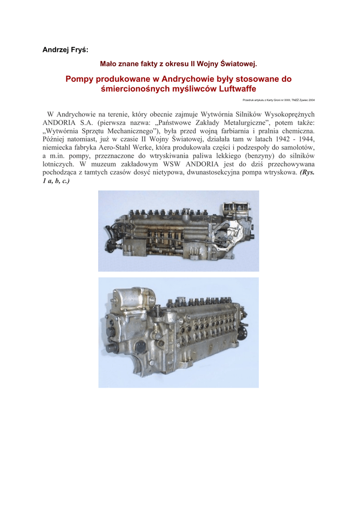 Andrzej Fryś: Mało znane fakty z okresu II Wojny Światowej. Pompy produkowane w Andrychowie były stosowane do śmiercionośnych myśliwców Luftwaffe Przedruk artykułu z Karty Groni nr XXIII, TMZŻ Zywiec 2004 W Andrychowie na terenie, który obecnie zajmuje Wytwórnia Silników Wysokoprężnych ANDORIA S.A. (pierwsza nazwa: „Państwowe Zakłady Metalurgiczne”, potem także: „Wytwórnia Sprzętu Mechanicznego”), była przed wojną farbiarnia i pralnia chemiczna. Później natomiast, już w czasie II Wojny Światowej, działała tam w latach 1942 - 1944, niemiecka fabryka Aero-Stahl Werke, która produkowała części i podzespoły do samolotów, a m.in. pompy, przeznaczone do wtryskiwania paliwa lekkiego (benzyny) do silników lotniczych. W muzeum zakładowym WSW ANDORIA jest do dziś przechowywana pochodząca z tamtych czasów dosyć nietypowa, dwunastosekcyjna pompa wtryskowa. (Rys. 1 a, b, c.) Pompa ta pełniła kiedyś rolę eksponatu dydaktycznego w przyfabrycznym Zespole Szkół Technicznych gdzie ktoś, chcąc bez rozbierania zaglądać do wnętrza pompy, wpadł na nienajlepszy niestety pomysł i częściowo powykrawał jej korpus. Takie właśnie pompy, produkowane w Andrychowie, użyte były w silnikach jednego z lepszych myśliwców niemieckiej Luftwaffe, samolotu Meserschmitt Me 110 (Bf 110). Potwierdzają to przede wszystkim wspomnienia mieszkających w Andrychowie (i nie tylko) byłych pracowników Aero-Stahl Werke (Rys.2a, b), ale także literatura [1], [2], [5]. Ponadto pośrednio fakt ten wynika z korespondencji prowadzonej w roku 1986 z firmą Daimler Benz A.G., producentem silników do myśliwca Me 110 (Rys. 3a, b, c). Firma Daimler Benz Informowała tam, że do silnika DB 601, napędzającego samolot Meserschmitt Me 110, stosowana była pompa wtryskowa PZ 12 HM 100/11, produkowana przez znaną specjalistyczną firmę Bosch G.m.b.H. ze Stuttgartu, ale z drugiej strony firmie D.B nie było nic wiadomo na temat Aero-Stahl Werke. Proste porównanie pomp przedstawionych na rysunkach 1 i 3c pozwala na wniosek, że chodzi tu o tę samą pompę. Rys. 2a, b: Przepustka do Aero-Stahl Werke P. Józefa Rychtera. (reprodukcje ze zbiorów J. Rychtera). Rys. 3a, b, c: Materiały na temat pompy wtryskowej do silnika DB601, stosowanego w myśliwcu Me 110, otrzymane od firmy DAIMLER-BENZ AG. Najprawdopodobniej wynika więc z tego, że Bosch G.m.b.H. udzielił firmie Aero-Stahl licencji na produkcję pompy PZ 12 HM 100/11, co w warunkach wojennych specjalnie dziwić nie może, ale świadczy dodatkowo o wysokim poziomie technicznym tej niewielkiej przecież fabryki. Oblatany w roku 1936 myśliwiec Meserschmitt Me 110 (Bf 110) 1 (Rys. 4) był, poczynając od wersji „D“, napędzany dwoma widlastymi, dwunastocylindrowymi, chłodzonymi cieczą silnikami Daimler Benz DB 601[2], skonstruowanymi pod kierunkiem dr Bergera. Rys. 4: Myśliwiec Luftwaffe Messerschmitt Me 110 (Bf 110) Silniki te (Rys. 5) wyróżniały się osobliwym układem konstrukcyjnym odwróconego "V", chętnie stosowanym w lotnictwie gdzie, szczególnie w przypadku maszyn jednosilnikowych, układ ten zapewniał dobrą widoczność z kabiny pilota. We wprowadzonej w 1942 roku wersji "G" samolotu, dzięki zastosowaniu doładowania turbosprężarką i bezpośredniego wtrysku benzyny do cylindrów, moc tego silnika wzrosła z 1070 KM do 1475 KM. Rys. 5: Przekrój poprzeczny skonstruowanego r. 1939 silnika lotniczego Daimler Benz DB601 A/B, stosowanego w myśliwcu Messerschmitt Me 110 (Wg [3]) Tak, więc silnik ten był, jak na lata 40-te ubiegłego stulecia, istnym cudem techniki. Trzeba tu, bowiem dodać, że w silnikach samochodów osobowych wtrysk paliwa lekkiego rozpowszechnił się w ostatnich latach XX wieku, a bezpośredni wtrysk benzyny do cylindrów (tzw. GDI, od angielskiego "Gasoline Direct Injection"). zaczyna być w nich seryjnie stosowany dopiero teraz. A przecież od roku 1942, gdy do produkcji wszedł Meserschmitt Me110 G-2 napędzany silnikami z takim wtryskiem, minęło już przeszło 60 lat!. W Muzeum Lotnictwa Polskiego w Krakowie można obejrzeć pochodzący z roku 1936 egzemplarz silnika Daimler Benz DB600G, bardzo podobny do opisywanego, który jednak w miejsce wtrysku paliwa był zasilany trójdyszowym gaźnikiem. W Muzeum podano ponadto informację, że łączna ilość wyprodukowanych silników serii DB600 wyniosła 2281 szt. Poza pompami do Meserschmittów fabryka Aero-Stahl Werke produkowała także pompy wtryskowe (Rys.6) służące do silnika BMW 801D2. Fakt produkcji w Andrychowie takiej pompy znalazł także wiarygodne potwierdzenie w rozmowach z byłymi pracownikami przymusowymi niemieckiej fabryki, oraz w referacie [5]. Budowany w układzie podwójnej gwiazdy 14-cylindrowy silnik BMW 801 napędzał 12 różnych typów samolotów, w tym także myśliwiec Luftwaffe Focke Wulf 190 F-3 (Rys. 7) i produkowany od lata 1942 r. myśliwiec Focke Wulf A-4. Posiadając niebagatelną moc startową 1730 KM, był on także silnikiem na wskroś nowoczesnym. Z dodatkowym urządzeniem, wtryskującym 50% mieszaninę wody i metanolu, rozwijał on moc chwilową 2100 KM, umożliwiając samolotowi Focke Wulf 190 A-4 osiąganie prędkości 700 km/godz., co stawiało ten samolot w rzędzie najszybszych na świecie myśliwców z silnikiem tłokowym. Łączna ilość silników BMW 801, jaką wyprodukowano, przekroczyła 20002 sztuk2, a jego egzemplarze można obejrzeć w Muzeum Lotnictwa Polskiego w Krakowie, a także w Muzeum BMW w Monachium. Rys. 6: Pompa wtryskowa do silnika BMW 801 D2, który napędzał myśliwiec Focke Wulf FW190 A4. wg [4] Rys. 7: Myśliwiec Luftwaffe Focke Wulf FW190 A4. Dzięki rozmowom z byłymi pracownikami Aero-Stahl Werke, a także z publikacji [8], dowiedziałem się ponadto wielu innych interesujących szczegółów, dotyczących tej fabryki. Właścicielem zakładu, zlokalizowanego pierwotnie w Porz-Urbach (obecnie przedmieście Kolonii), był Franz Josef Walter Schierberg, u